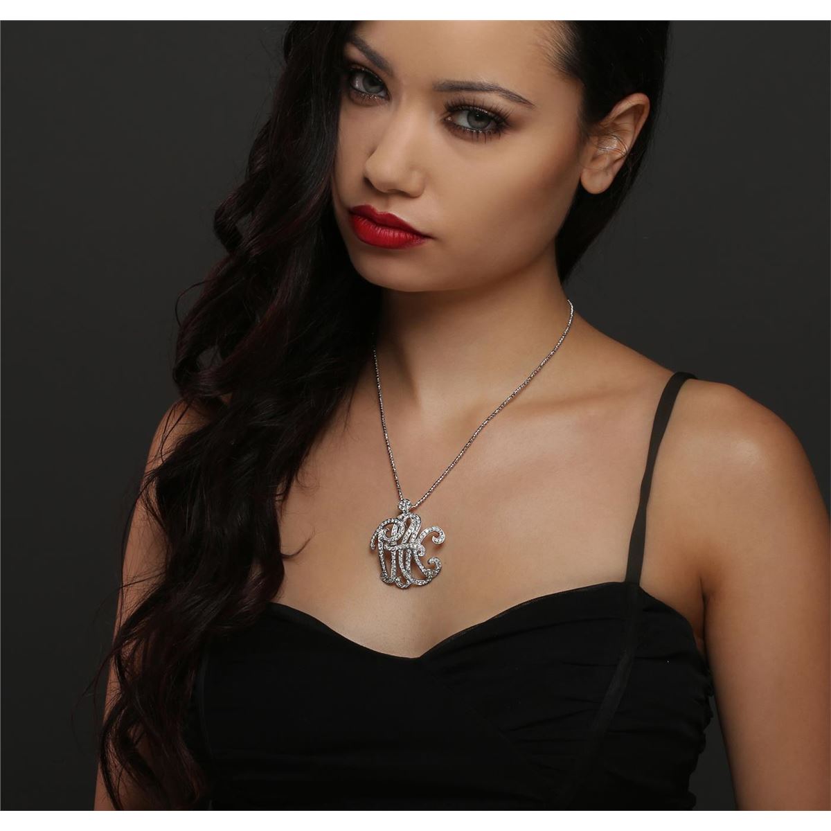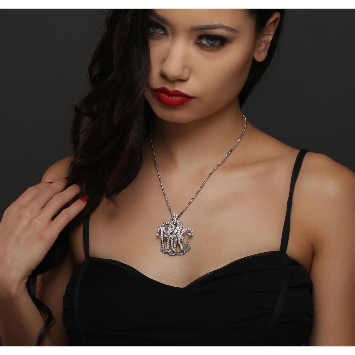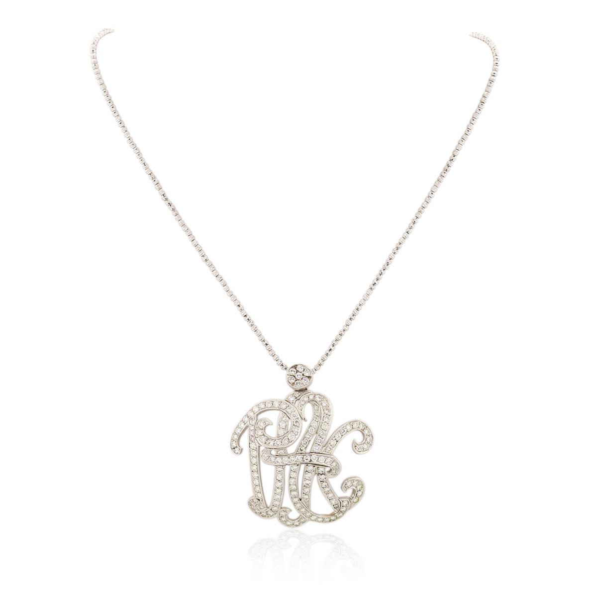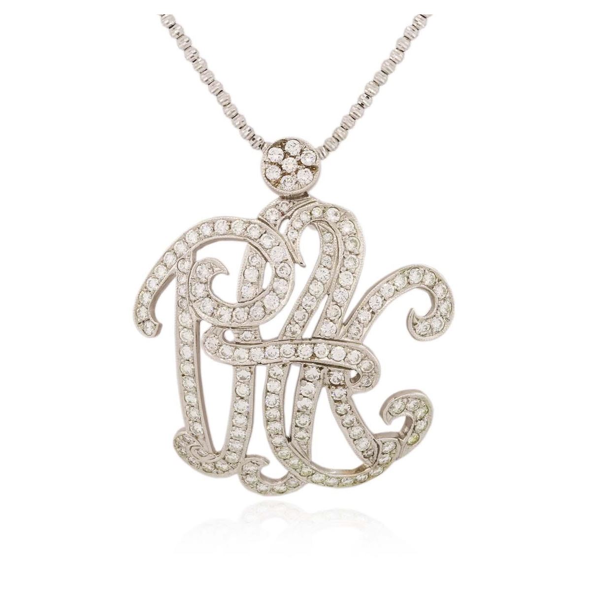 One electronically tested 14KT white gold ladies cast & assembled diamond monogram pendant with chain. The pendant features the work "PINK" in script lettering, completed by a diamond set bail. The pendant is supported by an eighteen inch length 14KT white gold designer style chain, terminating in a lobster claw clasp. Bright polish finish with milgrain detailing. Condition is good. Containing: One Hundred Forty-Three bead set round brilliant cut diamonds, measuring 2.10 - 1.95 x 1.22mm (depth est.) approximate total weight of 143 Stones = 4.50ct. Graded in the setting. Clarity: VS-1 to VS-2. Color: G - I. Total Weight of Diamonds 4.50ct. Total Weight of Monogram Pendant With Chain 18.94 grams. AIG Appraised at $19,430.00.