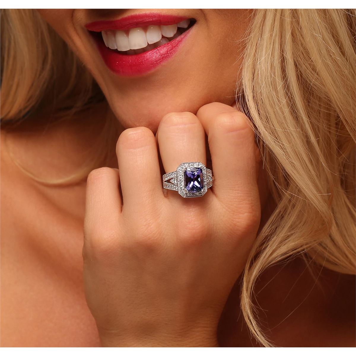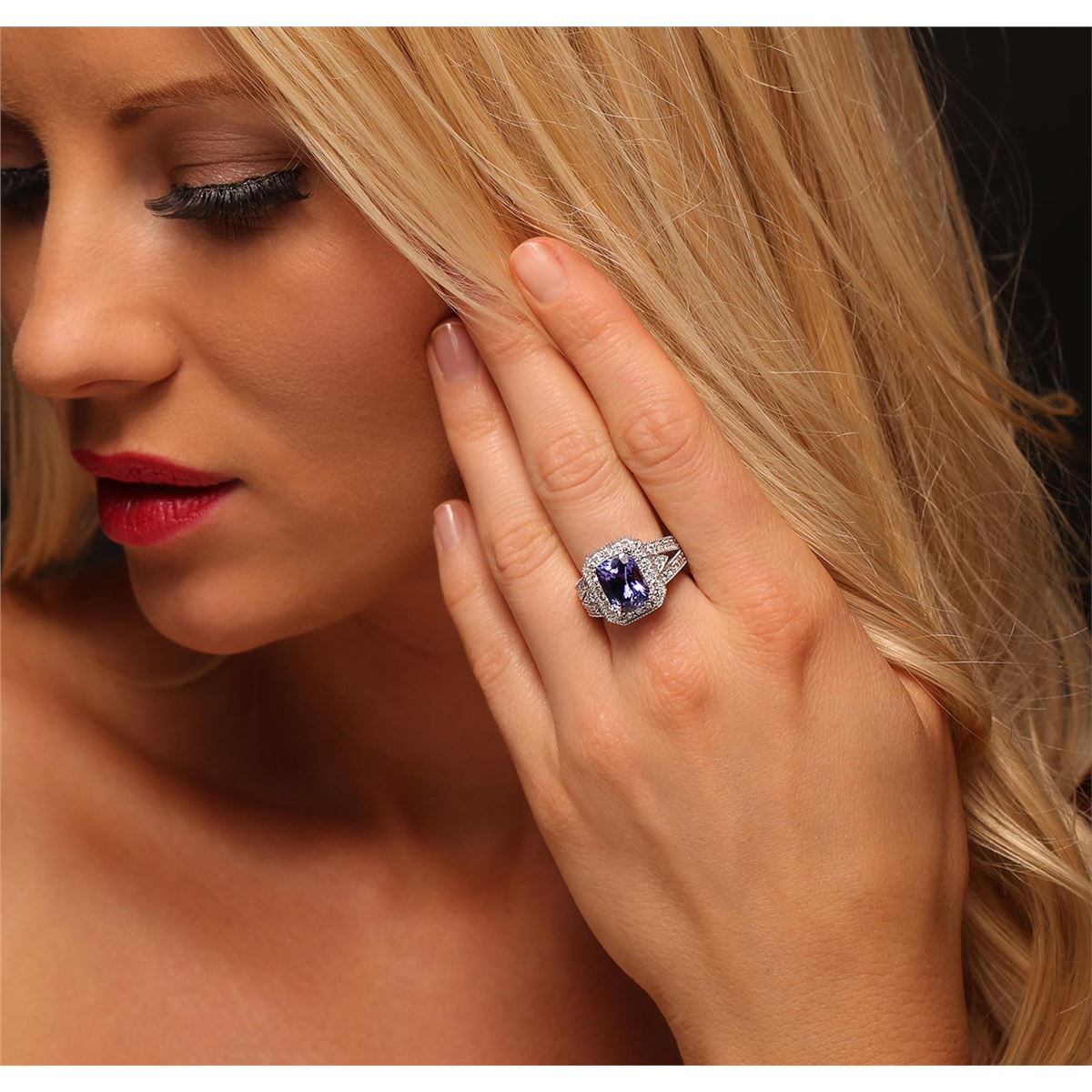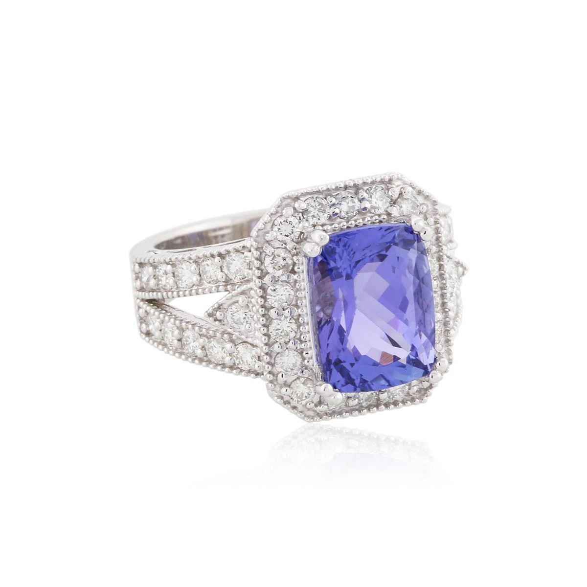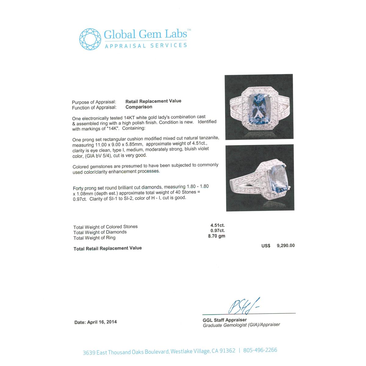 One electronically tested 14KT white gold Ladies combination cast & assembled ring with a high polish finish. Condition is new. Identified with markings of "14K". Containing: One prong set rectangular cushion modified mixed cut natural tanzanite, measuring 11.00 x 9.00 x 5.85mm, approximate weight of 4.51ct., clarity is eye clean, type I, medium, moderately strong, bluish violet color, (GIA bV 5/4), cut is very good. Colored gemstones are presumed to have been subjected to commonly used color/clarity enhancement processes. Forty prong set round brilliant cut diamonds, measuring 1.80 - 1.80 x 1.08mm (depth est.) approximate. Total Weight of 40 Stones = 0.97ct. Clarity: SI-1 to SI-2. Color: H - I, Cut is Good. Total Weight of Colored Stones 4.51ct. Total Weight of Diamonds 0.97ct. Total Weight of Ring 8.70 grams. GGL Appraised at $9,290.00.