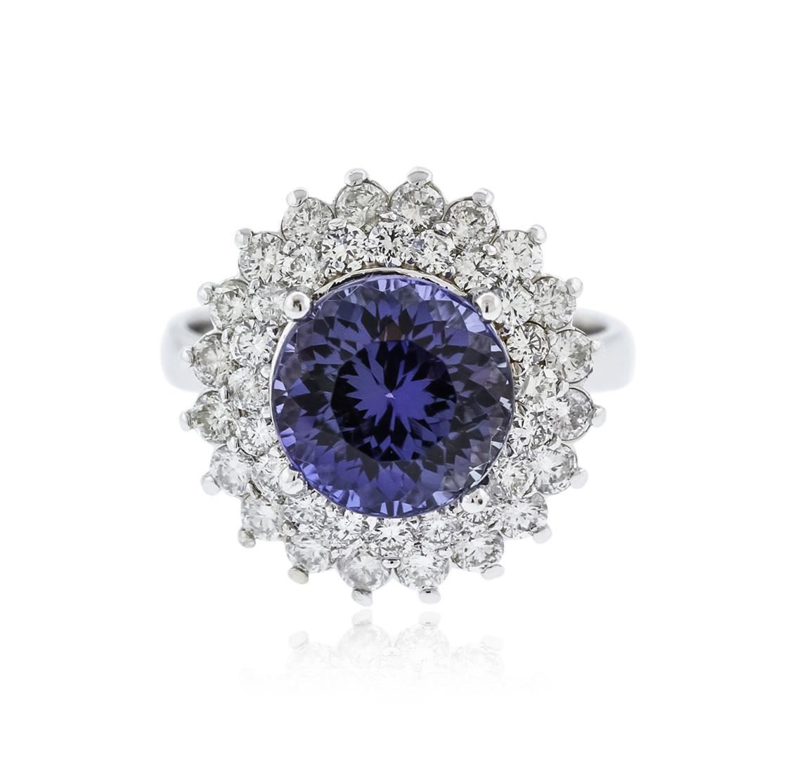 One electronically tested 14KT white gold ladies cast tanzanite and diamond ring with a bright polish finish. Identified with markings of "14K". Condition is new. Containing: One prong set round modified brilliant cut natural tanzanite, measuring 9.32 - 9.26 x 7.75 mm, approximate weight of 4.51ct., clarity is eye clean, type I, medium light, very slightly grayish, bluish violet color, (GIA bV 4/3), cut is good. Forty prong set round brilliant cut diamonds, measuring 2.00 - 1.80 x 1.14mm (depth est.) approximate total weight of 40 Stones = 1.00ct. Clarity: SI-1 to SI-2. Color: I - J, Cut is Good. Colored gemstones are presumed to have been subjected to commonly used enhancement processes. All diamonds and colored gemstones are graded in the mounting, unless otherwise stated. Total Weight of Colored Stones 4.51ct. Total Weight of Diamonds 1.00ct. Total Weight of Ring 6.70 grams. GGL Appraised at $5,520.00.