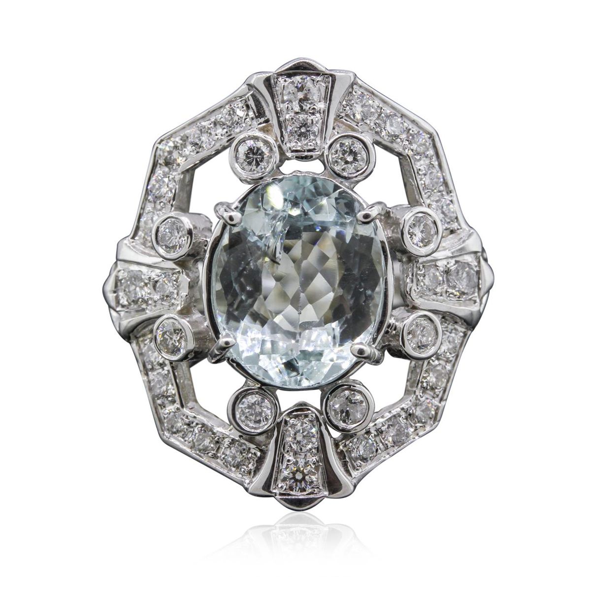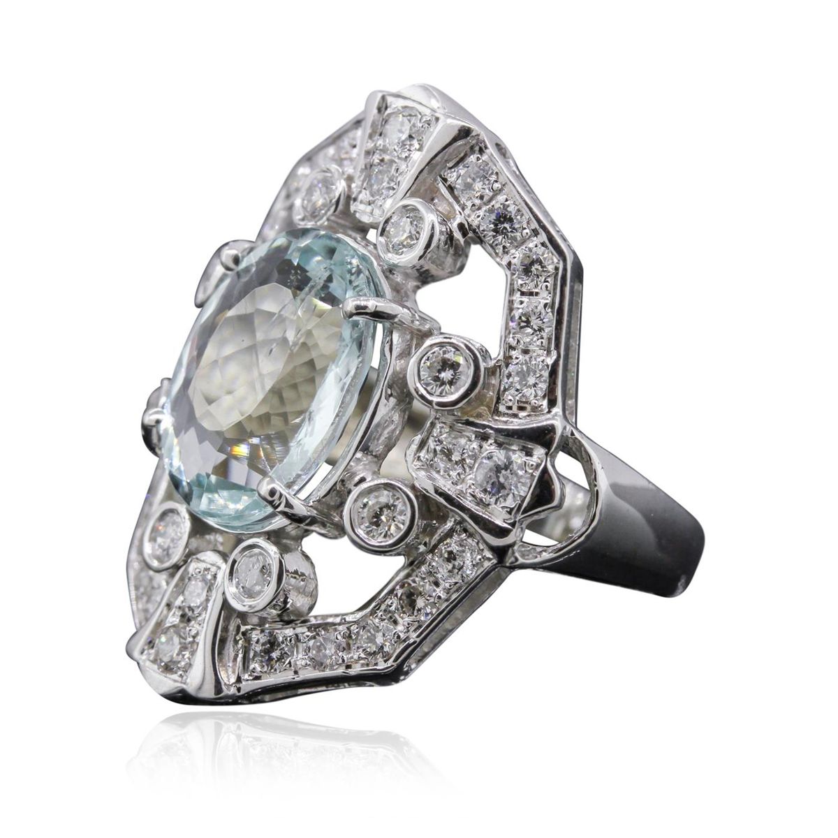 One electronically tested 14KT white gold ladies cast aquamarine and diamond ring with a bright polish finish. Condition is new, good workmanship. The featured aquamarine is set within a diamond lattice gallery, completed by a two and one-half millimeter wide band. Containing: One prong set oval mixed cut natural aquamarine, measuring 12.85 x 10.15 x 5.80mm, 8%. bulge factor, approximate weight of 4.51ct., clarity is slightly included, type I, medium light, very slightly grayish, very strongly greenish blue color, (GIA vstgB 4/3), cut is good. Transmitting light with no distortion, transparent. Graded in the setting. Thirty-Six bead & bezel set round brilliant cut diamonds, measuring 2.30 - 1.90 x 1.26mm (depth est.) approximate. Total Weight of 36 Stones = 1.32ct. Graded in the setting. Clarity: SI-2 to I-1. Color: I - K. Total Weight of Colored Stones 4.51ct. Total Weight of Diamonds 1.32ct. Total Weight of Ring 9.20 grams. AIG Appraised at $6,000.00.
