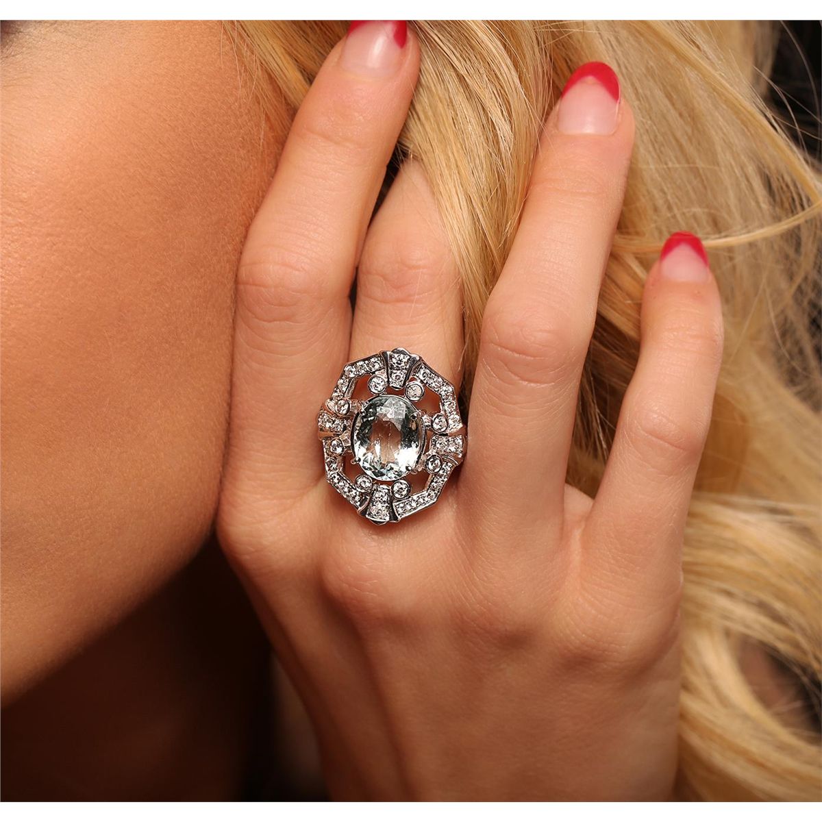 One electronically tested 14KT white gold ladies cast aquamarine and diamond ring with a bright polish finish. Condition is new, good workmanship. The featured aquamarine is set within a diamond lattice gallery, completed by a two and one-half millimeter wide band. Containing: One prong set oval mixed cut natural aquamarine, measuring 12.85 x 10.15 x 5.80mm, 8%. bulge factor, approximate weight of 4.51ct., clarity is slightly included, type I, medium light, very slightly grayish, very strongly greenish blue color, (GIA vstgB 4/3), cut is good. Transmitting light with no distortion, transparent. Graded in the setting. Thirty-Six bead & bezel set round brilliant cut diamonds, measuring 2.30 - 1.90 x 1.26mm (depth est.) approximate. Total Weight of 36 Stones = 1.32ct. Graded in the setting. Clarity: SI-2 to I-1. Color: I - K. Total Weight of Colored Stones 4.51ct. Total Weight of Diamonds 1.32ct. Total Weight of Ring 9.20 grams. AIG Appraised at $6,000.00.