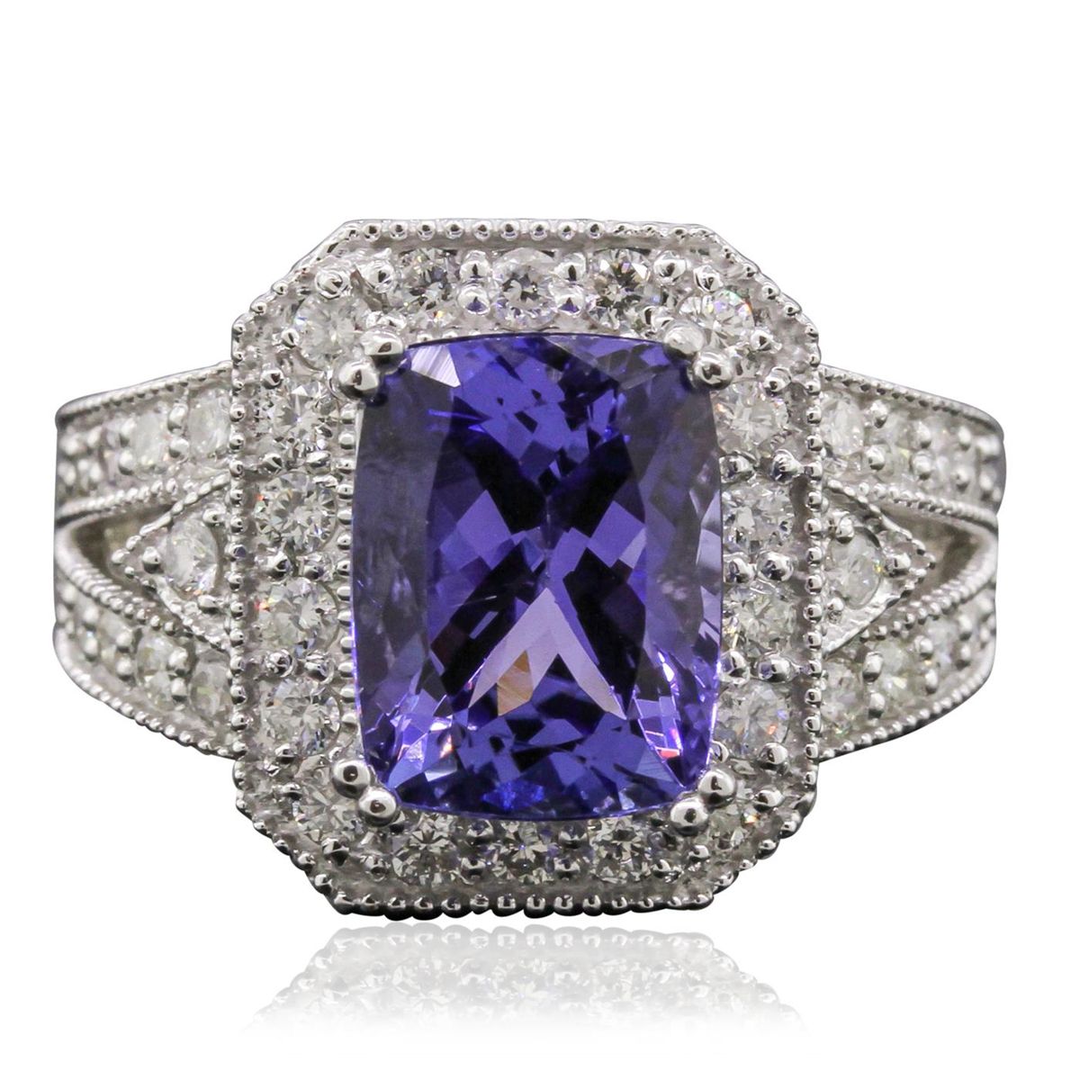 One electronically tested 14KT white gold Ladies combination cast & assembled ring with a high polish finish. Condition is new. Identified with markings of "14K". Containing: One prong set rectangular cushion modified mixed cut natural tanzanite, measuring 11.00 x 9.00 x 5.85mm, approximate weight of 4.51ct., clarity is eye clean, type I, medium, moderately strong, bluish violet color, (GIA bV 5/4), cut is very good. Colored gemstones are presumed to have been subjected to commonly used color/clarity enhancement processes. Forty prong set round brilliant cut diamonds, measuring 1.80 - 1.80 x 1.08mm (depth est.) approximate. Total Weight of 40 Stones = 0.97ct. Clarity: SI-1 to SI-2. Color: H - I, Cut is Good. Total Weight of Colored Stones 4.51ct. Total Weight of Diamonds 0.97ct. Total Weight of Ring 8.70 grams. GGL Appraised at $9,290.00.