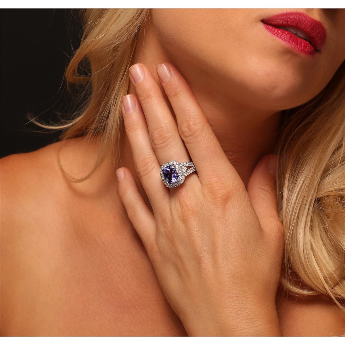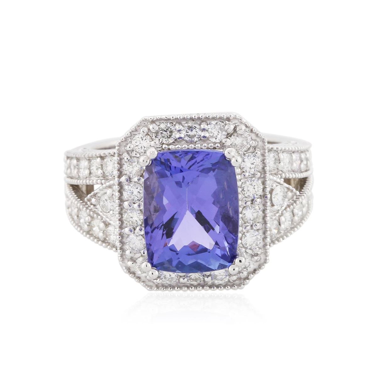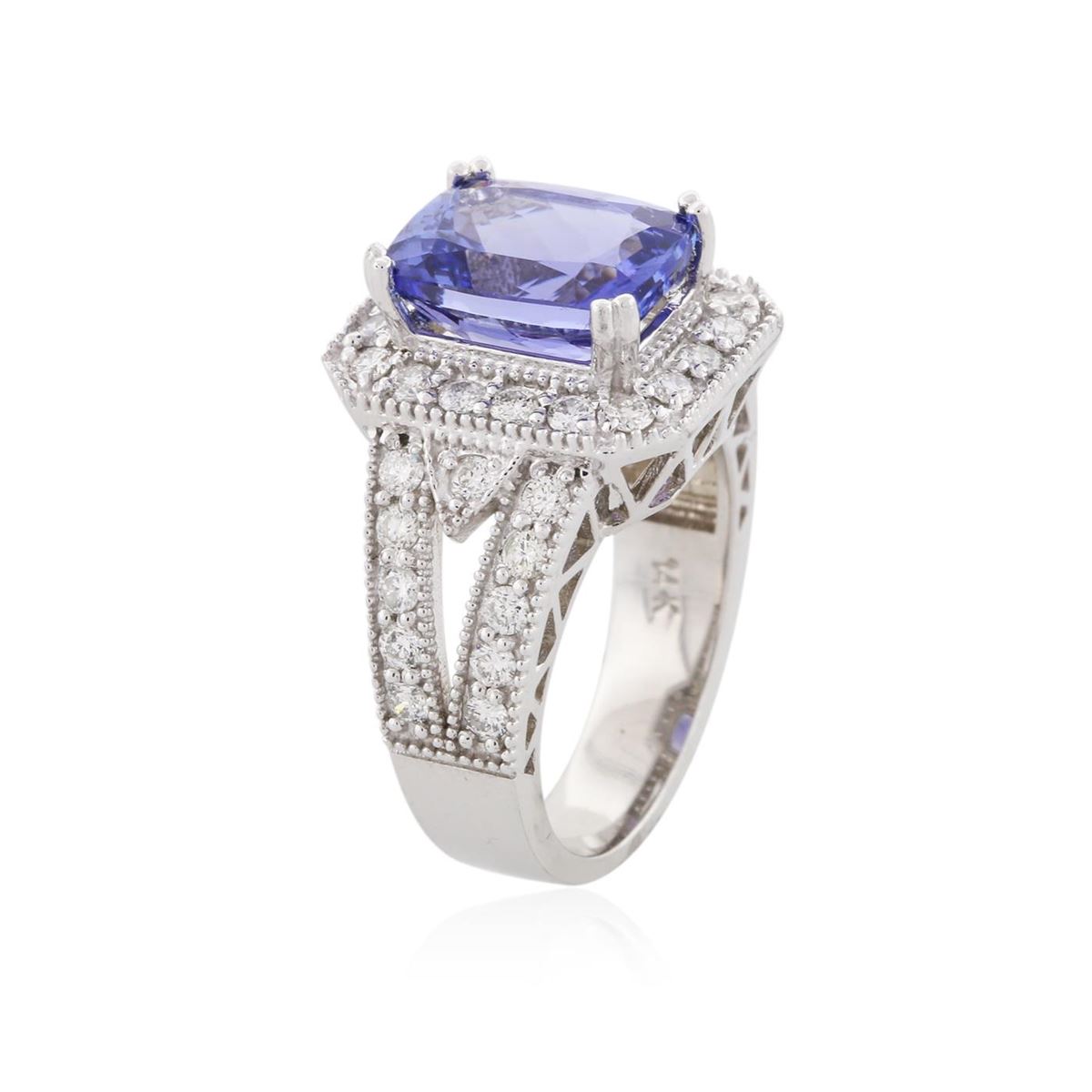 One electronically tested 14KT white gold Ladies combination cast & assembled ring with a high polish finish. Condition is new. Identified with markings of "14K". Containing: One prong set rectangular cushion modified mixed cut natural tanzanite, measuring 11.00 x 9.00 x 5.85mm, approximate weight of 4.51ct., clarity is eye clean, type I, medium, moderately strong, bluish violet color, (GIA bV 5/4), cut is very good. Colored gemstones are presumed to have been subjected to commonly used color/clarity enhancement processes. Forty prong set round brilliant cut diamonds, measuring 1.80 - 1.80 x 1.08mm (depth est.) approximate. Total Weight of 40 Stones = 0.97ct. Clarity: SI-1 to SI-2. Color: H - I, Cut is Good. Total Weight of Colored Stones 4.51ct. Total Weight of Diamonds 0.97ct. Total Weight of Ring 8.70 grams. GGL Appraised at $9,290.00.