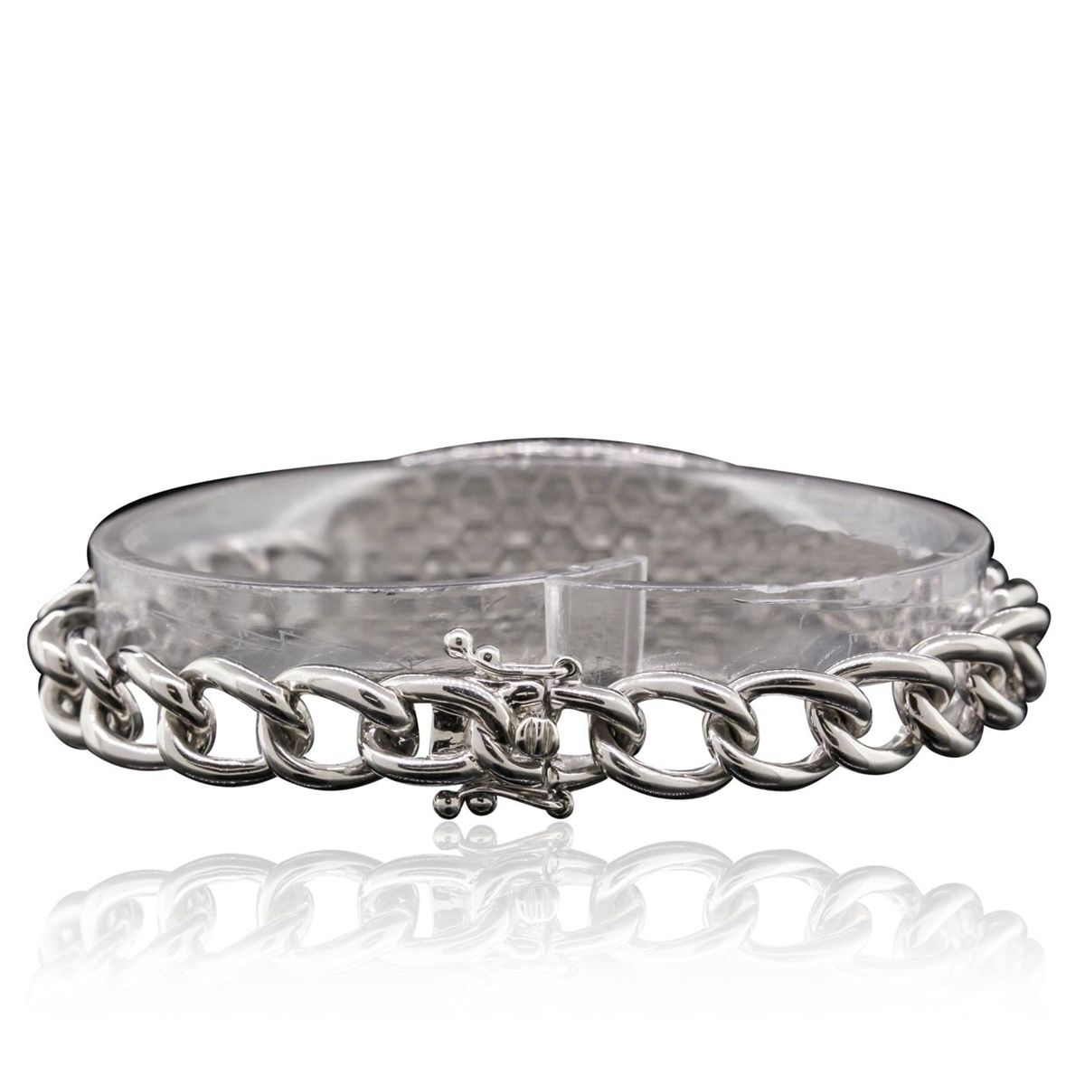 One electronically tested 14KT white gold ladies cast & assembled diamond bracelet with a bright polish finish. Condition is new, good workmanship. Seven inch length bracelet features a diamond set plaque supported by a curb link style chain, terminating in a concealed clasp with twin safeties. Trademark is CJ. Identified with markings of "14K". Containing: One Hundred Ninety-Two pave set round brilliant cut diamonds, measuring 2.00 - 1.70 x 1.11mm (depth est.) approximate total weight of 192 Stones = 4.53ct. Graded in the setting. Clarity SI-2 to I-2. Color F - H. Total Weight of Diamonds 4.53 ct. Total Weight of Bracelet 22.47 grams. AIG Appraised at $17,175.00.