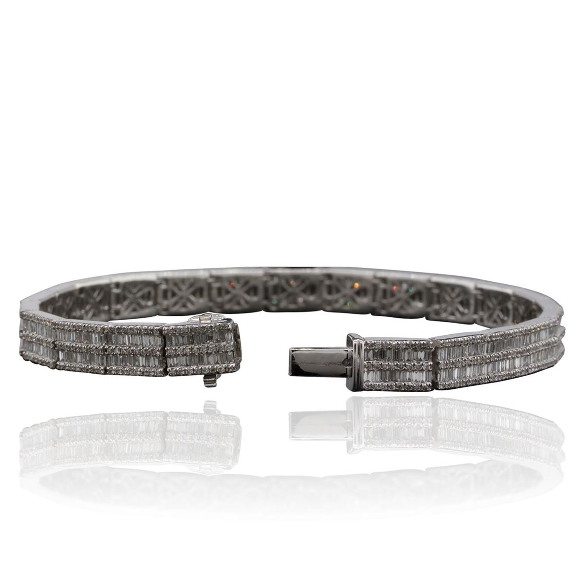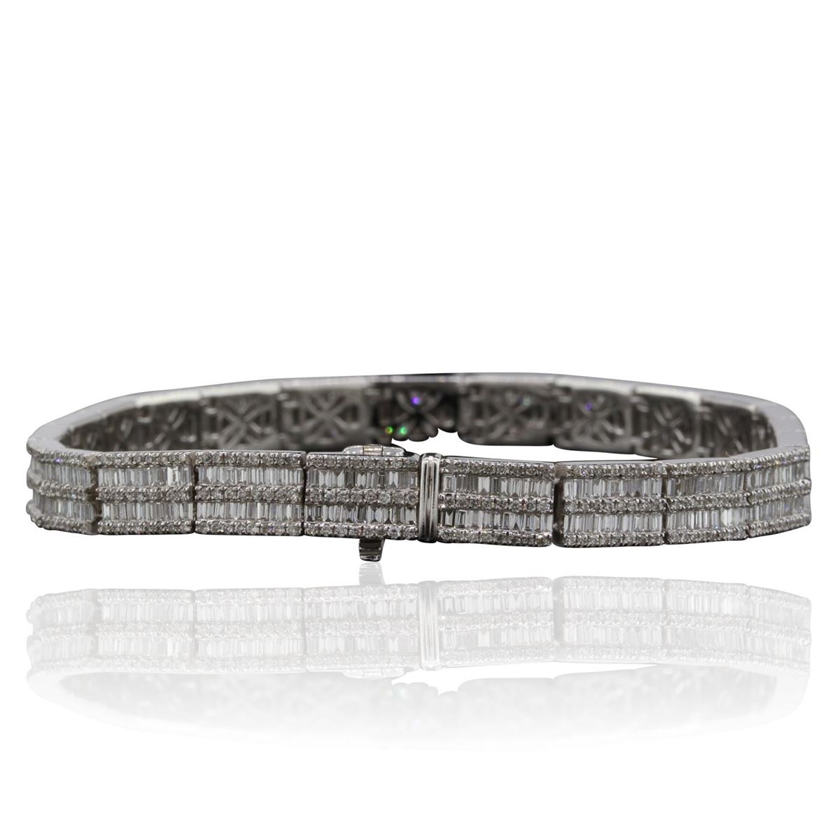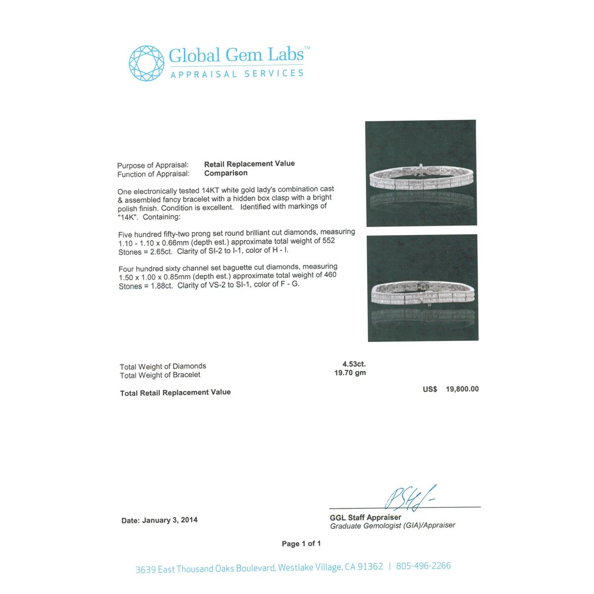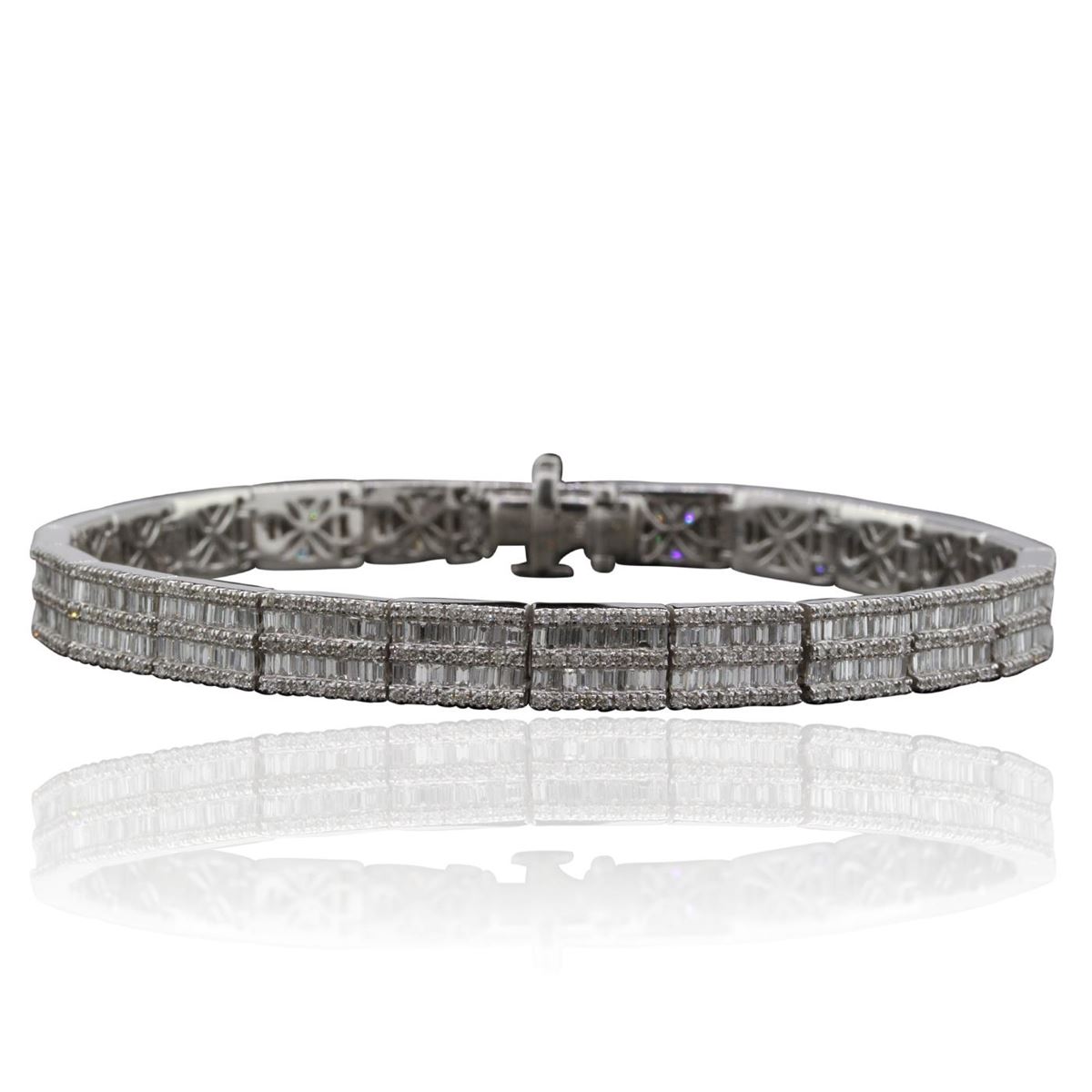 One electronically tested 14KT white gold Ladies combination cast & assembled fancy bracelet with a hidden box clasp with a bright polish finish. Identified with markings of "14K". Condition is excellent. Containing: Five Hundred Fifty-Two prong set round brilliant cut diamonds, measuring 1.10 - 1.10 x 0.66mm (depth est.) approximate total weight of 552 Stones = 2.65ct. Clarity of SI-2 to I-1, Color of H - I. Four Hundred Sixty channel set baguette cut diamonds, measuring 1.50 x 1.00 x 0.85mm (depth est.) approximate total weight of 460 Stones = 1.88ct. Clarity of VS-2 to SI-1, Color of F - G. Total Weight of Diamonds 4.53ct. Total Weight of Bracelet 19.70gm. GGL Appraised at $19,800.00.