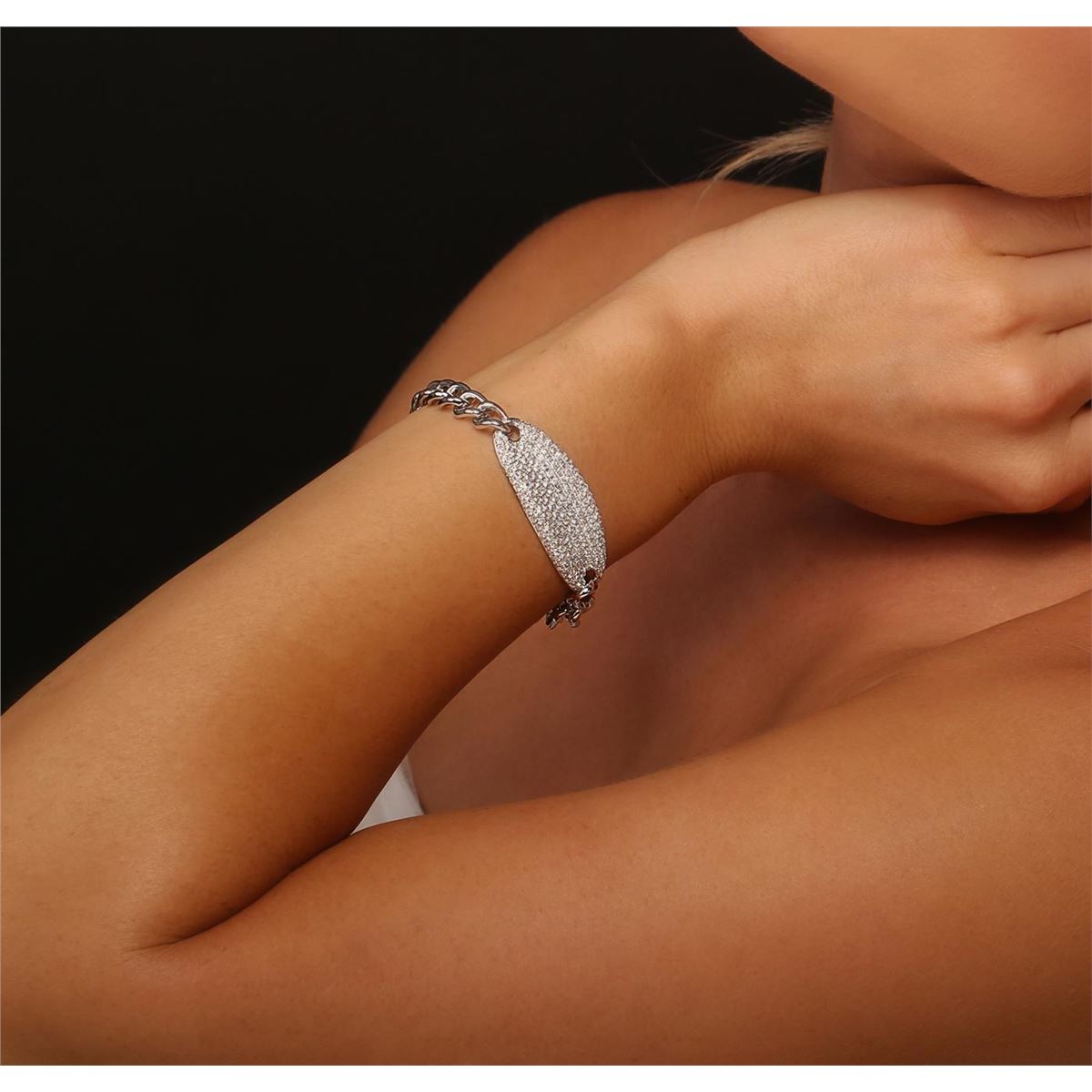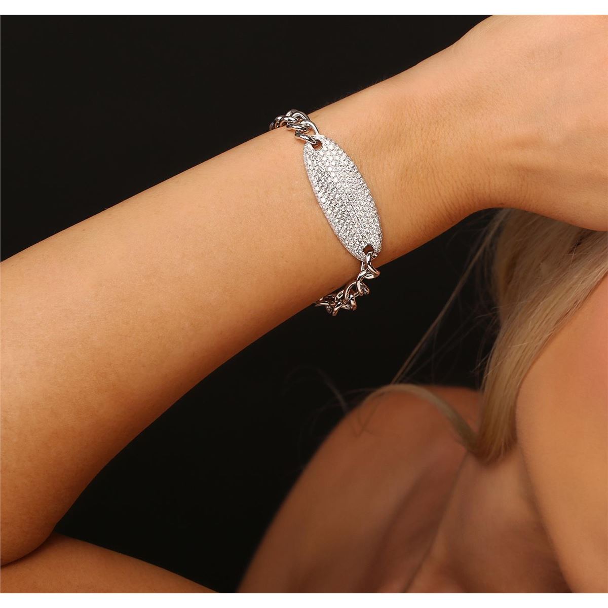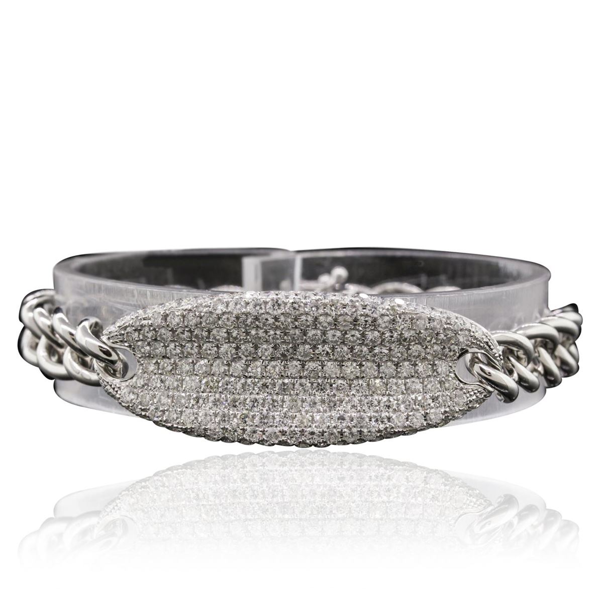 One electronically tested 14KT white gold ladies cast & assembled diamond bracelet with a bright polish finish. Condition is new, good workmanship. Seven inch length bracelet features a diamond set plaque supported by a curb link style chain, terminating in a concealed clasp with twin safeties. Trademark is CJ. Identified with markings of "14K". Containing: One Hundred Ninety-Two pave set round brilliant cut diamonds, measuring 2.00 - 1.70 x 1.11mm (depth est.) approximate total weight of 192 Stones = 4.53ct. Graded in the setting. Clarity SI-2 to I-2. Color F - H. Total Weight of Diamonds 4.53 ct. Total Weight of Bracelet 22.47 grams. AIG Appraised at $17,175.00.