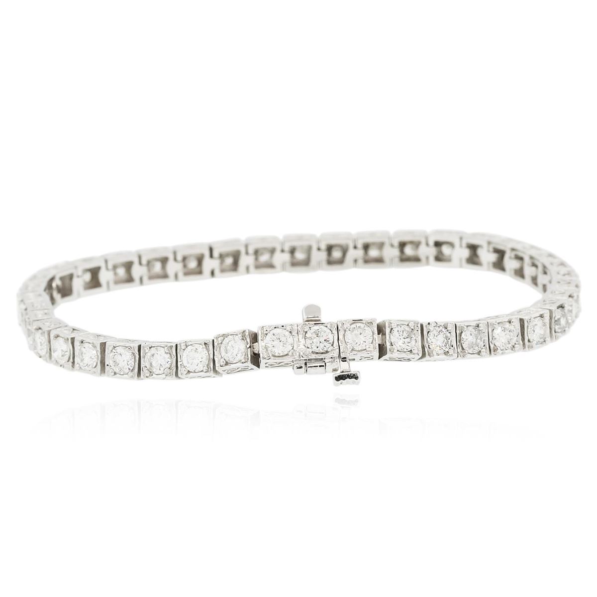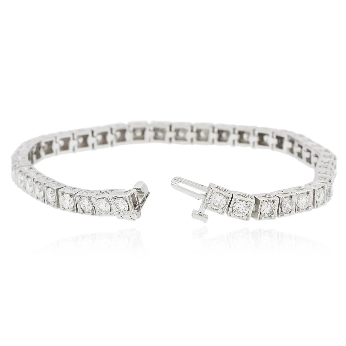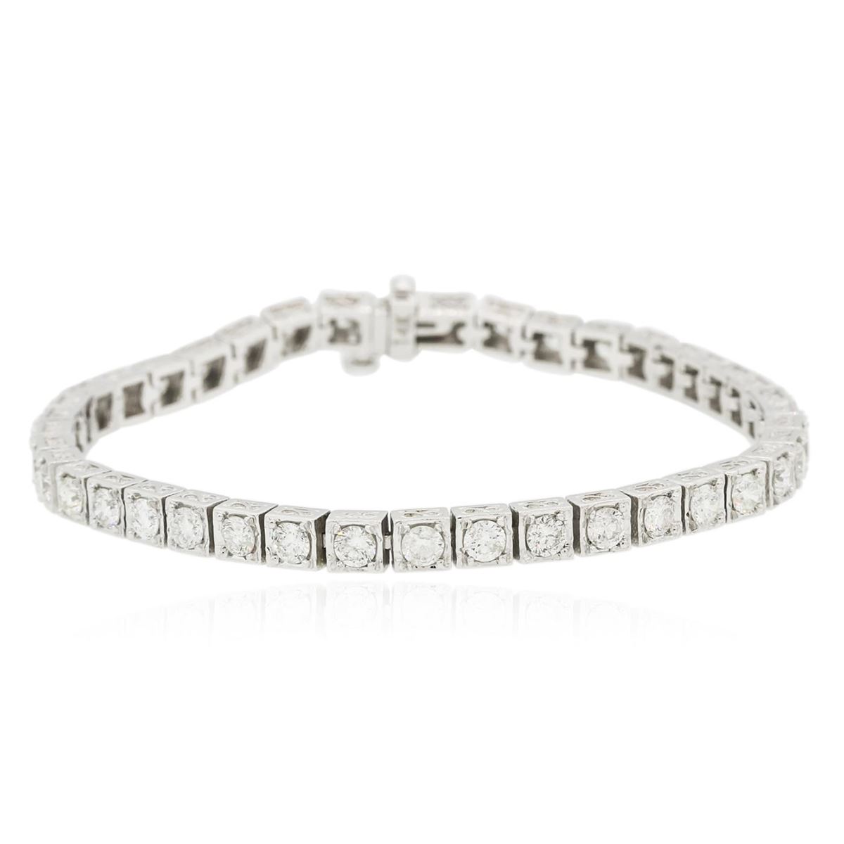 One electronically tested 14KT White Gold ladies cast & assembled diamond tennis bracelet with a bright and patterned finish. Seven inch length bracelet composed of a flexible ribbon of diamonds, terminating in a concealed clasp with safety bar. Identified with markings of "14K". Condition is new, good workmanship. Tennis bracelets & necklaces got their unusual name from an incident involving the U.S. professional tennis player Chris Evert during a tennis match in the 1980's. Evert had been wearing an expensive diamond bracelet, an inline string of individually-set diamonds. Previously these bracelets were known as eternity bracelets. When the clasp snapped during play, she asked the officials to stop the tennis match until the bracelet could be found. Since that day, bracelets and necklaces featuring an inline string of diamonds have been called tennis bracelets and tennis necklaces. Containing: Forty-One prong set round brilliant cut diamonds, measuring 3.20 - 3.00 x 1.85mm (depth est.) approximate total weight of 41 Stones = 4.54ct. Graded in the setting. Clarity: SI-2 to I-2. Color: H - J. Total Weight of Diamonds 4.54ct. Total Weight of Tennis Bracelet 17.17 grams. AIG Appraised at $14,125.00.