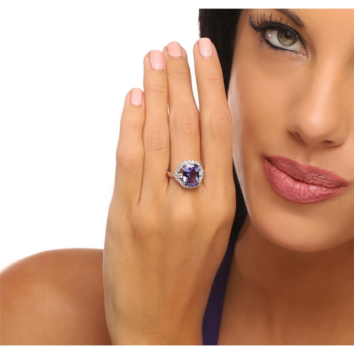 One electronically tested 14KT white gold ladies cast tanzanite and diamond ring with a bright polish finish. Condition is new, good workmanship. The featured tanzanite is set within a stylized diamond bezel, completed by a two and one-half millimeter wide band. Identified with markings of "K14". Containing: One prong set rectangular cushion mixed cut natural tanzanite, measuring 12.05 x 8.70 x 5.20mm, 6%. bulge factor, approximate weight of 4.55ct., clarity is eye clean, type I, medium dark, very slightly grayish, bluish violet color, (GIA bV 6/3), cut is good. Transmitting light with no distortion, transparent. Graded in the setting.Tanzanite is a very rare gemstone that is only found in the country of Tanzania. Originally discovered in 1967. Tiffany & Company, named the stone Tanzanite. It is found in the Usumburu Mountains that border the Umba Valley of northern Tanzania. Tanzanite occurs in gray, brown, violet, blue, reddish-purple, & green. The gem is interesting because of its exceptional pleochroism. Rotated in different directions a tanzanite will exhibit multiple changes of color. Tanzanite has a low tolerance to ultrasonic cleaning, and should not be cleaned using this method.Twenty-Six prong set round brilliant cut diamonds, measuring 2.50 - 1.90 x 1.32mm (depth est.) approximate. Total Weight of 26 Stones = 0.85ct. Graded in the setting. Clarity: SI-1 to I-1. Color: G - I. Total Weight of Colored Stones 4.55ct. Total Weight of Diamonds 0.85ct. Total Weight of Ring 5.67gm. AIG Appraised at $14,750.00.