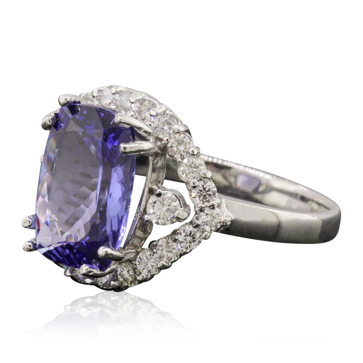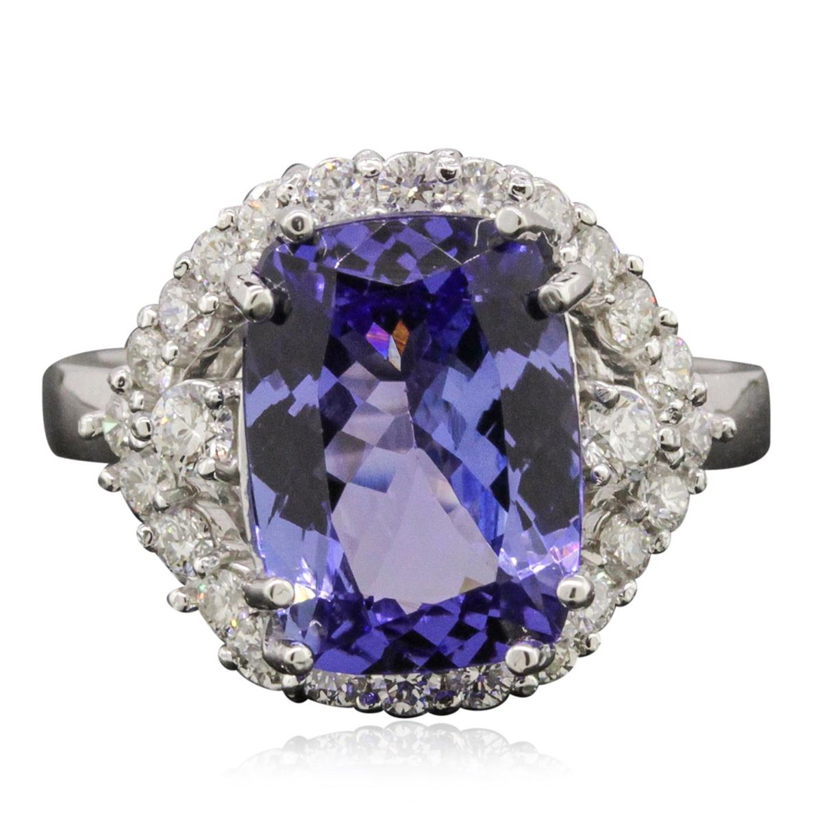 One electronically tested 14KT white gold ladies cast tanzanite and diamond ring with a bright polish finish. Condition is new, good workmanship. The featured tanzanite is set within a stylized diamond bezel, completed by a two and one-half millimeter wide band. Identified with markings of "K14". Containing: One prong set rectangular cushion mixed cut natural tanzanite, measuring 12.05 x 8.70 x 5.20mm, 6%. bulge factor, approximate weight of 4.55ct., clarity is eye clean, type I, medium dark, very slightly grayish, bluish violet color, (GIA bV 6/3), cut is good. Transmitting light with no distortion, transparent. Graded in the setting.Tanzanite is a very rare gemstone that is only found in the country of Tanzania. Originally discovered in 1967. Tiffany & Company, named the stone Tanzanite. It is found in the Usumburu Mountains that border the Umba Valley of northern Tanzania. Tanzanite occurs in gray, brown, violet, blue, reddish-purple, & green. The gem is interesting because of its exceptional pleochroism. Rotated in different directions a tanzanite will exhibit multiple changes of color. Tanzanite has a low tolerance to ultrasonic cleaning, and should not be cleaned using this method.Twenty-Six prong set round brilliant cut diamonds, measuring 2.50 - 1.90 x 1.32mm (depth est.) approximate. Total Weight of 26 Stones = 0.85ct. Graded in the setting. Clarity: SI-1 to I-1. Color: G - I. Total Weight of Colored Stones 4.55ct. Total Weight of Diamonds 0.85ct. Total Weight of Ring 5.67gm. AIG Appraised at $14,750.00.