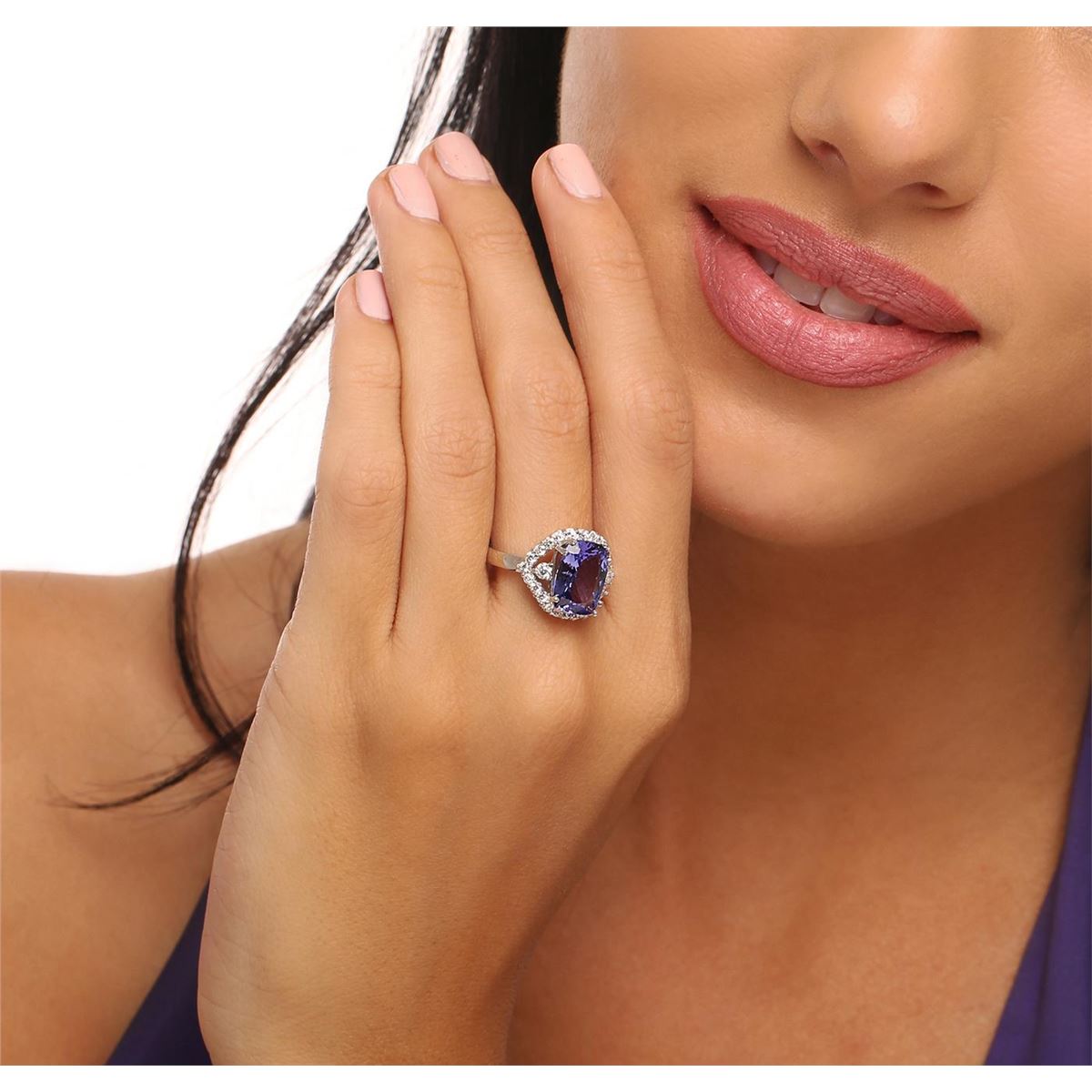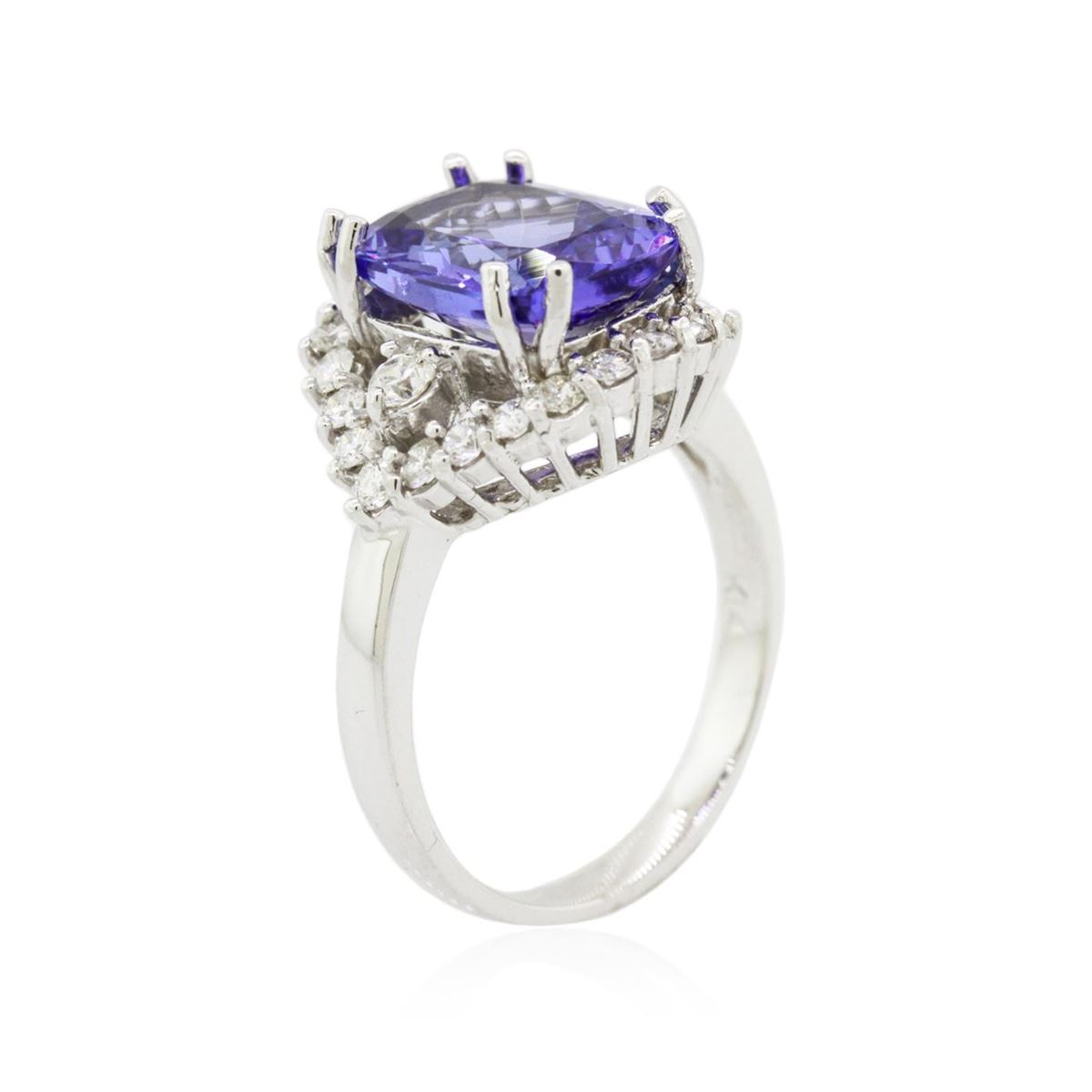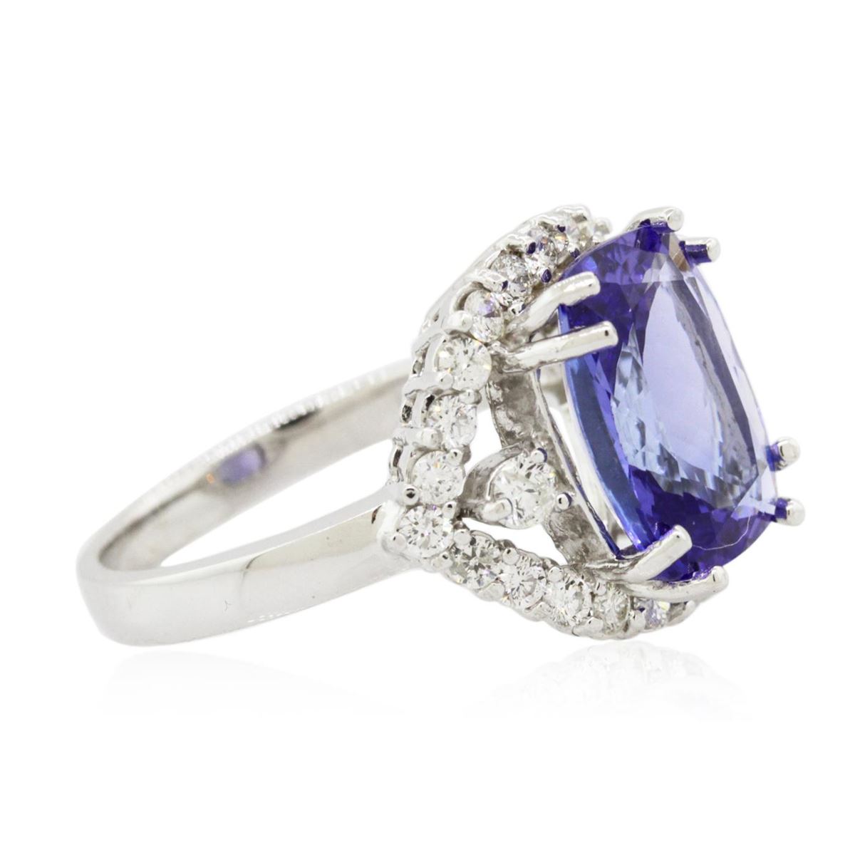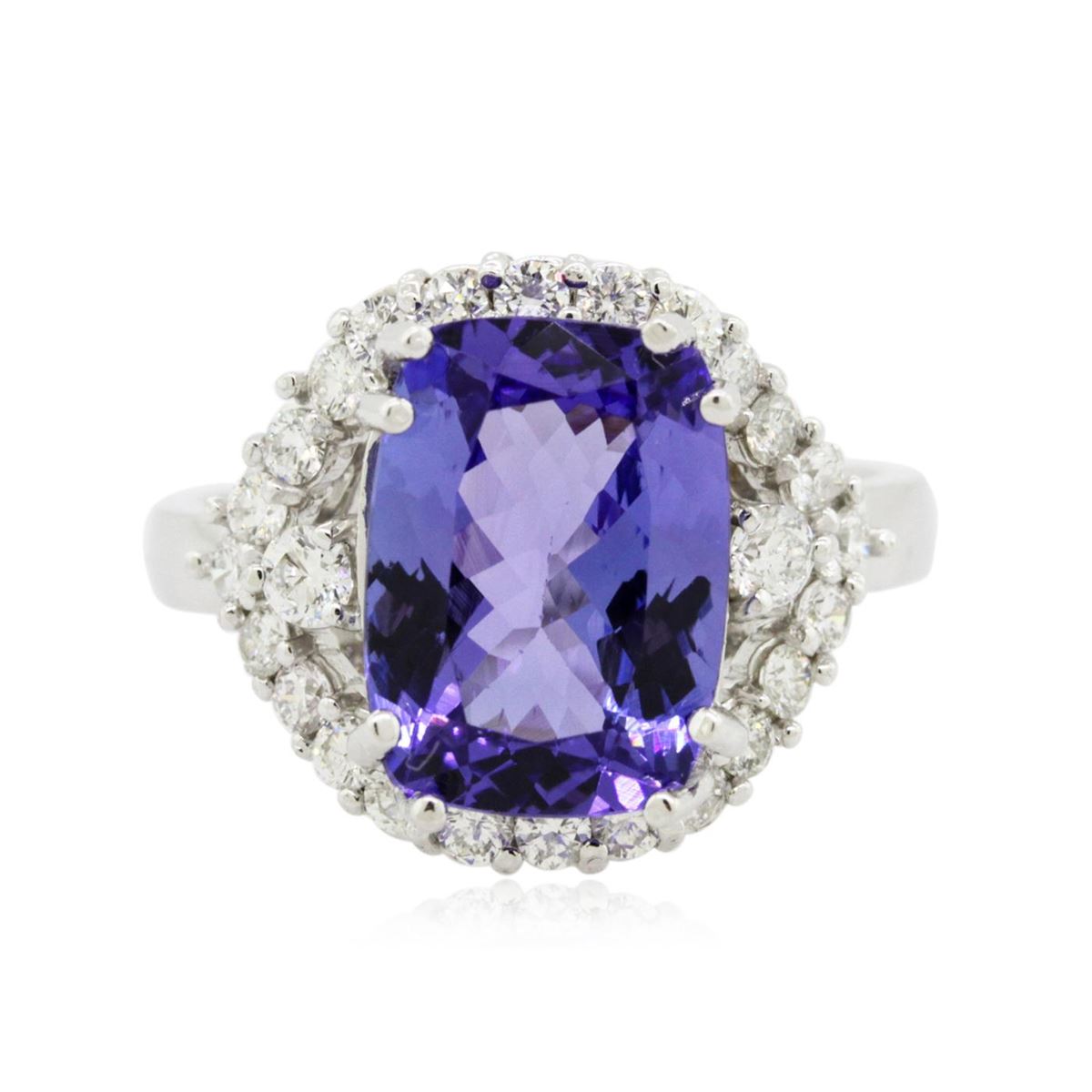 One electronically tested 14KT white gold ladies cast tanzanite and diamond ring with a bright polish finish. Condition is new, good workmanship. The featured tanzanite is set within a stylized diamond bezel, completed by a two and one-half millimeter wide band. Identified with markings of "K14". Containing: One prong set rectangular cushion mixed cut natural tanzanite, measuring 12.05 x 8.70 x 5.20mm, 6%. bulge factor, approximate weight of 4.55ct., clarity is eye clean, type I, medium dark, very slightly grayish, bluish violet color, (GIA bV 6/3), cut is good. Transmitting light with no distortion, transparent. Graded in the setting.Tanzanite is a very rare gemstone that is only found in the country of Tanzania. Originally discovered in 1967. Tiffany & Company, named the stone Tanzanite. It is found in the Usumburu Mountains that border the Umba Valley of northern Tanzania. Tanzanite occurs in gray, brown, violet, blue, reddish-purple, & green. The gem is interesting because of its exceptional pleochroism. Rotated in different directions a tanzanite will exhibit multiple changes of color. Tanzanite has a low tolerance to ultrasonic cleaning, and should not be cleaned using this method.Twenty-Six prong set round brilliant cut diamonds, measuring 2.50 - 1.90 x 1.32mm (depth est.) approximate. Total Weight of 26 Stones = 0.85ct. Graded in the setting. Clarity: SI-1 to I-1. Color: G - I. Total Weight of Colored Stones 4.55ct. Total Weight of Diamonds 0.85ct. Total Weight of Ring 5.67gm. AIG Appraised at $14,750.00.
