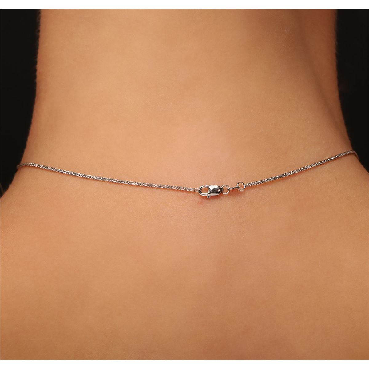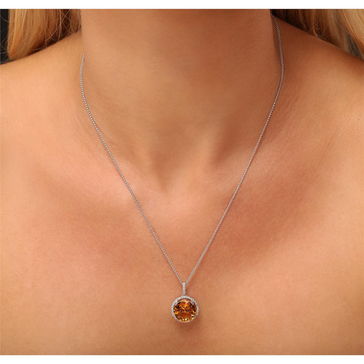 One electronically tested 14KT white gold ladies combination cast & die struck pendant & chain 17.0" long, medium cable link with a lobster claw clasp with a bright polish finish. Condition is new. Identified with markings of "14K". Containing: One prong set round modified brilliant cut natural citrine quartz, measuring 11.85 - 11.70 x 6.12 mm, approximate weight of 4.57ct., clarity is eye clean, type I, medium light, brownish, yellow color, (GIA Y 4/3), cut is good. Forty-One prong set round brilliant cut diamonds, measuring 1.20 - 1.20 x 0.72mm (depth est.) approximate total weight of 41 Stones = 0.26ct. Clarity: I-1 to I-2. Color: J - K, Cut is Good. Colored gemstones are presumed to have been subjected to commonly used enhancement processes. All diamonds and colored gemstones are graded in the mounting, unless otherwise stated. Total Weight of Colored Stones 4.57ct. Total Weight of Diamonds 0.26ct. Total Weight of Pendant & Chain 5.30 grams. GGL Appraised at $2,870.00.