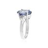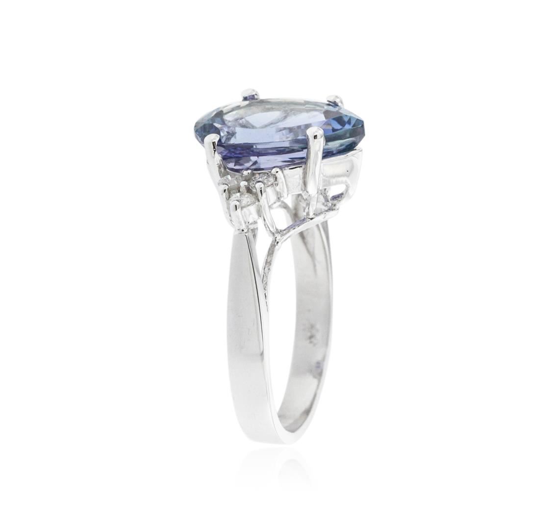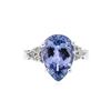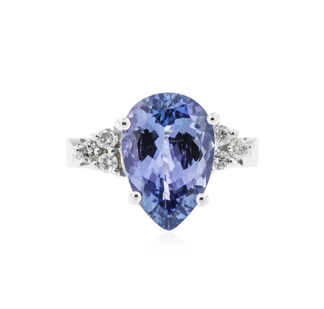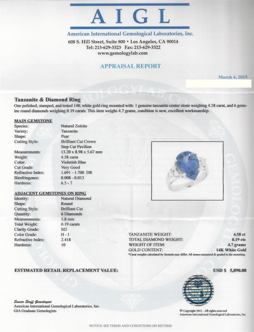 One polished, stamped, and tested 14K white gold ring mounted with: 1 genuine tanzanite center stone weighing 4.58 carat, and 6 genuine round diamonds weighing 0.19 carats. This item weighs 4.7 grams, condition is new, excellent workmanship. MAIN GEMSTONE: Species: Natural Zoisite. Variety: Tanzanite. Shape: Pear. Cutting Style: Brilliant Cut Crown Step Cut Pavilion. Measurements: 13.20 x 8.98 x 5.67 mm. Weight: 4.58 carat. Color: Violetish Blue. Cut Grade: Very Good. Refractive Index: 1.691 - 1.700 DR. Birefringence: 0.008 - 1.700 DR. Birefringence: 0.008 - 0.013. Hardness: 6.5 - 7. ADJACENT GEMSTONES ON RING: Identity: Natural Diamond. Shape: Round. Cutting Style: Brilliant Cut. Quantity: 6 Diamonds. Measurements: 1.8 mm. Total Weight: 0.19 carats. Clarity Grade: SI2. Color Grade: H - I. Refractive Index: 2.418. Hardness: 10. Tanzanite Weight: 4.58 ct. Total Diamond Weight: 0.19 cts. Weight of Item: 4.7 grams. Gold Content: 14K White Gold. AIGL Appraised at $5,890.00.