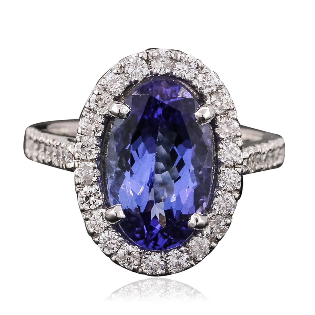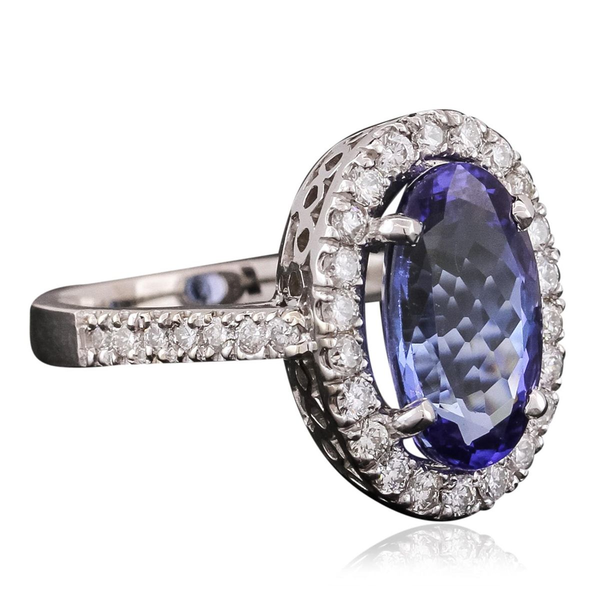 One electronically tested 14KT white gold ladies combination cast & assembled ring with a bright polish finish. Identified with markings of "K14". Condition is new. Containing: One prong set oval modified brilliant cut natural tanzanite, measuring 13.28 x 8.44 x 5.79mm, approximate weight of 4.58ct., clarity is eye clean, type I, medium, moderately strong, bluish violet color, (GIA bV 5/4), cut is good. Thirty-Seven prong set round brilliant cut diamonds, measuring 1.70 - 1.50 x 0.96mm (depth est.) approximate total weight of 37 Stones = 0.55ct. Clarity: SI-2 to I-1. Color: I - J, Cut is Good. Colored gemstones are presumed to have been subjected to commonly used enhancement processes. All diamonds and colored gemstones are graded in the mounting, unless otherwise stated. Total Weight of Colored Stones 4.58ct. Total Weight of Diamonds 0.55ct. Total Weight of Ring 5.80 grams. GGL Appraised at $9,440.00.