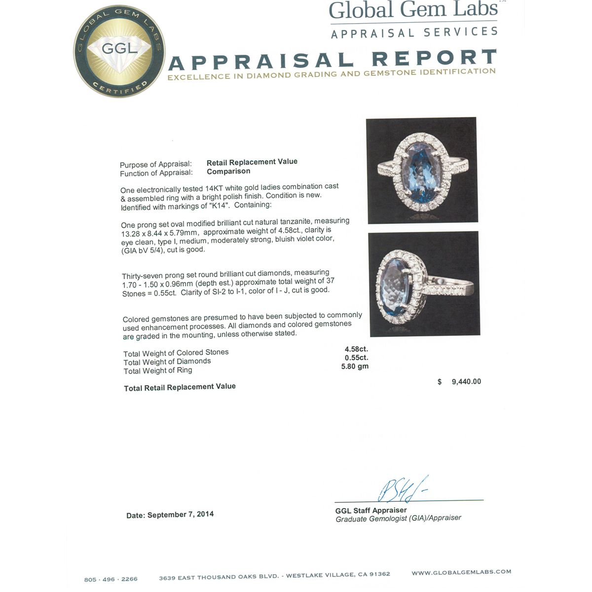 One electronically tested 14KT white gold ladies combination cast & assembled ring with a bright polish finish. Identified with markings of "K14". Condition is new. Containing: One prong set oval modified brilliant cut natural tanzanite, measuring 13.28 x 8.44 x 5.79mm, approximate weight of 4.58ct., clarity is eye clean, type I, medium, moderately strong, bluish violet color, (GIA bV 5/4), cut is good. Thirty-Seven prong set round brilliant cut diamonds, measuring 1.70 - 1.50 x 0.96mm (depth est.) approximate total weight of 37 Stones = 0.55ct. Clarity: SI-2 to I-1. Color: I - J, Cut is Good. Colored gemstones are presumed to have been subjected to commonly used enhancement processes. All diamonds and colored gemstones are graded in the mounting, unless otherwise stated. Total Weight of Colored Stones 4.58ct. Total Weight of Diamonds 0.55ct. Total Weight of Ring 5.80 grams. GGL Appraised at $9,440.00.