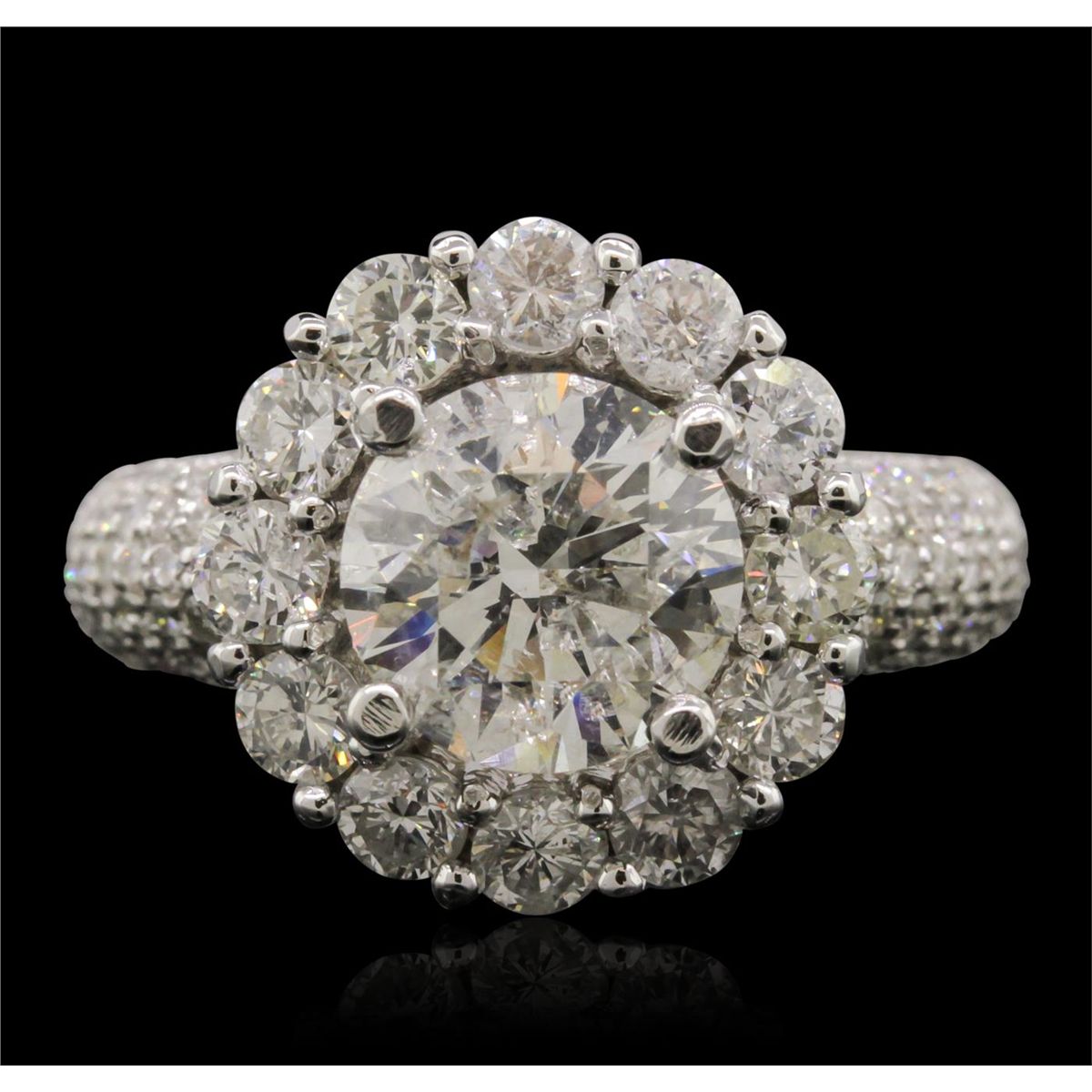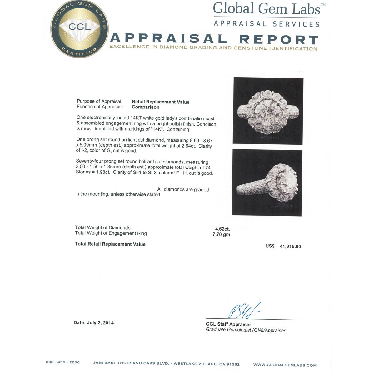 One electronically tested 14KT white gold Ladies combination cast & assembled engagement ring with a bright polish finish. Condition is new. Identified with markings of "14K". Containing: One prong set round brilliant cut diamond, measuring 8.69 - 8.67 x 5.09mm (depth est.) approximate. Total Weight of 2.64ct. Clarity: I-2. Color: G, Cut is Good. Seventy-Four prong set round brilliant cut diamonds, measuring 3.00 - 1.50 x 1.35mm (depth est.) approximate. Total Weight of 74 Stones = 1.98ct. Clarity: SI-1 to SI-3. Color: F - H, Cut is Good. EGL USA GEM ID# US 911348431D. All diamonds are graded in the mounting, unless otherwise stated. Total Weight of Diamonds 4.62ct. Total Weight of Engagement Ring 7.70 grams. GGLAppraised at $41,915.00.