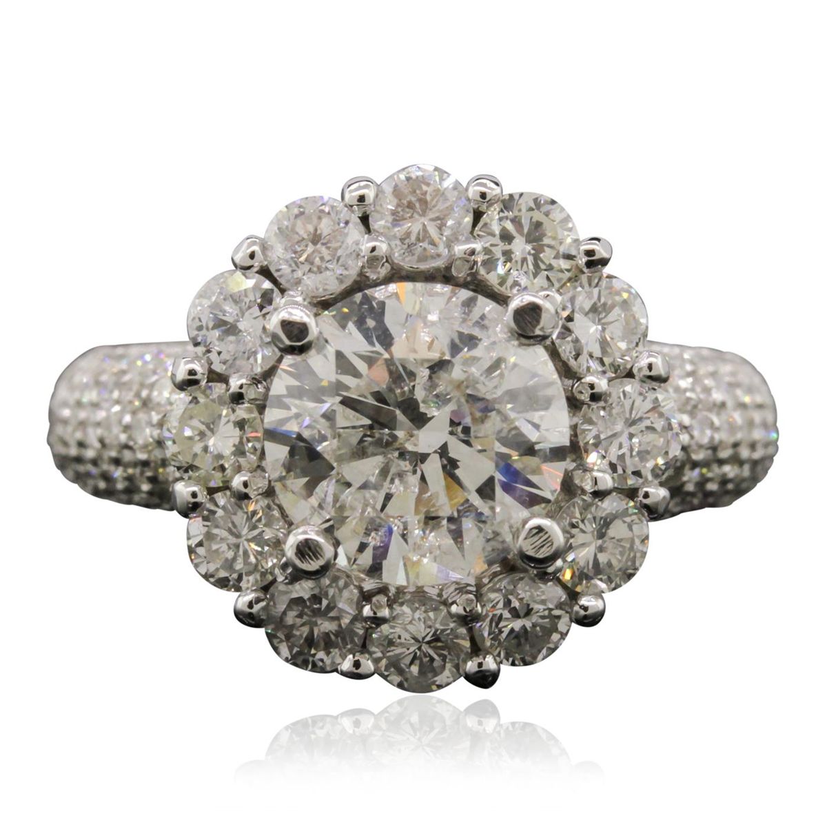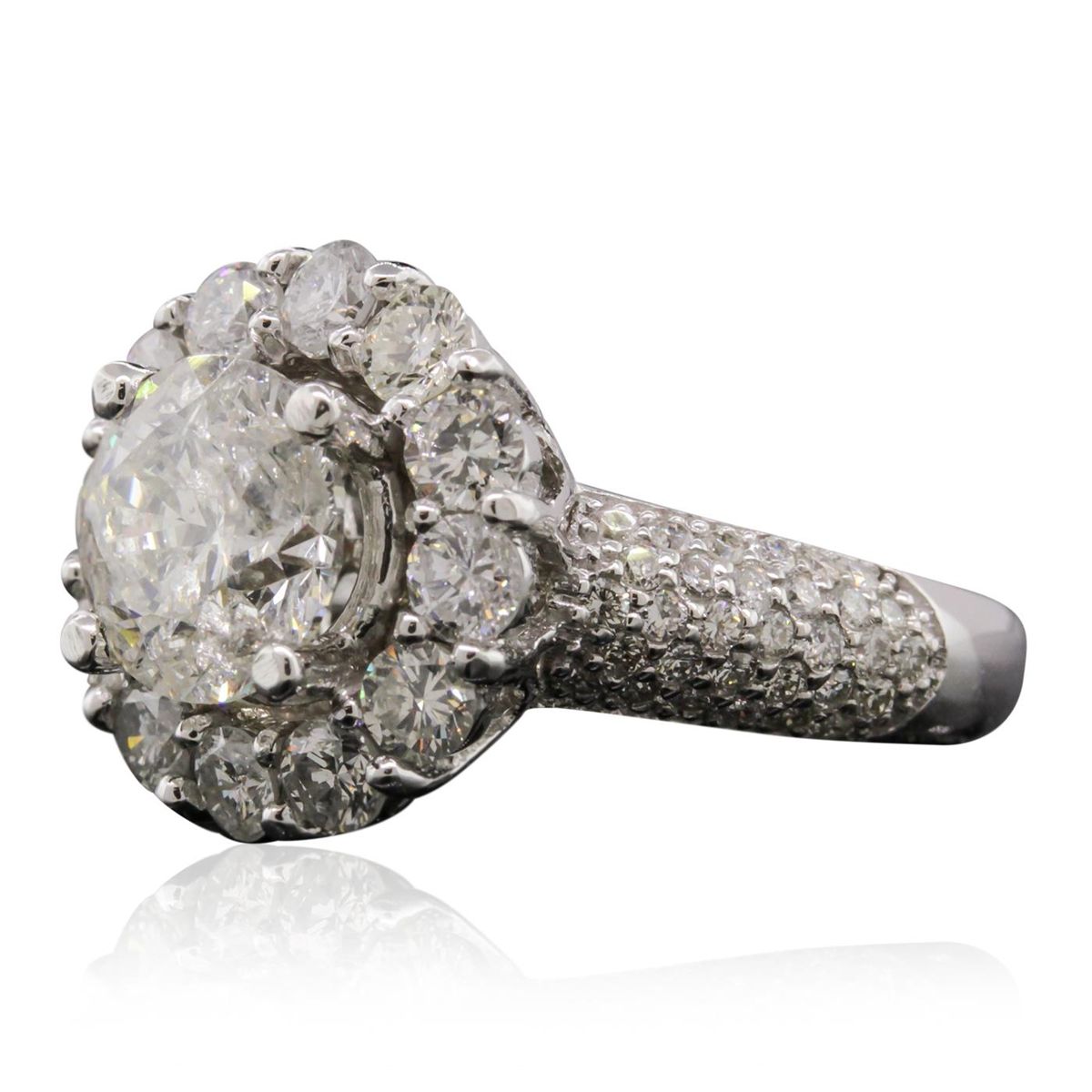 One electronically tested 14KT white gold Ladies combination cast & assembled engagement ring with a bright polish finish. Condition is new. Identified with markings of "14K". Containing: One prong set round brilliant cut diamond, measuring 8.69 - 8.67 x 5.09mm (depth est.) approximate. Total Weight of 2.64ct. Clarity: I-2. Color: G, Cut is Good. Seventy-Four prong set round brilliant cut diamonds, measuring 3.00 - 1.50 x 1.35mm (depth est.) approximate. Total Weight of 74 Stones = 1.98ct. Clarity: SI-1 to SI-3. Color: F - H, Cut is Good. EGL USA GEM ID# US 911348431D. All diamonds are graded in the mounting, unless otherwise stated. Total Weight of Diamonds 4.62ct. Total Weight of Engagement Ring 7.70 grams. GGLAppraised at $41,915.00.