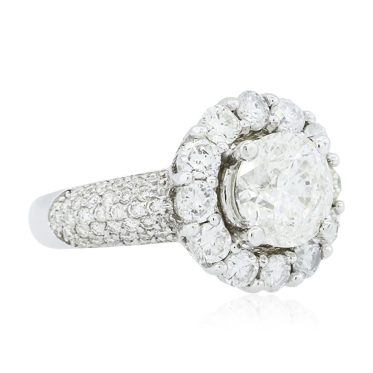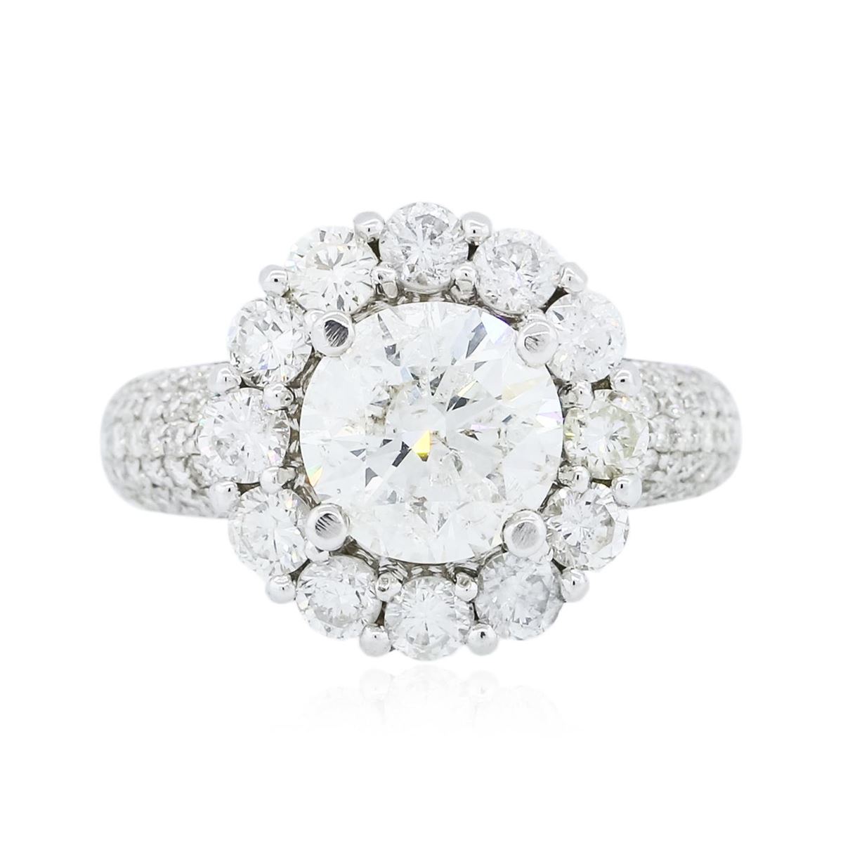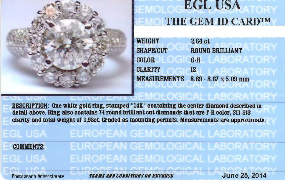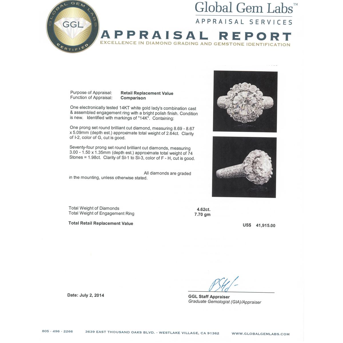 One electronically tested 14KT white gold Ladies combination cast & assembled engagement ring with a bright polish finish. Condition is new. Identified with markings of "14K". Containing: One prong set round brilliant cut diamond, measuring 8.69 - 8.67 x 5.09mm (depth est.) approximate. Total Weight of 2.64ct. Clarity: I-2. Color: G, Cut is Good. Seventy-Four prong set round brilliant cut diamonds, measuring 3.00 - 1.50 x 1.35mm (depth est.) approximate. Total Weight of 74 Stones = 1.98ct. Clarity: SI-1 to SI-3. Color: F - H, Cut is Good. EGL USA GEM ID# US 911348431D. All diamonds are graded in the mounting, unless otherwise stated. Total Weight of Diamonds 4.62ct. Total Weight of Engagement Ring 7.70 grams. GGL Appraised at $41,915.00.