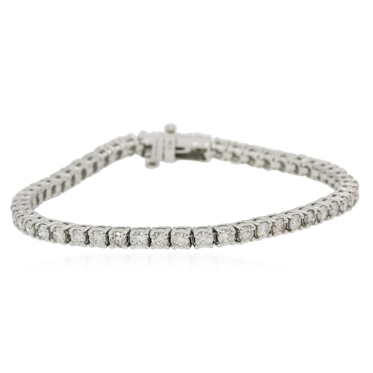 One electronically tested 14KT white gold ladies combination cast & assembled tennis bracelet with a hidden box clasp with a bright polish finish. Condition is new. Measurements: 6.85" in length. Identified with markings of "14K". Containing: Fifty-Two prong set round brilliant cut diamonds, measuring 2.90 - 2.90 x 1.74mm (depth est.) approximate total weight of 52 Stones = 4.64ct. Clarity: SI-1 to I-1. Color: I - J, Cut is Good. All diamonds are graded in the mounting, unless otherwise stated. Total Weight of Diamonds 4.64ct. Total Weight of Bracelet 13.70 grams. GGL Appraised at $16,290.00.