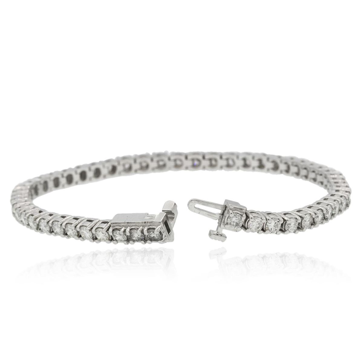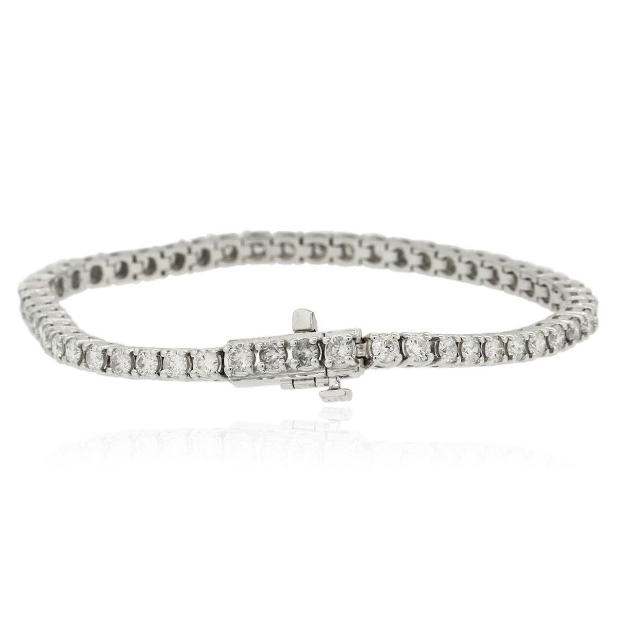 One electronically tested 14KT white gold ladies combination cast & assembled tennis bracelet with a hidden box clasp with a bright polish finish. Condition is new. Measurements: 6.85" in length. Identified with markings of "14K". Containing: Fifty-Two prong set round brilliant cut diamonds, measuring 2.90 - 2.90 x 1.74mm (depth est.) approximate total weight of 52 Stones = 4.64ct. Clarity: SI-1 to I-1. Color: I - J, Cut is Good. All diamonds are graded in the mounting, unless otherwise stated. Total Weight of Diamonds 4.64ct. Total Weight of Bracelet 13.70 grams. GGL Appraised at $16,290.00.