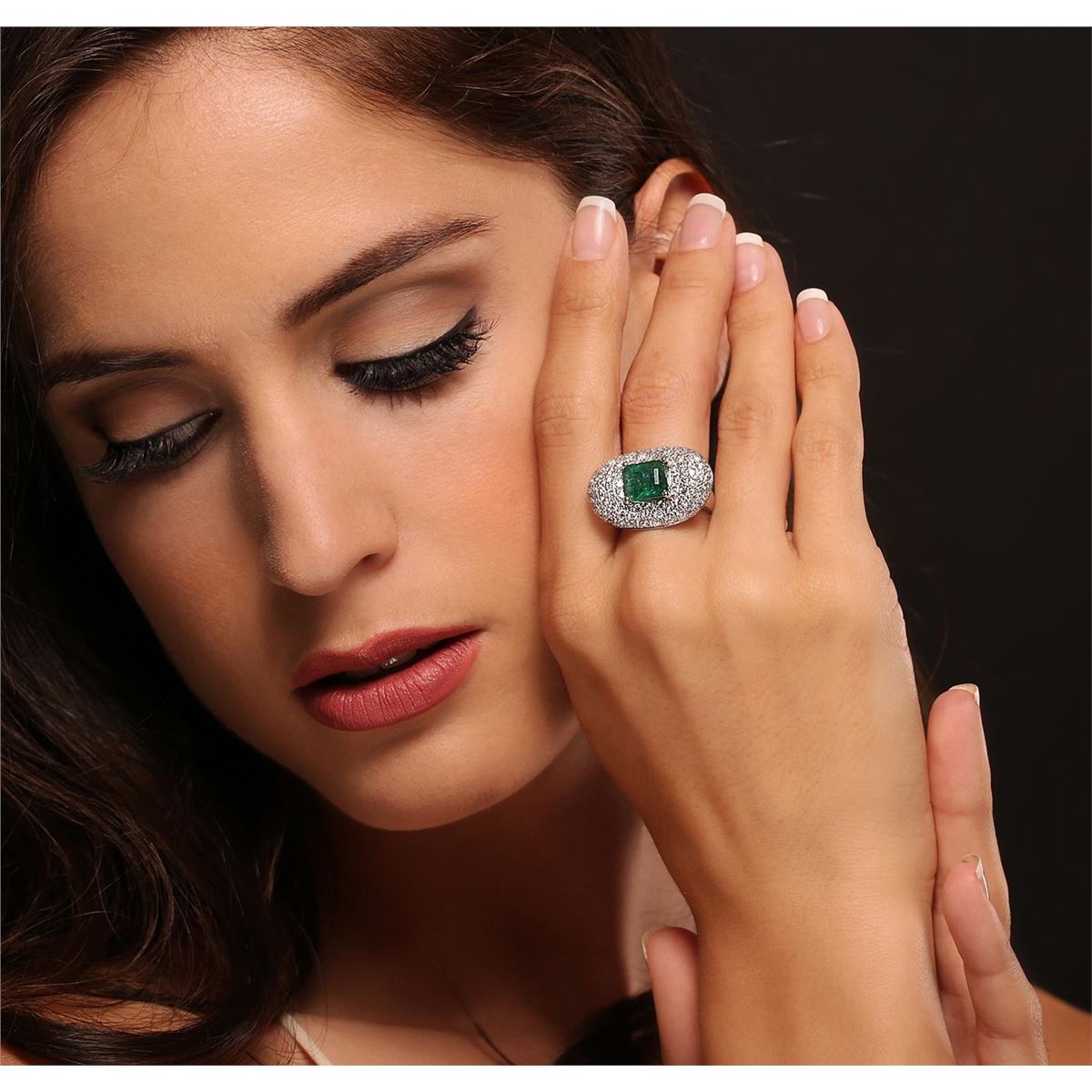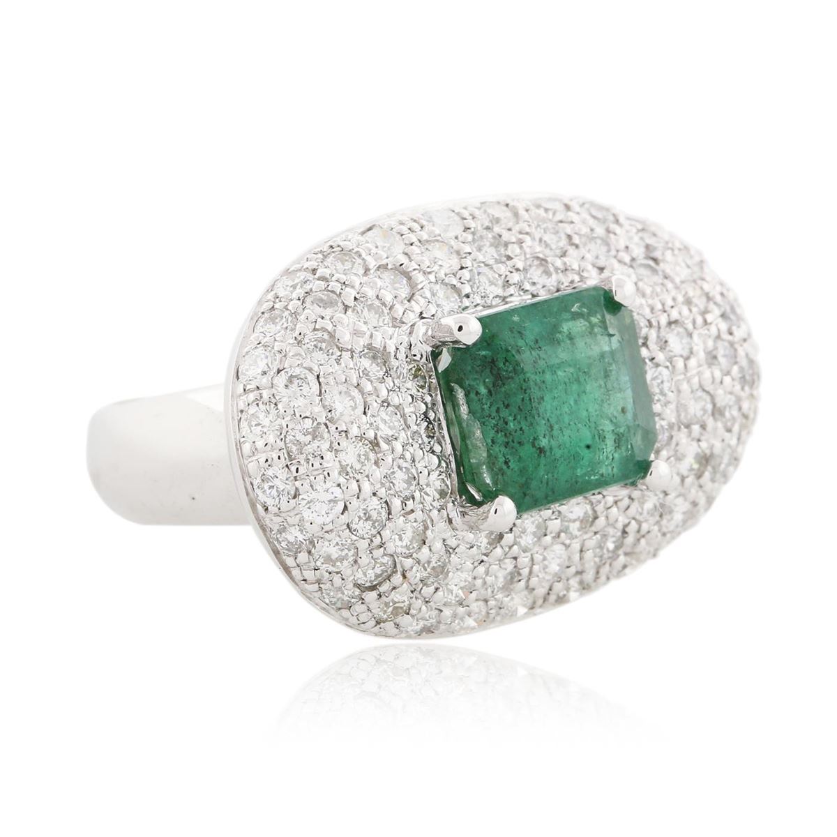One electronically tested 14KT white gold ladies cast emerald and diamond ring with a bright polish finish. Condition is new, good workmanship. The featured emerald is set within a diamond set gallery, completed by a four millimeter wide band. Identified with markings of "K14". Containing: One prong set rectangular step cut natural emerald, measuring 10.00 x 8.30 x 6.35mm, 8% bulge factor, approximate weight of 4.64ct, clarity is heavily included, type III, medium dark, very slightly grayish, very slightly bluish green color, (GIA vslbG 6/3), cut is good. Transmitting light with a minimum of distortion, transparent to translucent. Naturally occurring internal & external characteristics are present. Indications of oil residue. Graded in the setting. Seventy-Nine pave‚ set round brilliant cut diamonds, measuring 2.00 - 1.90 x 1.17mm (depth est.) approximate total weight of 79 Stones = 2.24ct. Graded in the setting. Clarity SI-2 to I-1 Color F - I Total Weight of Colored Stones 4.64ct. Total Weight of Diamonds 2.24ct. Total Weight of Ring 12.50 grams. AIG Appraised at $15,800.00.