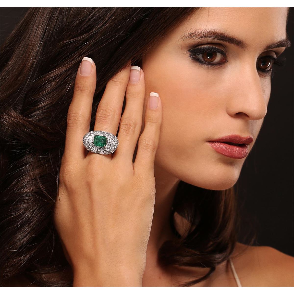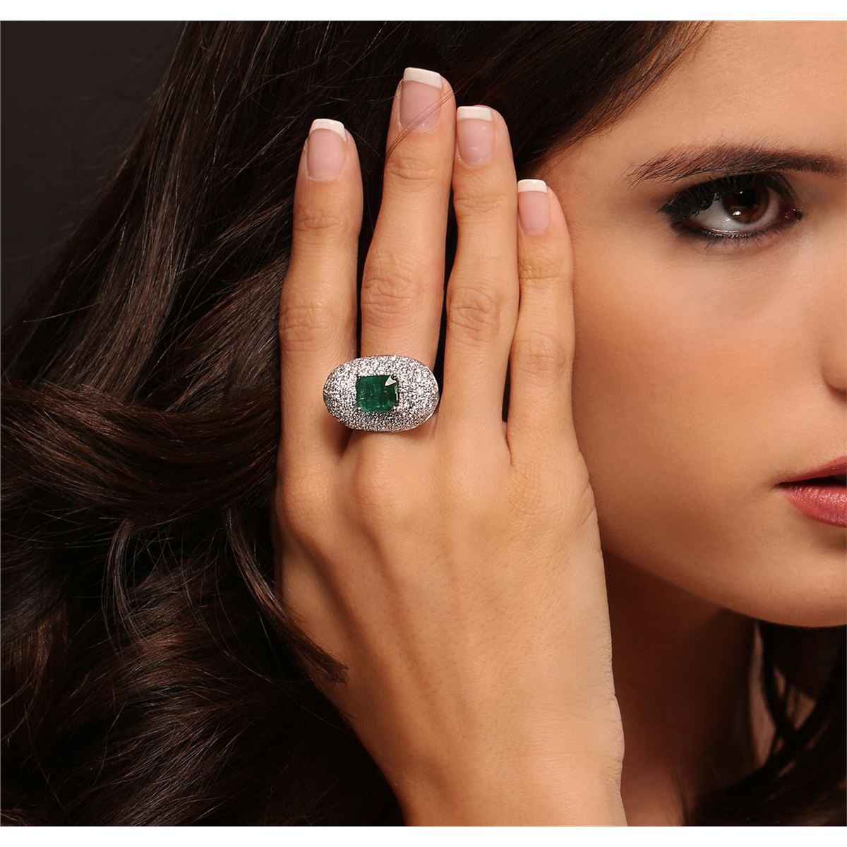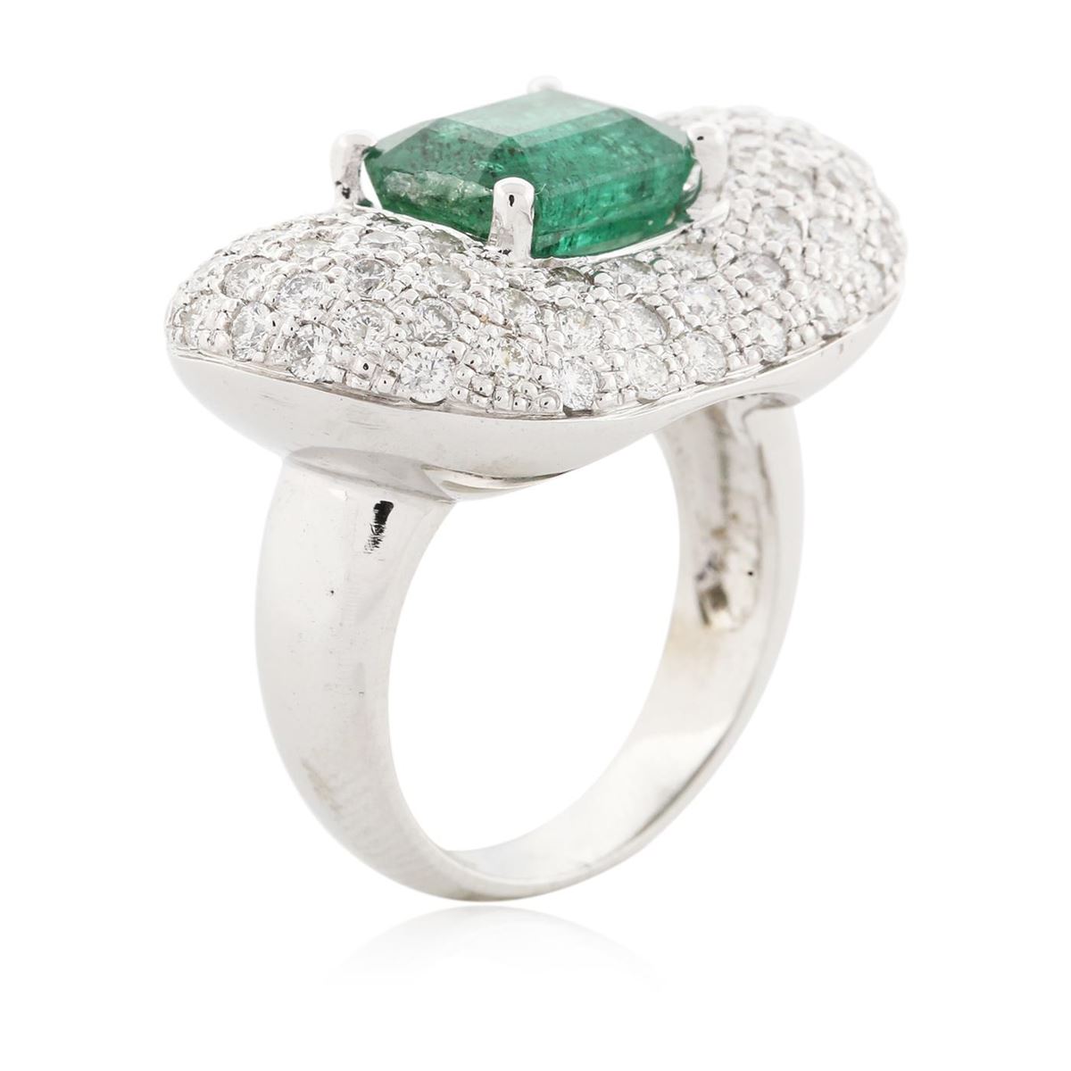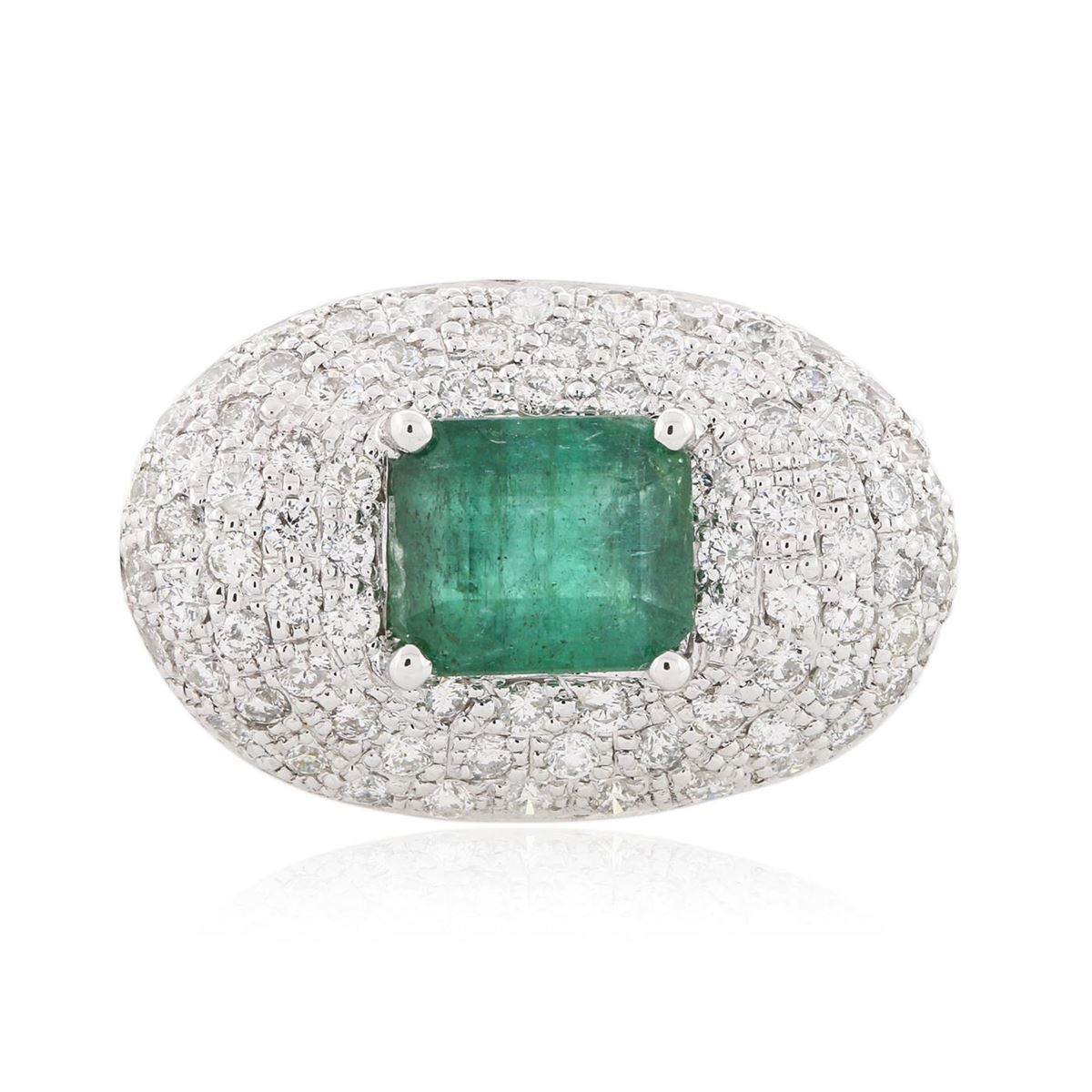 One electronically tested 14KT white gold ladies cast emerald and diamond ring with a bright polish finish. Condition is new, good workmanship. The featured emerald is set within a diamond set gallery, completed by a four millimeter wide band. Identified with markings of "K14". Containing: One prong set rectangular step cut natural emerald, measuring 10.00 x 8.30 x 6.35mm, 8% bulge factor, approximate weight of 4.64ct, clarity is heavily included, type III, medium dark, very slightly grayish, very slightly bluish green color, (GIA vslbG 6/3), cut is good. Transmitting light with a minimum of distortion, transparent to translucent. Naturally occurring internal & external characteristics are present. Indications of oil residue. Graded in the setting. Seventy-Nine pave‚ set round brilliant cut diamonds, measuring 2.00 - 1.90 x 1.17mm (depth est.) approximate total weight of 79 Stones = 2.24ct. Graded in the setting. Clarity SI-2 to I-1 Color F - I Total Weight of Colored Stones 4.64ct. Total Weight of Diamonds 2.24ct. Total Weight of Ring 12.50 grams. AIG Appraised at $15,800.00.