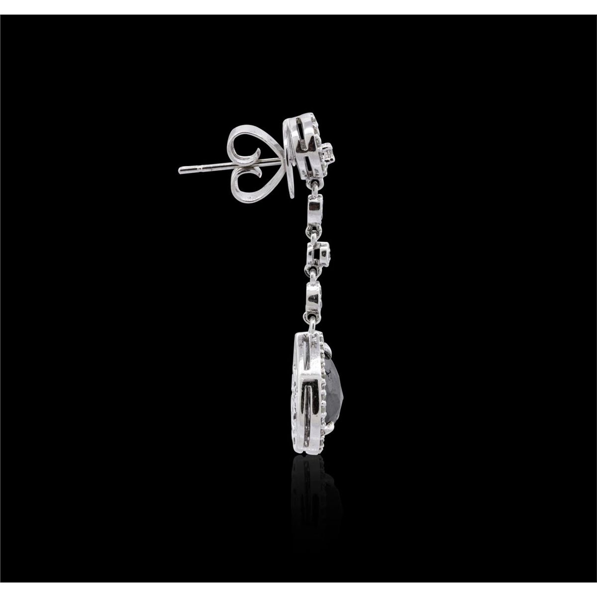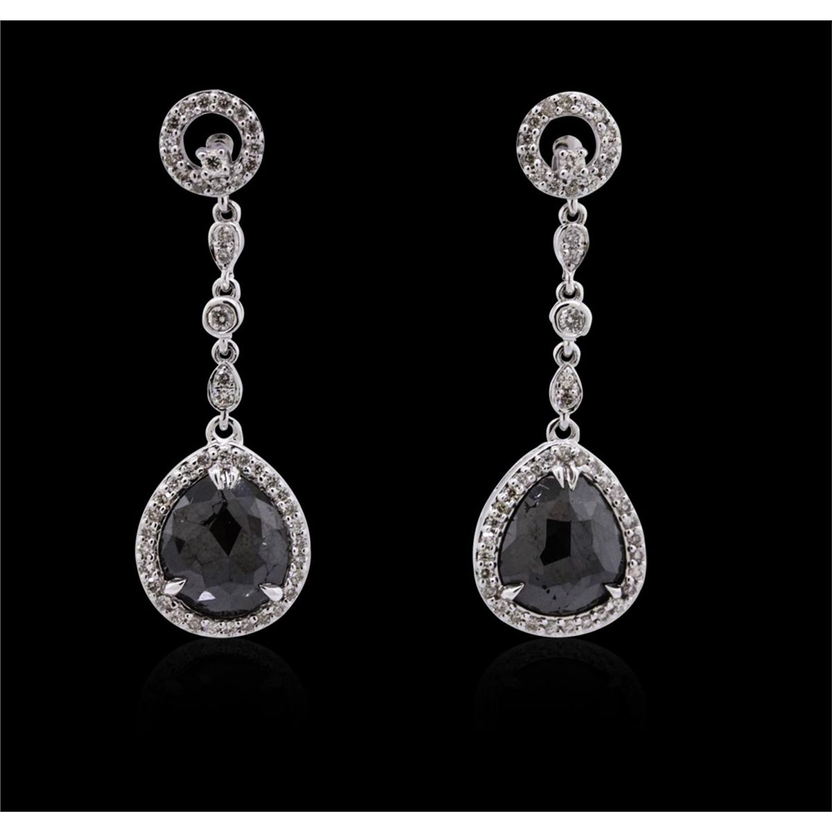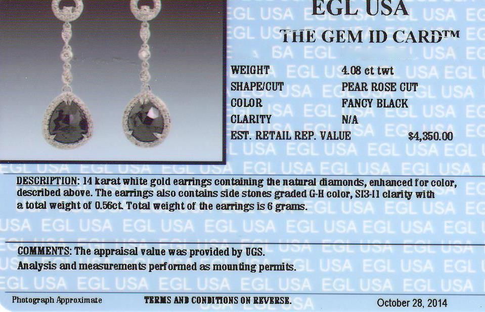 One pair of 14KT white gold earrings containing two natural pear rose cut fancy black diamonds, enhanced for color, with a total weight of 4.08ct. The earrings also contain side stones graded G-H color, SI3-I1 clarity with a total weight of 0.56ct. Total weight of the earrings is 6.00 grams. EGL Appraised at $4,350.00.