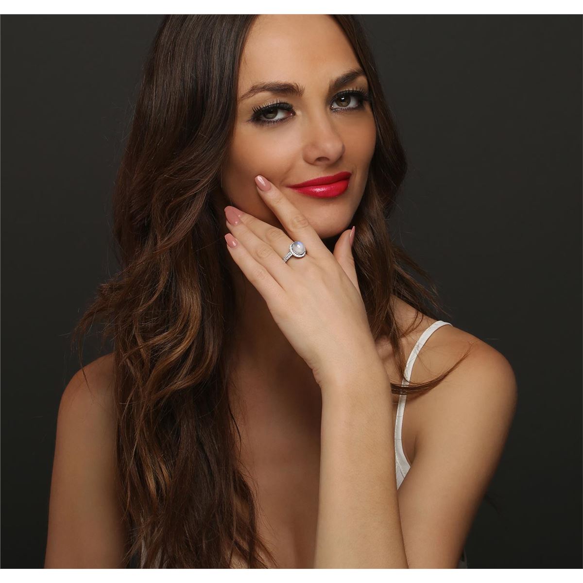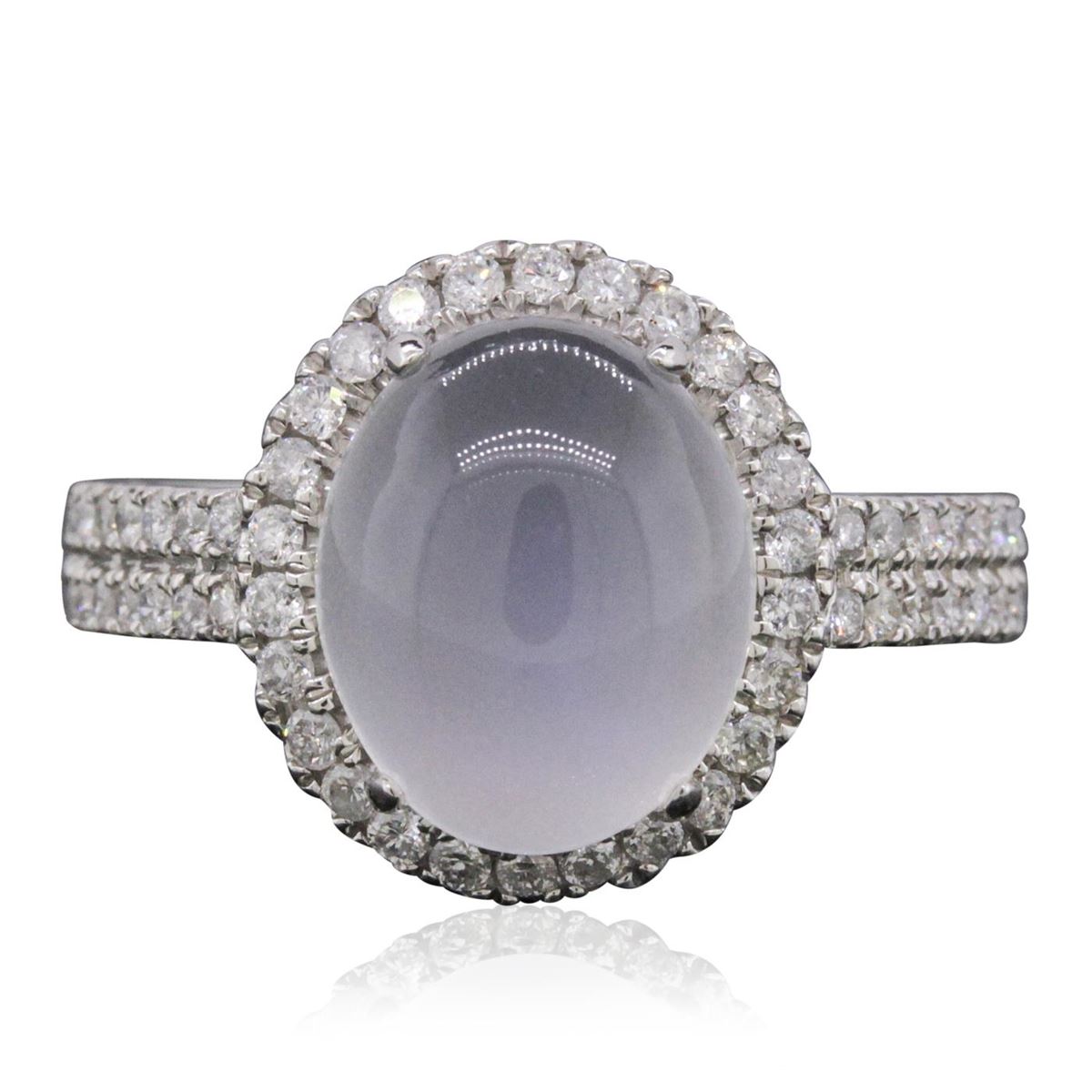 One electronically tested 14KT white gold ladies combination cast & assembled moonstone and diamond ring with a flat shank with a bright polish finish. Identified with markings of "14K". Condition is new. Containing: One prong set oval cabochon cut natural moonstone, measuring 11.05 x 9.09 x 7.50mm, approximate weight of 4.65ct., very light, slightly grayish, white color, (GIA W 2/2), cut is good. Fifty-Three prong set round brilliant cut diamonds, measuring 1.20 - 1.20 x 0.72mm (depth est.) approximate total weight of 53 Stones = 0.33ct. Clarity: SI-2 to I-1. Color: H - I, Cut is Good. Colored gemstones are presumed to have been subjected to commonly used enhancement processes. All diamonds and colored gemstones are graded in the mounting, unless otherwise stated. Total Weight of Colored Stones 4.65ct. Total Weight of Diamonds 0.33ct. Total Weight of Ring 4.80 grams. GGL Appraised at $3,710.00.