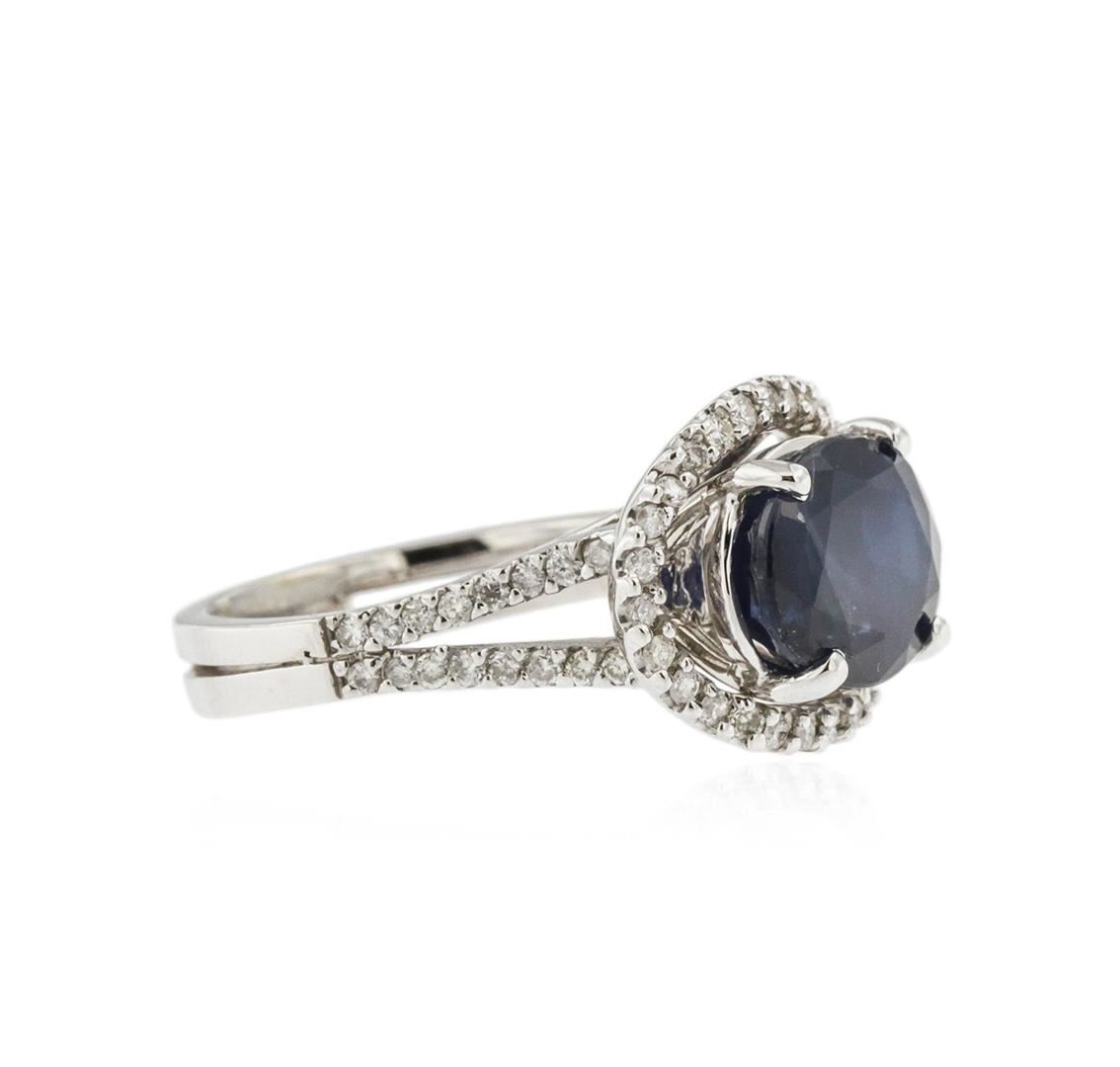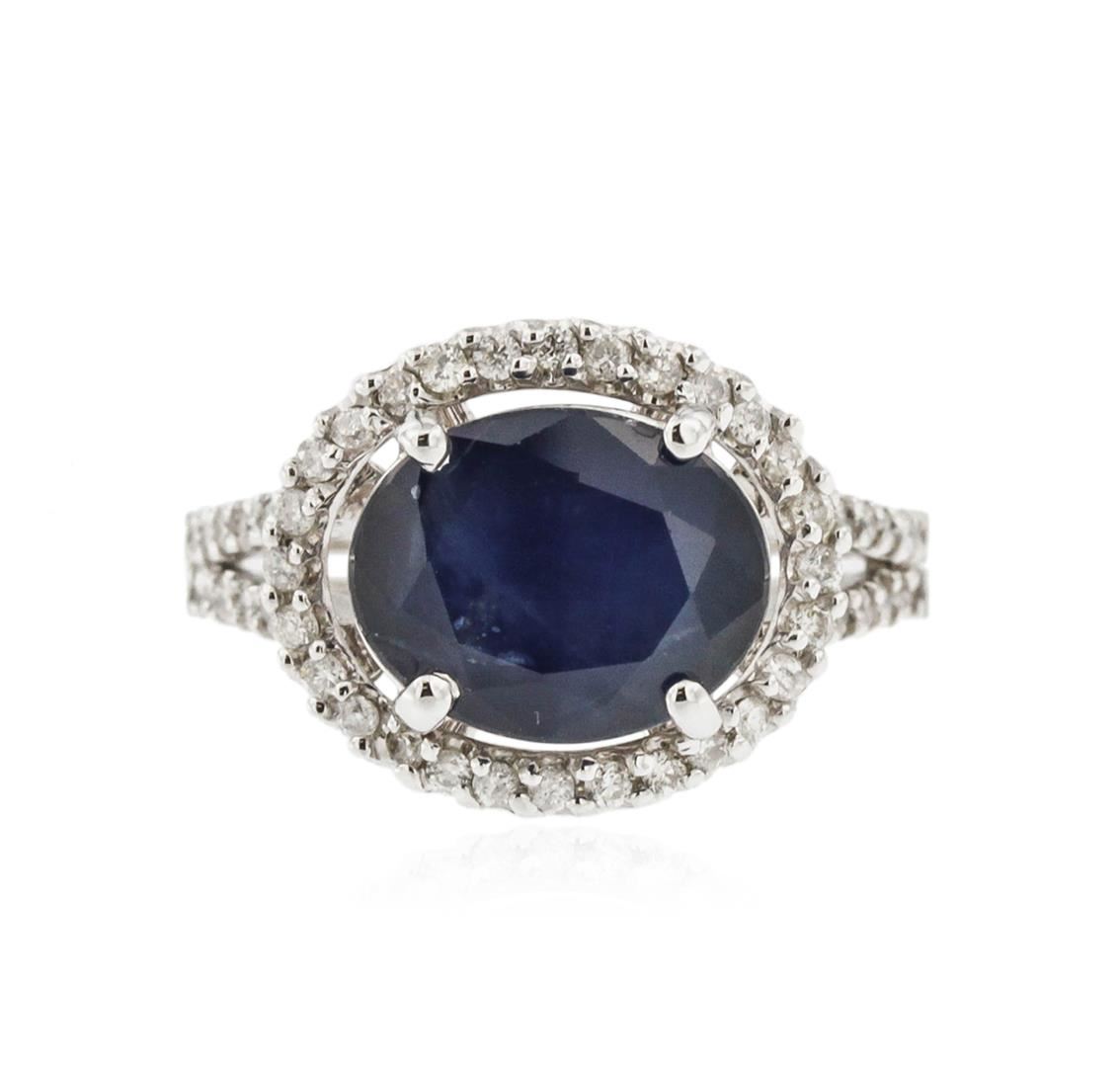 One electronically tested 14KT white gold ladies cast sapphire and diamond ring with a bright polish finish. Identified with markings of "14K". Condition is new. Containing: One prong set oval modified brilliant cut natural blue sapphire, measuring 11.00 x 8.80 x 5.72mm, approximate weight of 4.65ct., clarity is heavily included, type II, medium, very slightly grayish, blue color, (GIA B 5/3), cut is good. Sixty prong set round brilliant cut diamonds, measuring 1.30 - 1.20 x 0.75mm (depth est.) approximate total weight of 60 Stones = 0.43ct. Clarity of I-1 to I-2, Color of I - J, Cut is Good. Colored gemstones are presumed to have been subjected to commonly used enhancement processes. All diamonds and colored gemstones are graded in the mounting, unless otherwise stated. Total Weight of Colored Stones 4.65ct. Total Weight of Diamonds 0.43ct. Total Weight of Ring 6.70 grams. GGL Appraised at $4,390.00.