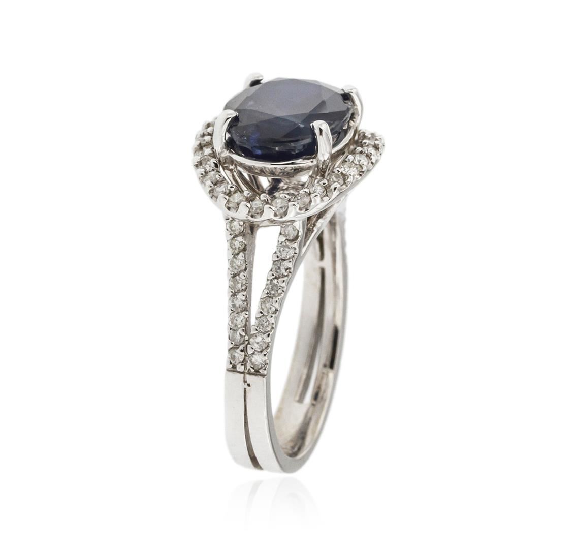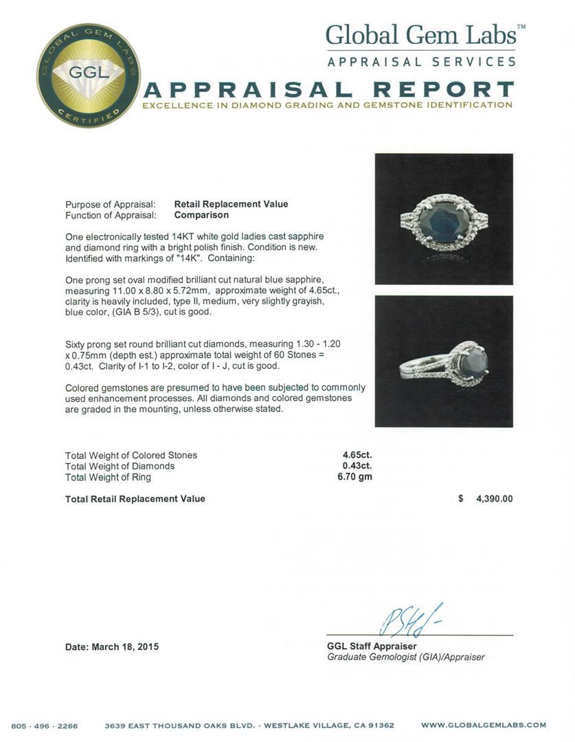 One electronically tested 14KT white gold ladies cast sapphire and diamond ring with a bright polish finish. Identified with markings of "14K". Condition is new. Containing: One prong set oval modified brilliant cut natural blue sapphire, measuring 11.00 x 8.80 x 5.72mm, approximate weight of 4.65ct., clarity is heavily included, type II, medium, very slightly grayish, blue color, (GIA B 5/3), cut is good. Sixty prong set round brilliant cut diamonds, measuring 1.30 - 1.20 x 0.75mm (depth est.) approximate total weight of 60 Stones = 0.43ct. Clarity of I-1 to I-2, Color of I - J, Cut is Good. Colored gemstones are presumed to have been subjected to commonly used enhancement processes. All diamonds and colored gemstones are graded in the mounting, unless otherwise stated. Total Weight of Colored Stones 4.65ct. Total Weight of Diamonds 0.43ct. Total Weight of Ring 6.70 grams. GGL Appraised at $4,390.00.
