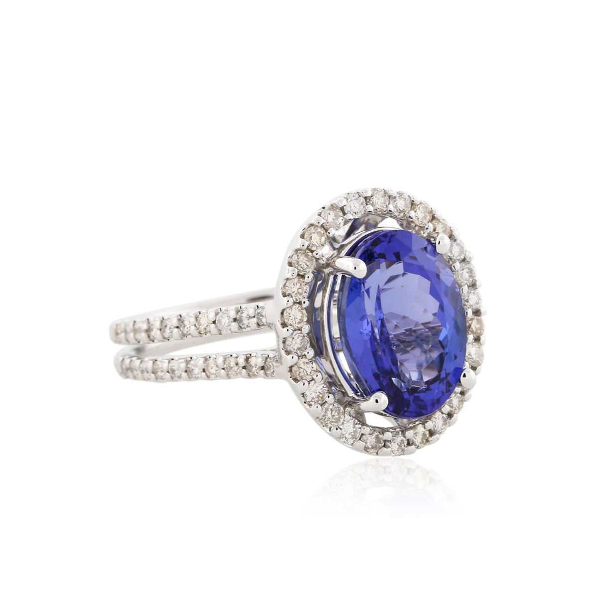One electronically tested 14KT white gold ladies cast tanzanite and diamond ring with a bright polish finish. Condition is new, good workmanship. The featured tanzanite is set within a diamond lattice gallery, supported by diamond set split shoulders and completed by a three millimeter wide band. Identified with markings of "14K". Containing: One prong set oval mixed cut natural tanzanite, measuring 11.70 x 8.40 x 6.00mm, 8%. bulge factor, approximate weight of 4.67ct., clarity is eye clean, type I, medium dark, very slightly grayish, violetish blue color, (GIA vB 6/3), cut is good. Transmitting light with no distortion, transparent. Graded in the setting. Tanzanite is a very rare gemstone that is only found in the country of Tanzania. Originally discovered in 1967. Tiffany & Company, named the stone Tanzanite. It is found in the Usumburu Mountains that border the Umba Valley of northern Tanzania. Tanzanite occurs in gray, brown, violet, blue, reddish-purple, & green. The gem is interesting because of its exceptional pleochroism. Rotated in different directions a tanzanite will exhibit multiple changes of color. Tanzanite has a low tolerance to ultrasonic cleaning, and should not be cleaned using this method. Sixty-Six prong set round brilliant cut diamonds, measuring 1.60 - 1.40 x 0.90mm (depth est.) approximate. Total Weight of 66 Stones = 0.88ct. Graded in the setting. Clarity: SI-1 to I-1. Color: I - K. Total Weight of Colored Stones 4.67ct. Total Weight of Diamonds 0.88ct. Total Weight of Ring 7.30 grams. AIG Appraised at $14,845.00.
