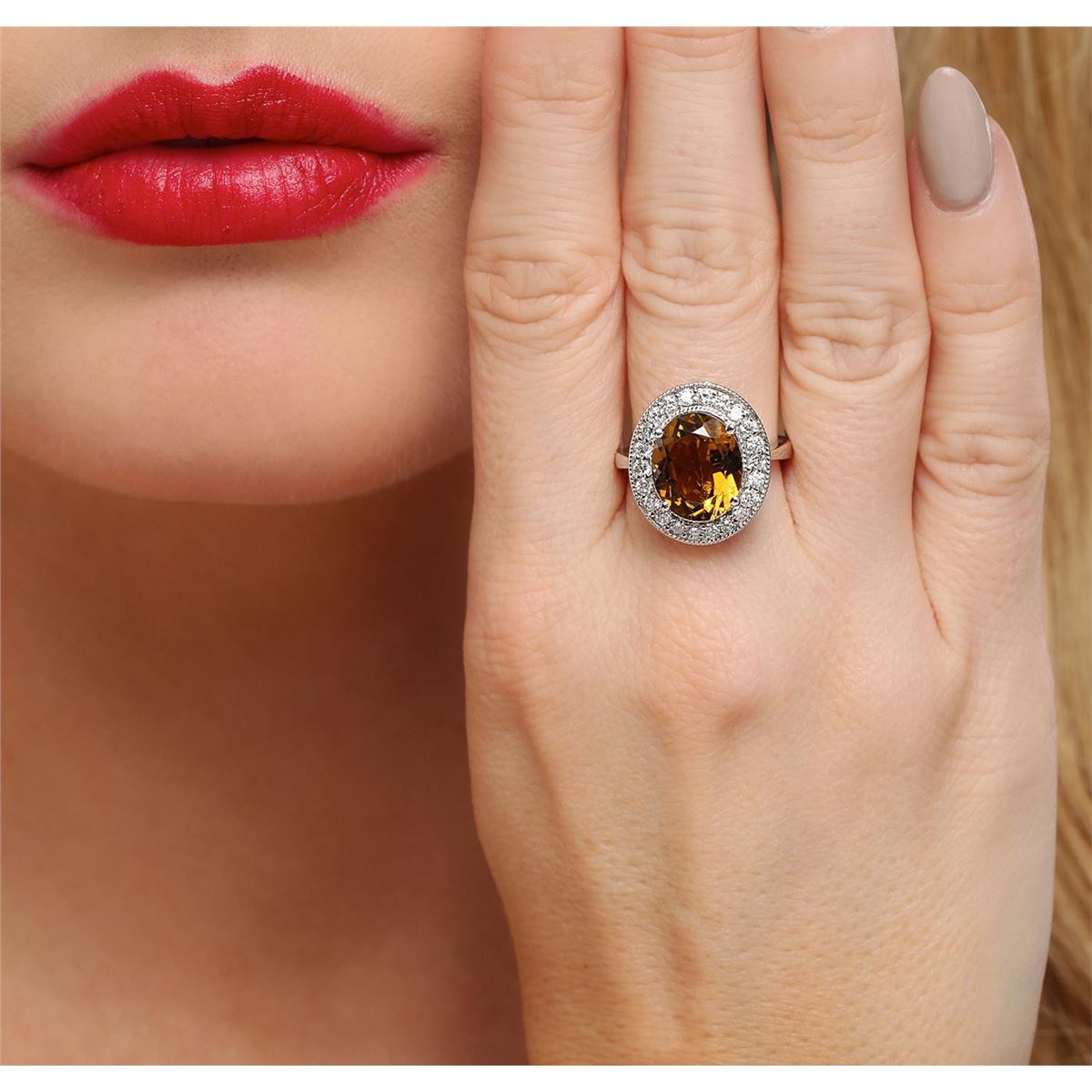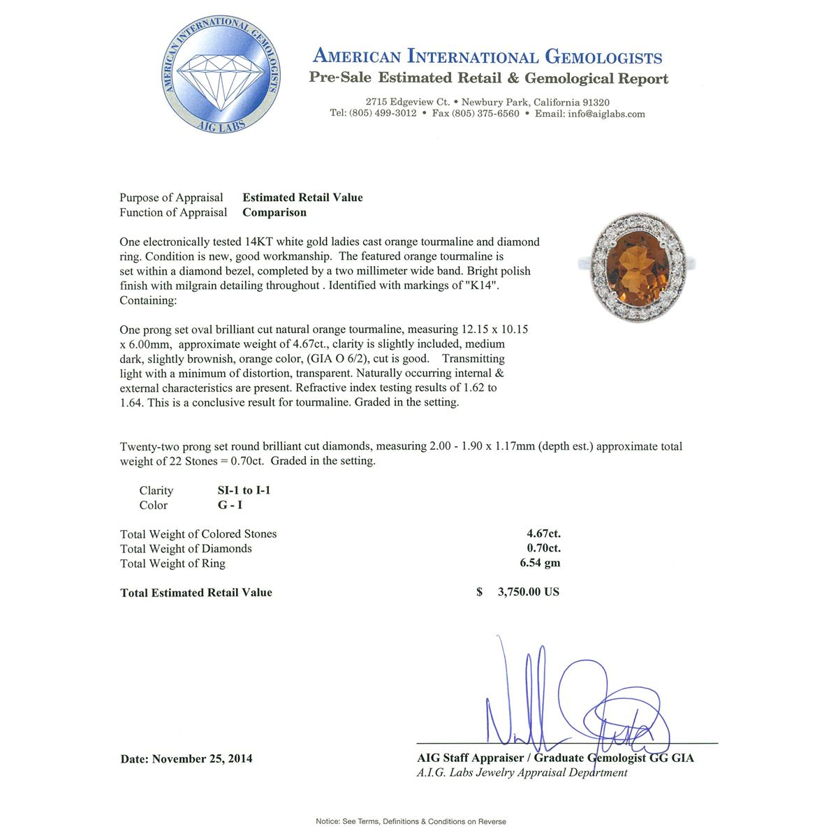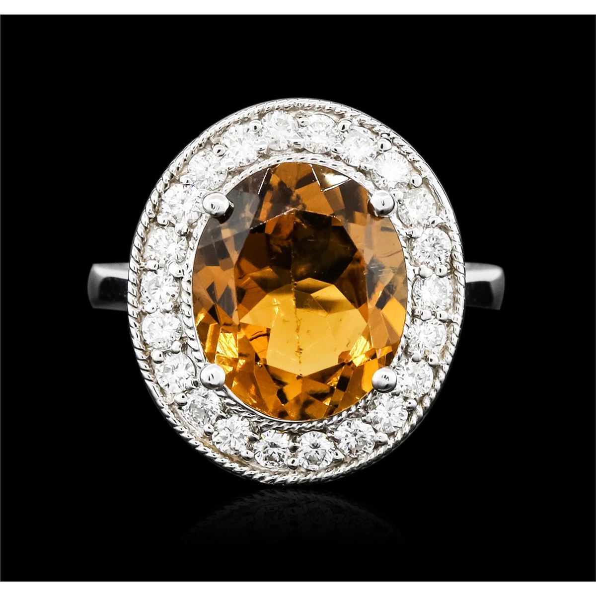 One electronically tested 14KT white gold ladies cast orange tourmaline and diamond ring. The featured orange tourmaline is set within a diamond bezel, completed by a two millimeter wide band. Bright polish finish with milgrain detailing throughout. Identified with markings of "K14". Condition is new, good workmanship. Containing: One prong set oval brilliant cut natural orange tourmaline, measuring 12.15 x 10.15 x 6.00mm, approximate weight of 4.67ct., clarity is slightly included, medium dark, slightly brownish, orange color, (GIA O 6/2), cut is good. Transmitting light with a minimum of distortion, transparent. Naturally occurring internal & external characteristics are present. Refractive index testing results of 1.62 to1.64. This is a conclusive result for tourmaline. Graded in the setting. Twenty-Two prong set round brilliant cut diamonds, measuring 2.00 - 1.90 x 1.17mm (depth est.) approximate total weight of 22 Stones = 0.70ct. Graded in the setting. Clarity: SI-1 to I-1. Color: G - I. Total Weight of Colored Stones 4.67ct. Total Weight of Diamonds 0.70ct. Total Weight of Ring 6.54 grams. AIG Appraised at $3,750.00.
