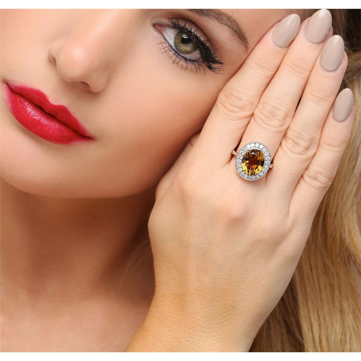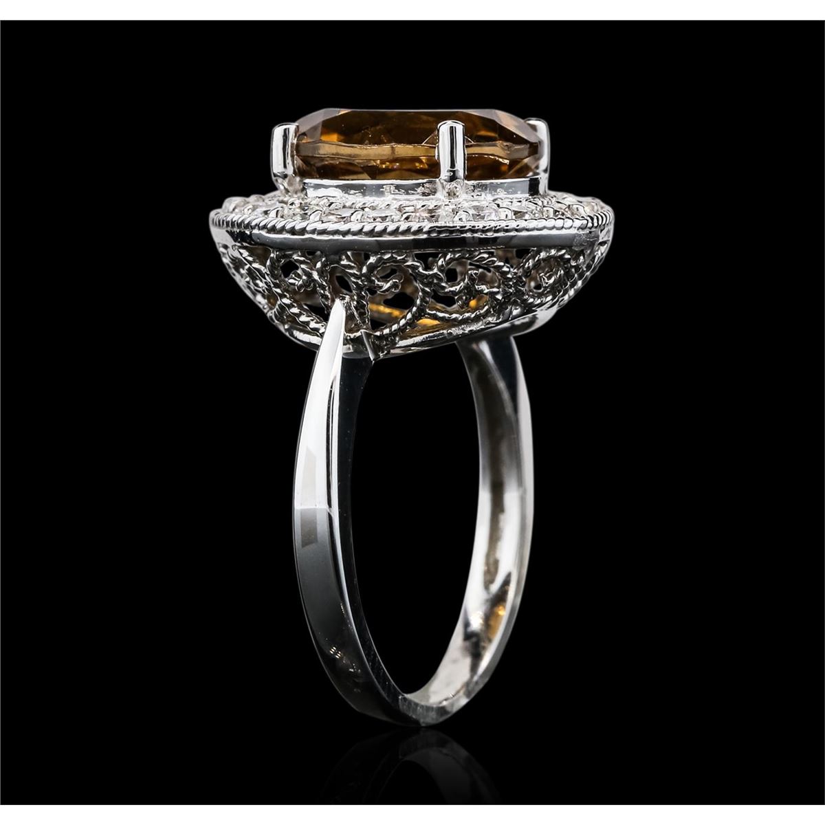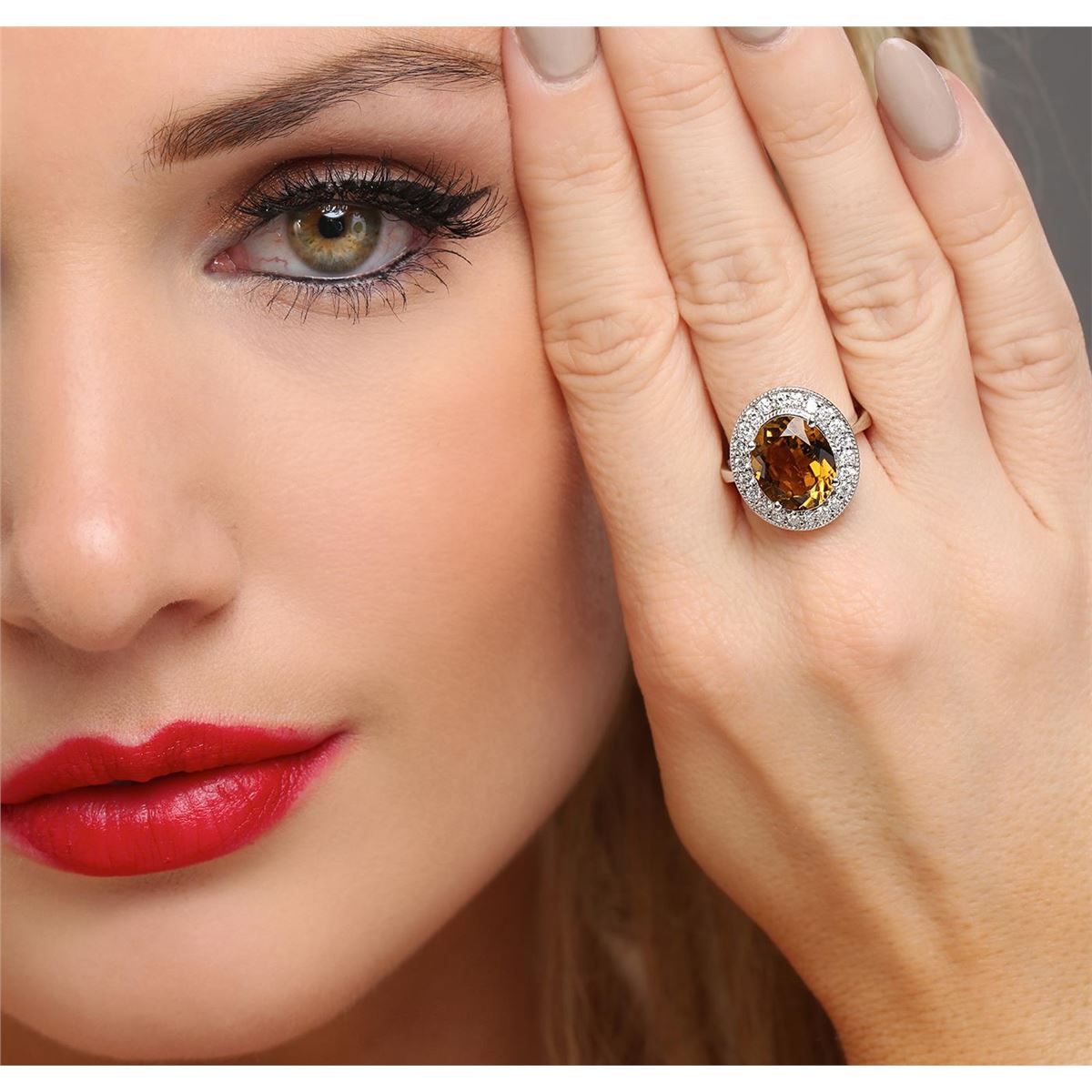 One electronically tested 14KT white gold ladies cast orange tourmaline and diamond ring. The featured orange tourmaline is set within a diamond bezel, completed by a two millimeter wide band. Bright polish finish with milgrain detailing throughout. Identified with markings of "K14". Condition is new, good workmanship. Containing: One prong set oval brilliant cut natural orange tourmaline, measuring 12.15 x 10.15 x 6.00mm, approximate weight of 4.67ct., clarity is slightly included, medium dark, slightly brownish, orange color, (GIA O 6/2), cut is good. Transmitting light with a minimum of distortion, transparent. Naturally occurring internal & external characteristics are present. Refractive index testing results of 1.62 to1.64. This is a conclusive result for tourmaline. Graded in the setting. Twenty-Two prong set round brilliant cut diamonds, measuring 2.00 - 1.90 x 1.17mm (depth est.) approximate total weight of 22 Stones = 0.70ct. Graded in the setting. Clarity: SI-1 to I-1. Color: G - I. Total Weight of Colored Stones 4.67ct. Total Weight of Diamonds 0.70ct. Total Weight of Ring 6.54 grams. AIG Appraised at $3,750.00.