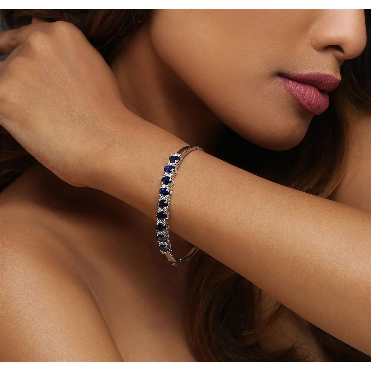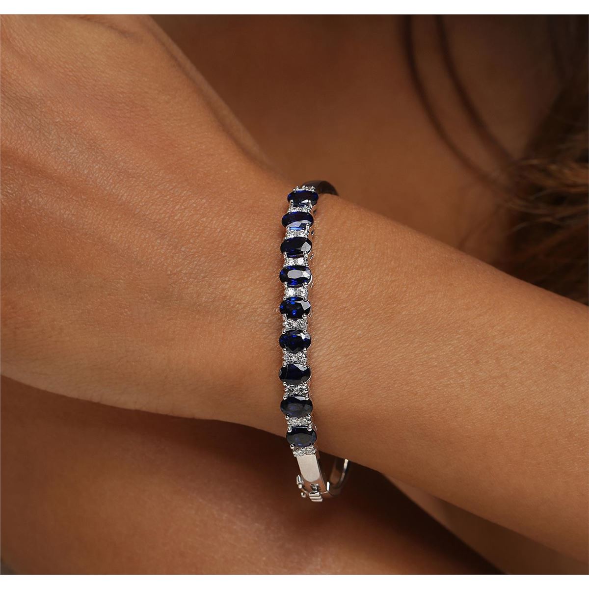 One electronically tested 14KT white gold ladies combination cast & assembled sapphire and diamond bangle bracelet with a hidden box clasp with a bright polish finish. Measurements: 2.5" x 2.0". Identified with markings of "K14". Condition is new. Containing: Nine prong set oval modified brilliant cut natural blue sapphires, measuring 5.98 x 4.28 x 2.47mm, approximate total weight of 4.68ct., clarity is eye clean, type II, medium, moderately strong, blue color, (GIA B 5/4), cut is good. Twenty prong set round brilliant cut diamonds, measuring 1.80 - 1.80 x 1.08mm (depth est.) approximate total weight of 20 Stones = 0.43ct. Clarity: SI-1 to SI-2. Color: I - J, Cut is Good. Colored gemstones are presumed to have been subjected to commonly used enhancement processes. All diamonds and colored gemstones are graded in the mounting, unless otherwise stated. Total Weight of Colored Stones 4.68ct. Total Weight of Diamonds 0.43ct. Total Weight of Bangle Bracelet 17.10 grams. GGL Appraised at $8,505.00.