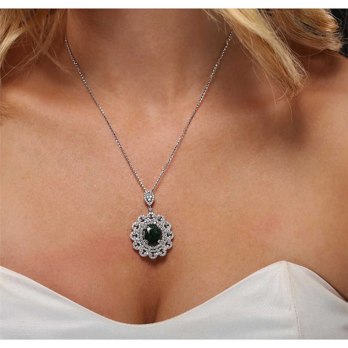 One electronically tested 14KT white gold Ladies combination cast & die struck pendant & chain 18.0" long, medium open cable link with a lobster claw clasp with a bright polish finish. Identified with markings of "14K". Condition is excellent. Containing: One prong set oval modified brilliant cut natural emerald, measuring 13.20 x 10.20 x 5.50mm, approximate weight of 4.68ct., clarity is heavily included, type III, dark, moderately strong, green color, (GIA G 7/4), cut is fair. Colored gemstones are presumed to have been subjected to commonly used and possible undetectable color/clarity enhancement processes. Two Hundred Two prong set round brilliant cut diamonds, measuring 1.80 - 1.30 x 0.93mm (depth est.) approximate total weight of 202 Stones = 2.41ct. Clarity of I-1 to I-3, Color of H - I, Cut is Fair. Total Weight of Colored Stones 4.68ct. Total Weight of Diamonds 2.41ct. Total Weight of Pendant & Chain 11.40gm. GGL Appraised at $15,935.00.