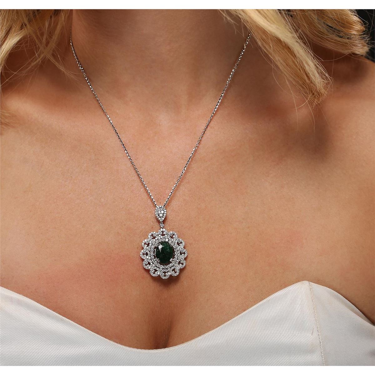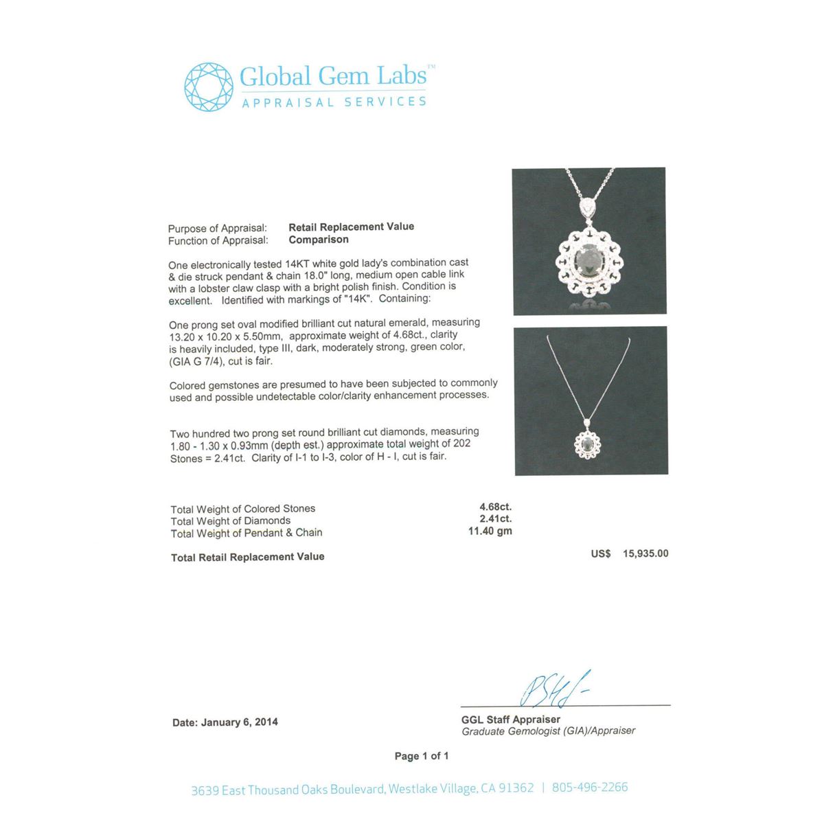 One electronically tested 14KT white gold Ladies combination cast & die struck pendant & chain 18.0" long, medium open cable link with a lobster claw clasp with a bright polish finish. Identified with markings of "14K". Condition is excellent. Containing: One prong set oval modified brilliant cut natural emerald, measuring 13.20 x 10.20 x 5.50mm, approximate weight of 4.68ct., clarity is heavily included, type III, dark, moderately strong, green color, (GIA G 7/4), cut is fair. Colored gemstones are presumed to have been subjected to commonly used and possible undetectable color/clarity enhancement processes. Two Hundred Two prong set round brilliant cut diamonds, measuring 1.80 - 1.30 x 0.93mm (depth est.) approximate total weight of 202 Stones = 2.41ct. Clarity of I-1 to I-3, Color of H - I, Cut is Fair. Total Weight of Colored Stones 4.68ct. Total Weight of Diamonds 2.41ct. Total Weight of Pendant & Chain 11.40gm. GGL Appraised at $15,935.00.