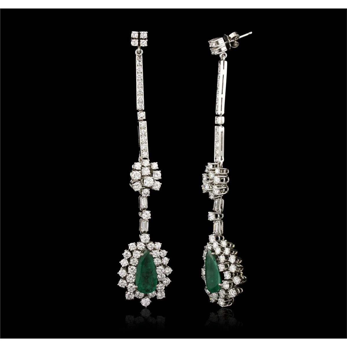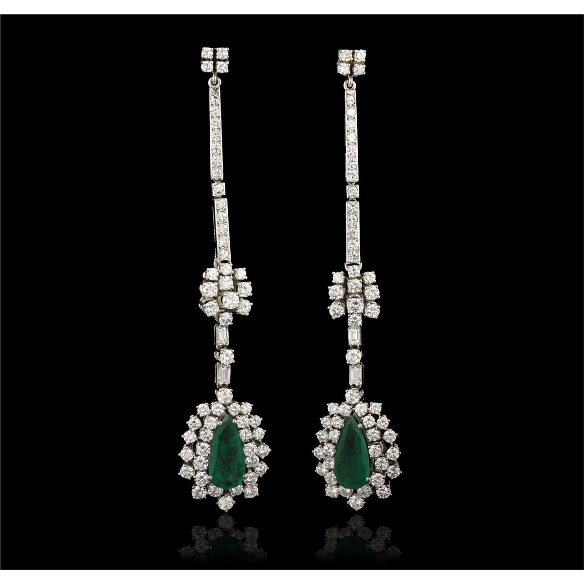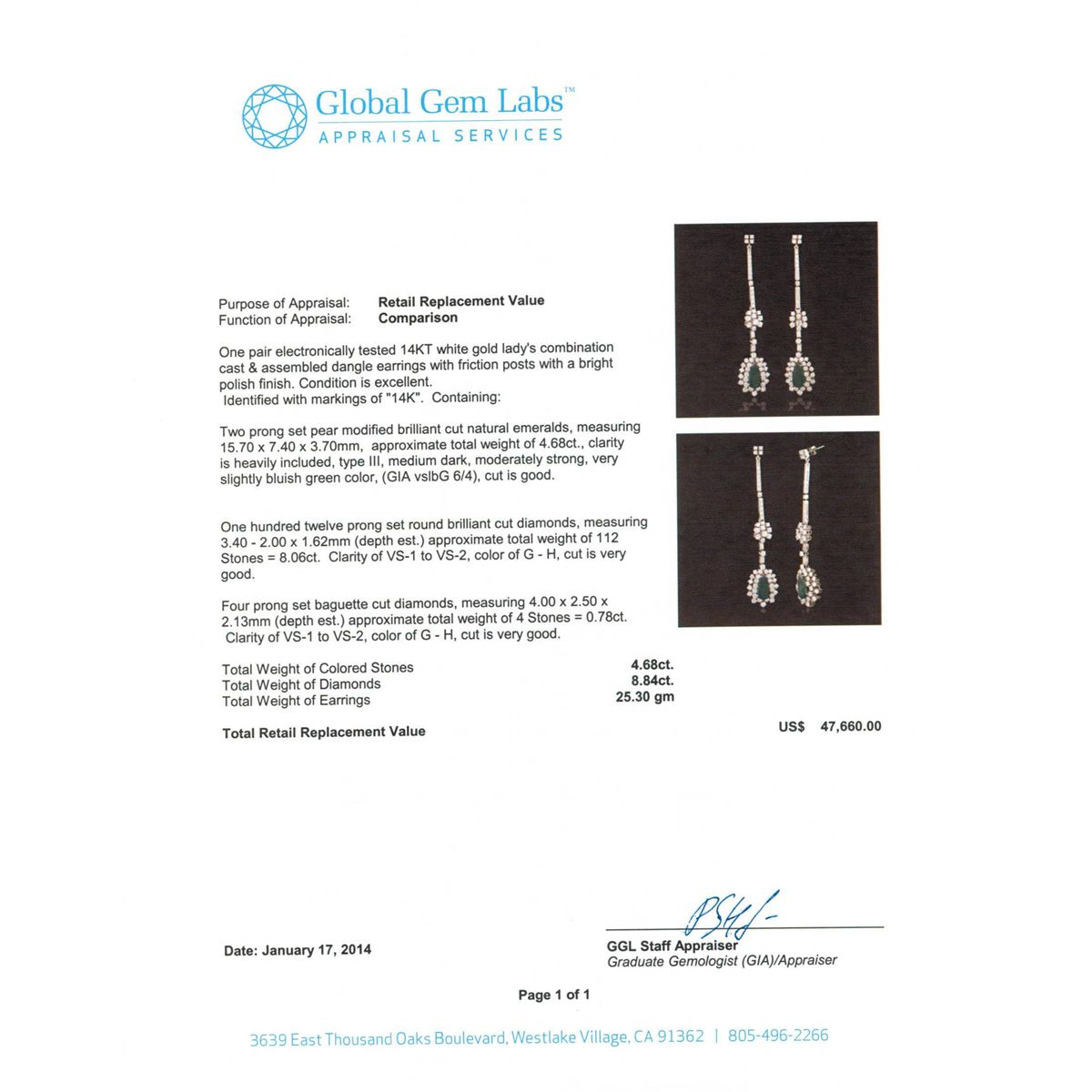 One pair electronically tested 14KT white gold Ladies combination cast & assembled dangle earrings with a bright polish finish. Identified with markings of "14K". Condition is excellent. Containing: Two prong set pear modified brilliant cut natural emeralds, measuring 15.70 x 7.40 x 3.70mm, approximate total weight of 4.68ct., clarity is heavily included, type III, medium dark, moderately strong, very slightly bluish green color, (GIA vslbG 6/4), cut is good. One Hundred Twelve prong set round brilliant cut diamonds, measuring 3.40 - 2.00 x 1.62mm (depth est.) approximate total weight of 112 Stones = 8.06ct. Clarity of VS-1 to VS-2, Color of G - H, Cut is Very Good. Four prong set baguette cut diamonds, measuring 4.00 x 2.50 x 2.13mm (depth est.) approximate total weight of 4 Stones = 0.78ct. Clarity of VS-1 to VS-2, Color of G - H, Cut is Very Good. Total Weight of Colored Stones 4.68ct. Total Weight of Diamonds 8.84ct. Total Weight of earrings 25.30gm. GGL Appraised at $47,660.00.