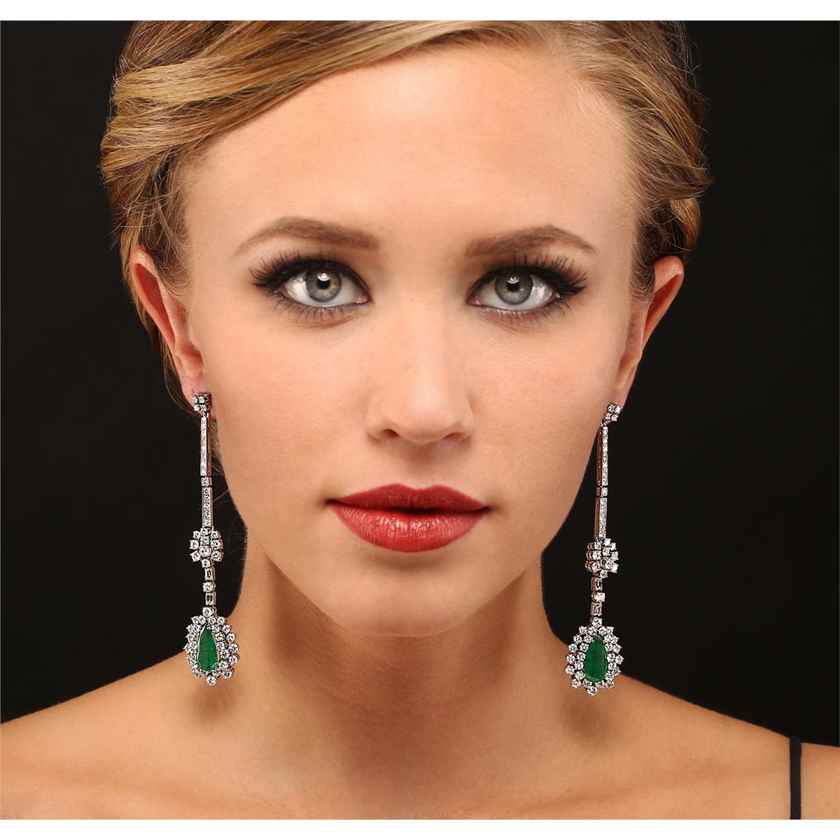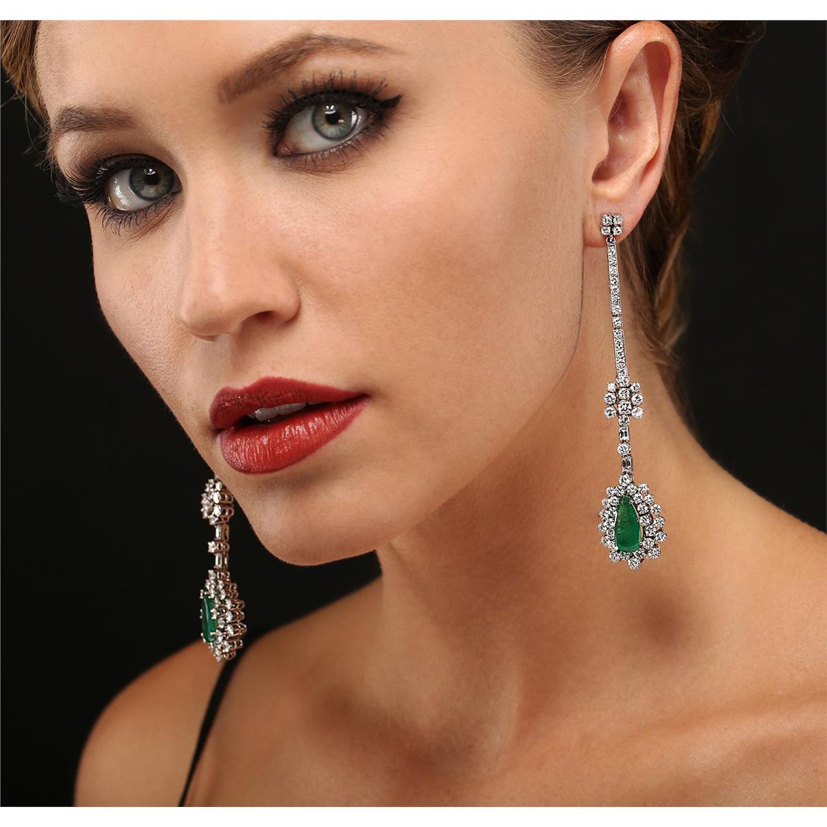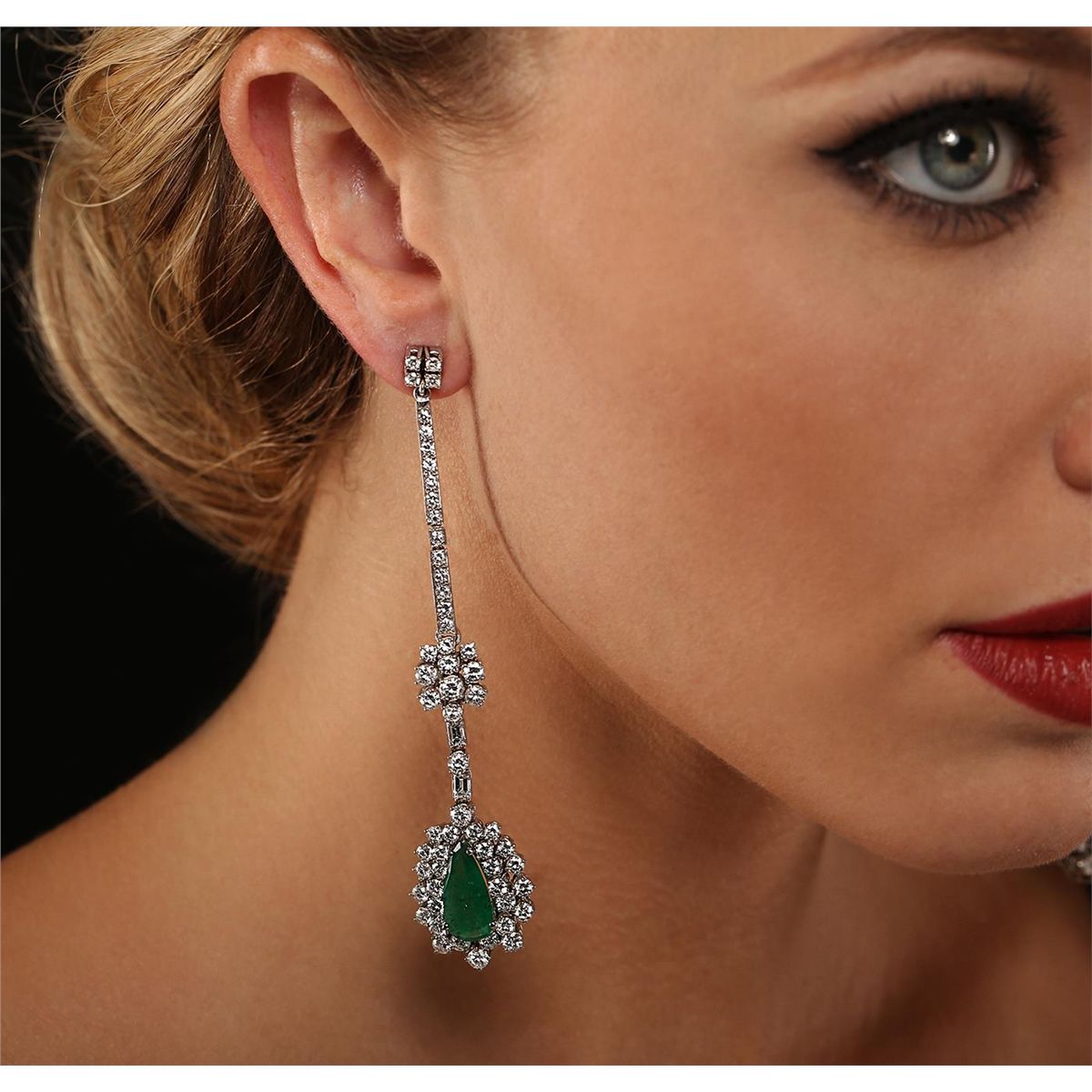 One pair electronically tested 14KT white gold Ladies combination cast & assembled dangle earrings with a bright polish finish. Identified with markings of "14K". Condition is excellent. Containing: Two prong set pear modified brilliant cut natural emeralds, measuring 15.70 x 7.40 x 3.70mm, approximate total weight of 4.68ct., clarity is heavily included, type III, medium dark, moderately strong, very slightly bluish green color, (GIA vslbG 6/4), cut is good. One Hundred Twelve prong set round brilliant cut diamonds, measuring 3.40 - 2.00 x 1.62mm (depth est.) approximate total weight of 112 Stones = 8.06ct. Clarity of VS-1 to VS-2, Color of G - H, Cut is Very Good. Four prong set baguette cut diamonds, measuring 4.00 x 2.50 x 2.13mm (depth est.) approximate total weight of 4 Stones = 0.78ct. Clarity of VS-1 to VS-2, Color of G - H, Cut is Very Good. Total Weight of Colored Stones 4.68ct. Total Weight of Diamonds 8.84ct. Total Weight of earrings 25.30gm. GGL Appraised at $47,660.00.