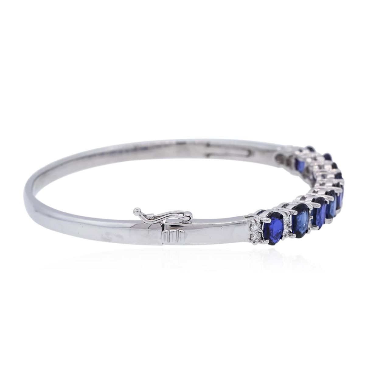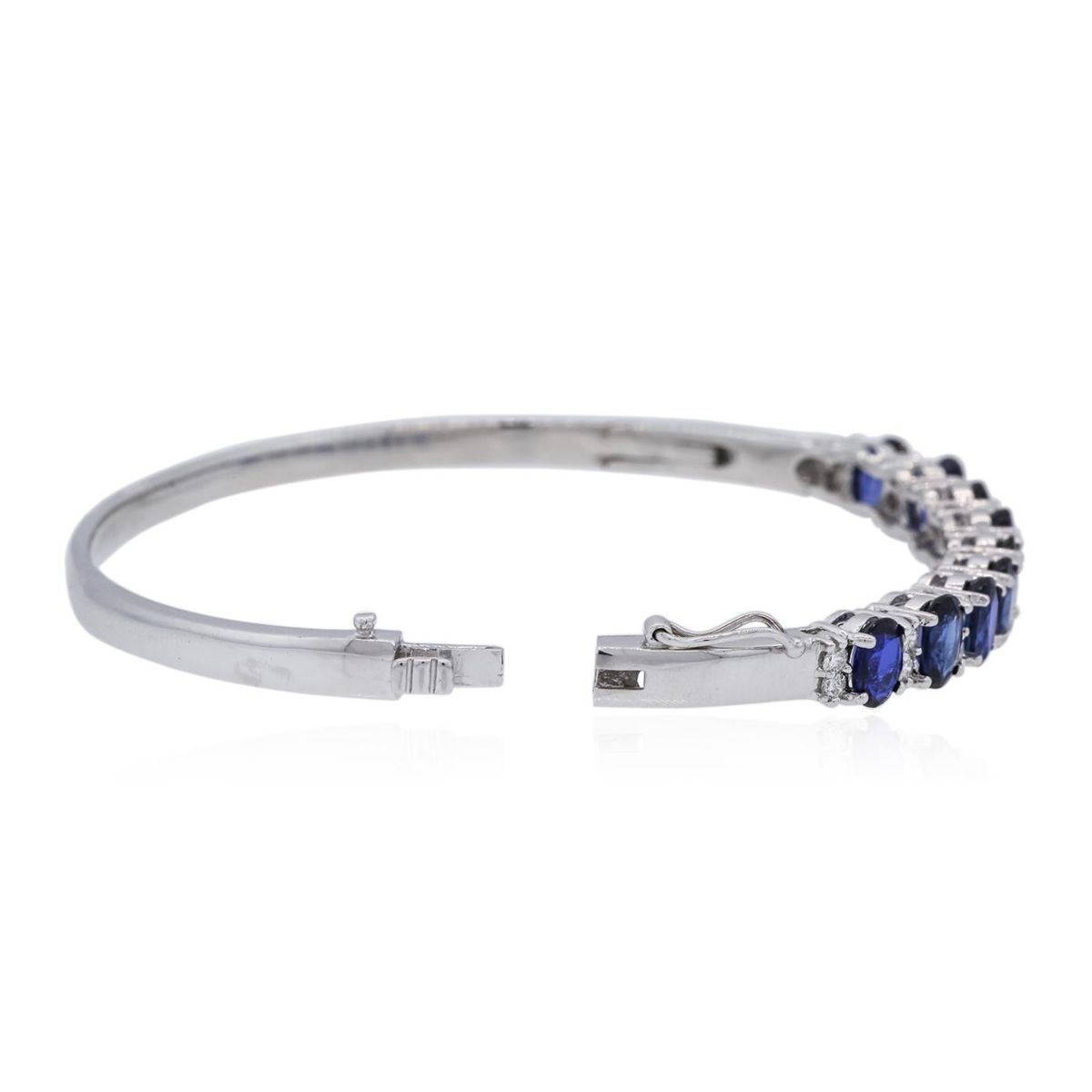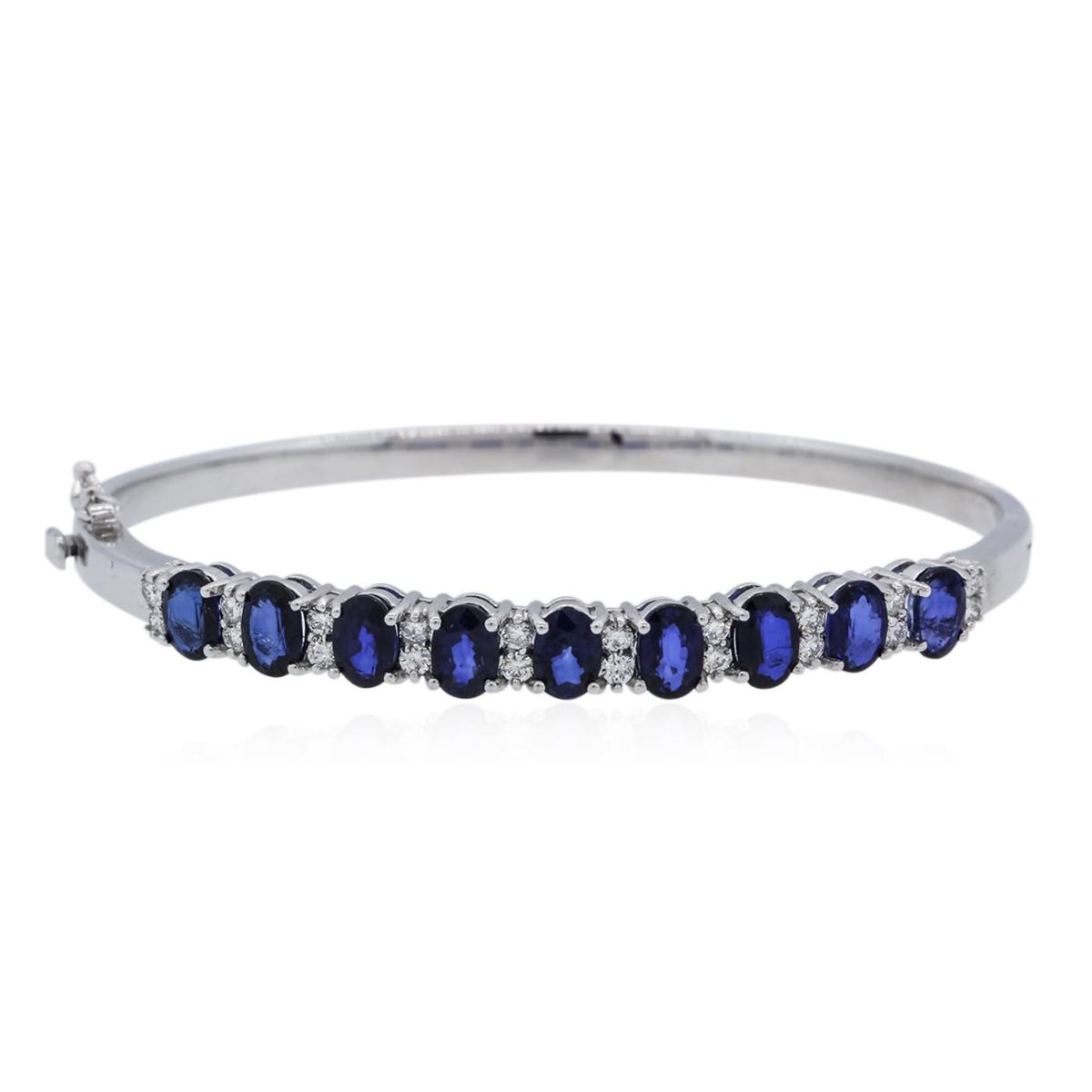 One electronically tested 14KT white gold ladies combination cast & assembled sapphire and diamond bangle bracelet with a hidden box clasp with a bright polish finish. Measurements: 2.5" x 2.0". Identified with markings of "K14". Condition is new. Containing: Nine prong set oval modified brilliant cut natural blue sapphires, measuring 5.98 x 4.28 x 2.47mm, approximate total weight of 4.68ct., clarity is eye clean, type II, medium, moderately strong, blue color, (GIA B 5/4), cut is good. Twenty prong set round brilliant cut diamonds, measuring 1.80 - 1.80 x 1.08mm (depth est.) approximate total weight of 20 Stones = 0.43ct. Clarity: SI-1 to SI-2. Color: I - J, Cut is Good. Colored gemstones are presumed to have been subjected to commonly used enhancement processes. All diamonds and colored gemstones are graded in the mounting, unless otherwise stated. Total Weight of Colored Stones 4.68ct. Total Weight of Diamonds 0.43ct. Total Weight of Bangle Bracelet 17.10 grams. GGL Appraised at $8,505.00.