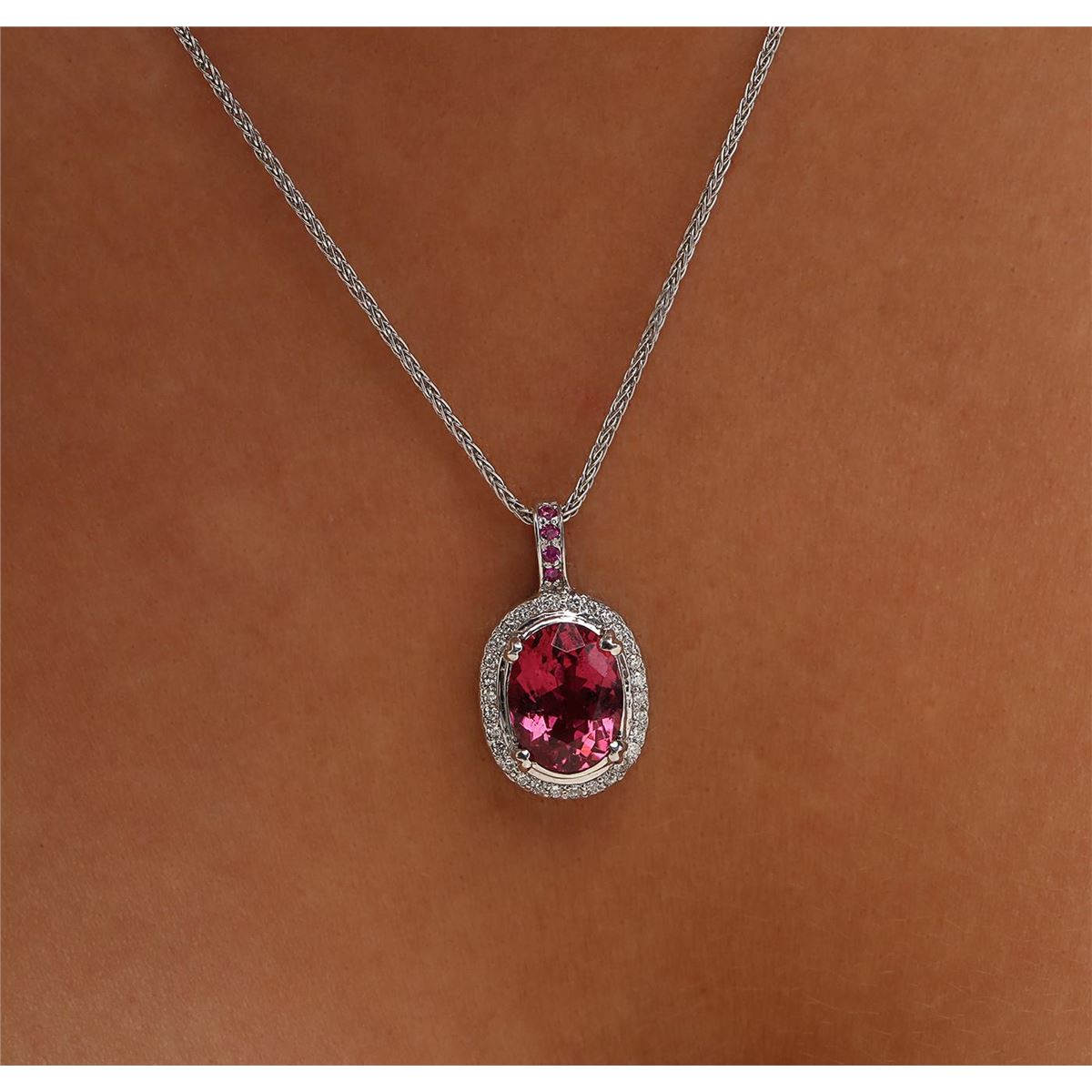 One electronically tested 14KT white gold ladies combination cast & assembled tourmaline and diamond pendant & chain 18.0" long, braided design wheat link with a lobster claw clasp with a bright polish finish. Identified with markings of "14k". Condition is new. Containing: One prong set oval modified brilliant cut natural pink tourmaline, measuring 12.20 x 9.60 x 6.24mm, approximate weight of 4.70ct., clarity is eye clean, type II, medium, moderately strong, reddish purple color, (GIA rP 5/4), cut is good. Four prong set round modified brilliant cut natural rubies, measuring 1.50 - 1.50 x 0.98 mm, approximate total weight of 0.08ct., clarity is moderately included, medium, moderately strong, red color, (GIA R 5/4), cut is good. Thirty prong set round brilliant cut diamonds, measuring 1.30 - 1.30 x 0.78mm (depth est.) approximate total weight of 30 Stones = 0.24ct. Clarity: SI-2. Color: I - J, Cut is Good. All diamonds and colored gemstones are graded in the mounting, unless otherwise stated. Colored gemstones are presumed to have been subjected to commonly used enhancement processes. Total Weight of Colored Stones 4.78ct. Total Weight of Diamonds 0.24ct. Total Weight of Pendant & Chain 7.90 grams. GGL Appraised at $7,005.00.