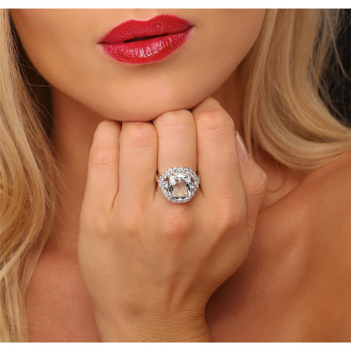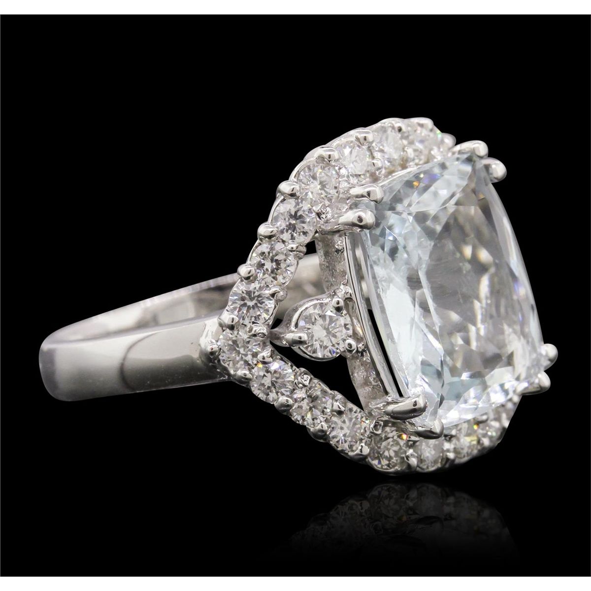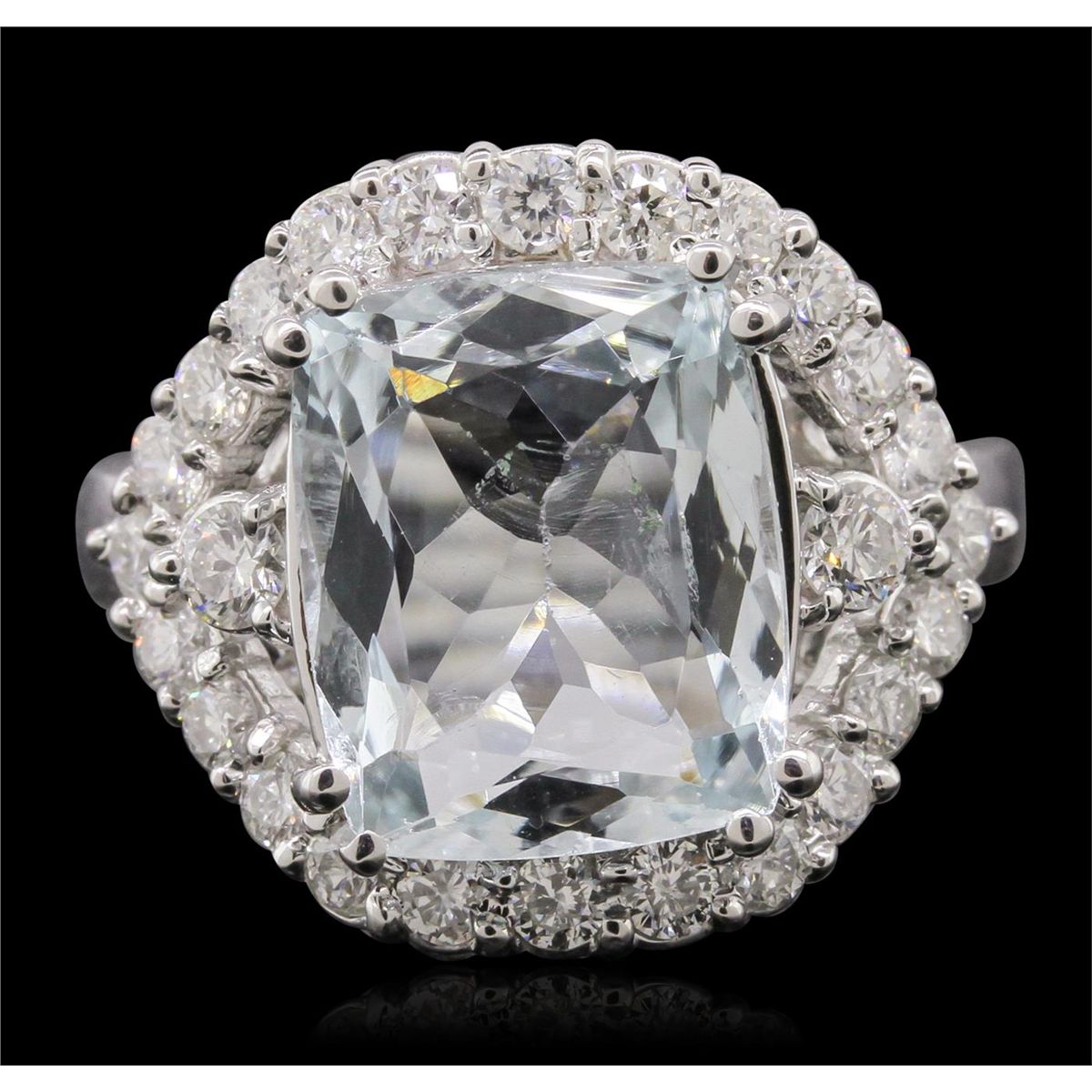 One electronically tested 14KT white gold ladies cast aquamarine and diamond ring with a bright polish finish. Condition is new, good workmanship. The featured aquamarine is set within a stylized diamond bezel supported by tapering shoulders, completed by a two and one-half millimeter wide band. Identified with markings of "K14". Containing: One prong set rectangular cushion mixed cut natural aquamarine, measuring 12.25 x 10.00 x 5.25mm, 10%. bulge factor, approximate weight of 4.70ct., clarity is slightly included, type I, medium light, very slightly grayish, very slightly greenish blue color, (GIA vslgB 4/3), cut is good. Transmitting light with a minimum of distortion, transparent. Naturally occurring internal & external characteristics are present. Graded in the setting. Twenty-Six prong set round brilliant cut diamonds, measuring 2.70 - 2.10 x 1.44mm (depth est.) approximate. Total Weight of 26 Stones = 1.05ct. Graded in the setting. Clarity: SI-1 to I-1. Color: G - I. Total Weight of Colored Stones 4.70ct. Total Weight of Diamonds 1.05ct. Total Weight of Ring 7.54 grams. AIG Appraised at $6,960.00.