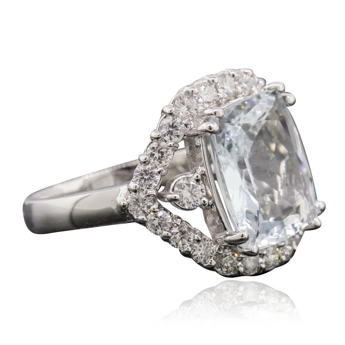One electronically tested 14KT white gold ladies cast aquamarine and diamond ring with a bright polish finish. Condition is new, good workmanship. The featured aquamarine is set within a stylized diamond bezel supported by tapering shoulders, completed by a two and one-half millimeter wide band. Identified with markings of "K14". Containing: One prong set rectangular cushion mixed cut natural aquamarine, measuring 12.25 x 10.00 x 5.25mm, 10%. bulge factor, approximate weight of 4.70ct., clarity is slightly included, type I, medium light, very slightly grayish, very slightly greenish blue color, (GIA vslgB 4/3), cut is good. Transmitting light with a minimum of distortion, transparent. Naturally occurring internal & external characteristics are present. Graded in the setting. Twenty-Six prong set round brilliant cut diamonds, measuring 2.70 - 2.10 x 1.44mm (depth est.) approximate. Total Weight of 26 Stones = 1.05ct. Graded in the setting. Clarity: SI-1 to I-1. Color: G - I. Total Weight of Colored Stones 4.70ct. Total Weight of Diamonds 1.05ct. Total Weight of Ring 7.54 grams. AIG Appraised at $6,960.00.