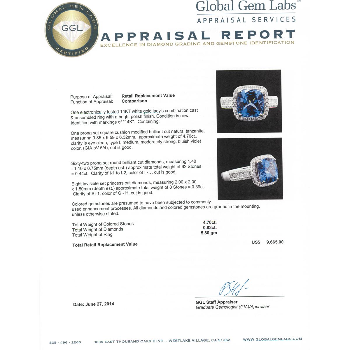 One electronically tested 14KT white gold Ladies combination cast & assembled ring with a bright polish finish. Condition is new. Identified with markings of "14K". Containing: One prong set square cushion modified brilliant cut natural tanzanite, measuring 9.85 x 9.59 x 6.32mm, approximate weight of 4.70ct., clarity is eye clean, type I, medium, moderately strong, bluish violet color, (GIA bV 5/4), cut is good. Sixty-Two prong set round brilliant cut diamonds, measuring 1.40 - 1.10 x 0.75mm (depth est.) approximate total weight of 62 Stones = 0.44ct. Clarity: I-1 to I-2. Color: I - J, Cut is Good. Eight invisible set princess cut diamonds, measuring 2.00 x 2.00 x 1.50mm (depth est.) approximate total weight of 8 Stones = 0.39ct. Clarity: SI-1. Color: G - H, Cut is Good. Colored gemstones are presumed to have been subjected to commonly used enhancement processes. All diamonds and colored gemstones are graded in the mounting, unless otherwise stated. Total Weight of Colored Stones 4.70ct. Total Weight of Diamonds 0.83ct. Total Weight of Ring 5.80 grams. GGL Appraised at $9,665.00.