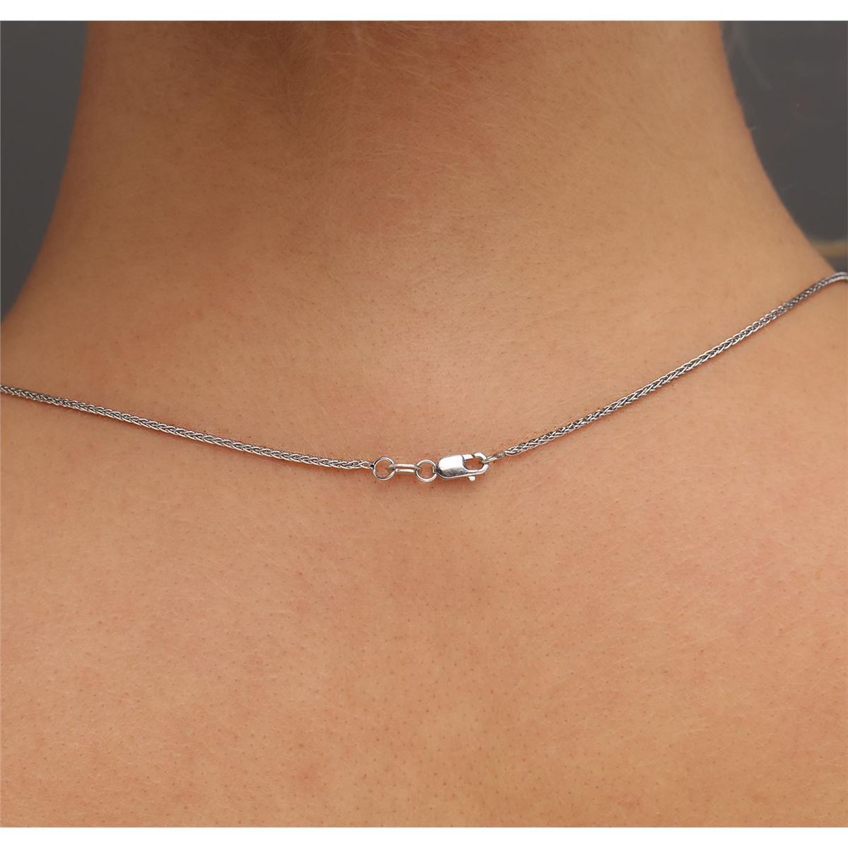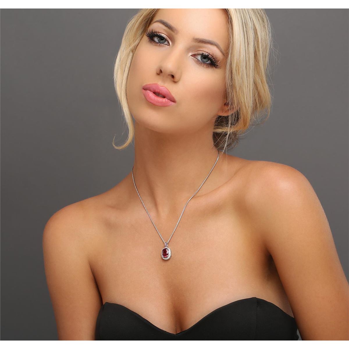 One electronically tested 14KT white gold ladies combination cast & assembled tourmaline and diamond pendant & chain 18.0" long, braided design wheat link with a lobster claw clasp with a bright polish finish. Identified with markings of "14k". Condition is new. Containing: One prong set oval modified brilliant cut natural pink tourmaline, measuring 12.20 x 9.60 x 6.24mm, approximate weight of 4.70ct., clarity is eye clean, type II, medium, moderately strong, reddish purple color, (GIA rP 5/4), cut is good. Four prong set round modified brilliant cut natural rubies, measuring 1.50 - 1.50 x 0.98 mm, approximate total weight of 0.08ct., clarity is moderately included, medium, moderately strong, red color, (GIA R 5/4), cut is good. Thirty prong set round brilliant cut diamonds, measuring 1.30 - 1.30 x 0.78mm (depth est.) approximate total weight of 30 Stones = 0.24ct. Clarity: SI-2. Color: I - J, Cut is Good. All diamonds and colored gemstones are graded in the mounting, unless otherwise stated. Colored gemstones are presumed to have been subjected to commonly used enhancement processes. Total Weight of Colored Stones 4.78ct. Total Weight of Diamonds 0.24ct. Total Weight of Pendant & Chain 7.90 grams. GGL Appraised at $7,005.00.