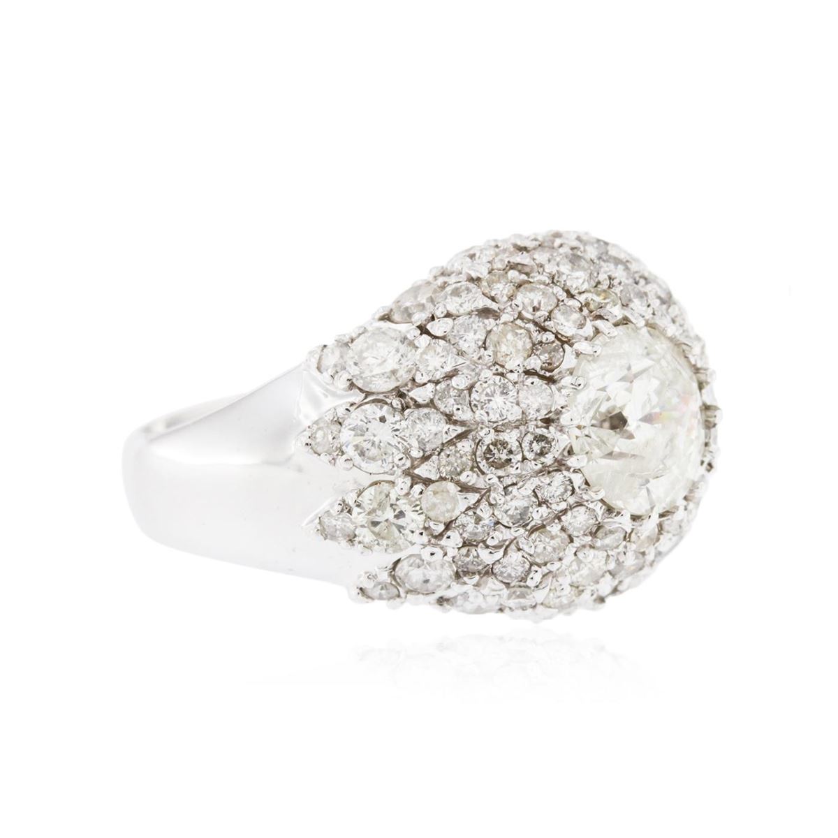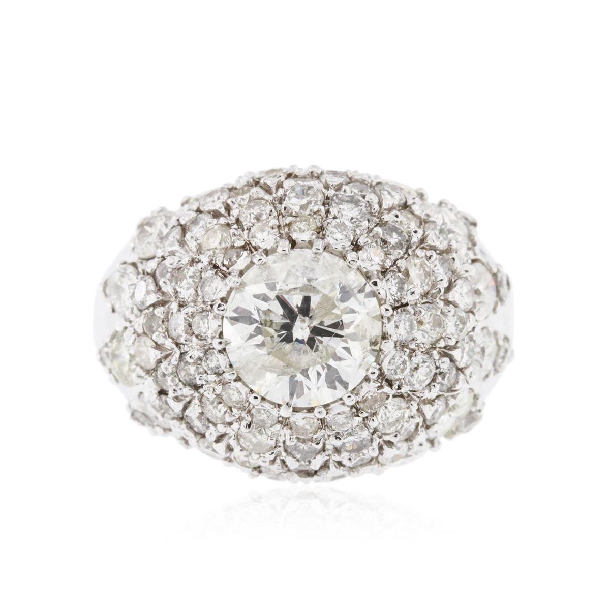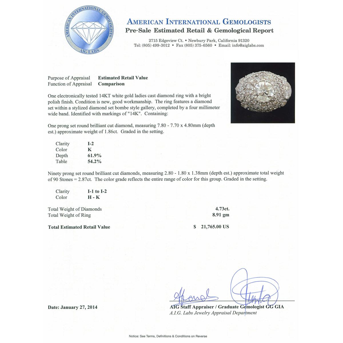 One electronically tested 14KT white gold ladies cast diamond ring with a bright polish finish. Condition is new, good workmanship. The ring features a diamond set within a stylized diamond set bombe style gallery, completed by a four millimeter wide band. Identified with markings of "14K". Containing: One prong set round brilliant cut diamond, measuring 7.80 - 7.70 x 4.80mm (depth est.) approximate weight of 1.86ct. Graded in the setting. Clarity I-2. Color K. Depth 61.9%. Table 54.2%. Ninety prong set round brilliant cut diamonds, measuring 2.80 - 1.80 x 1.38mm (depth est.) approximate total weight of 90 Stones = 2.87ct. The color grade reflects the entire range of color for this group. Graded in the setting. Clarity I-1 to I-2. Color H - K. Total Weight of Diamonds 4.73ct. Total Weight of Ring 8.91 grams. AIG Appraised at $21,765.00.