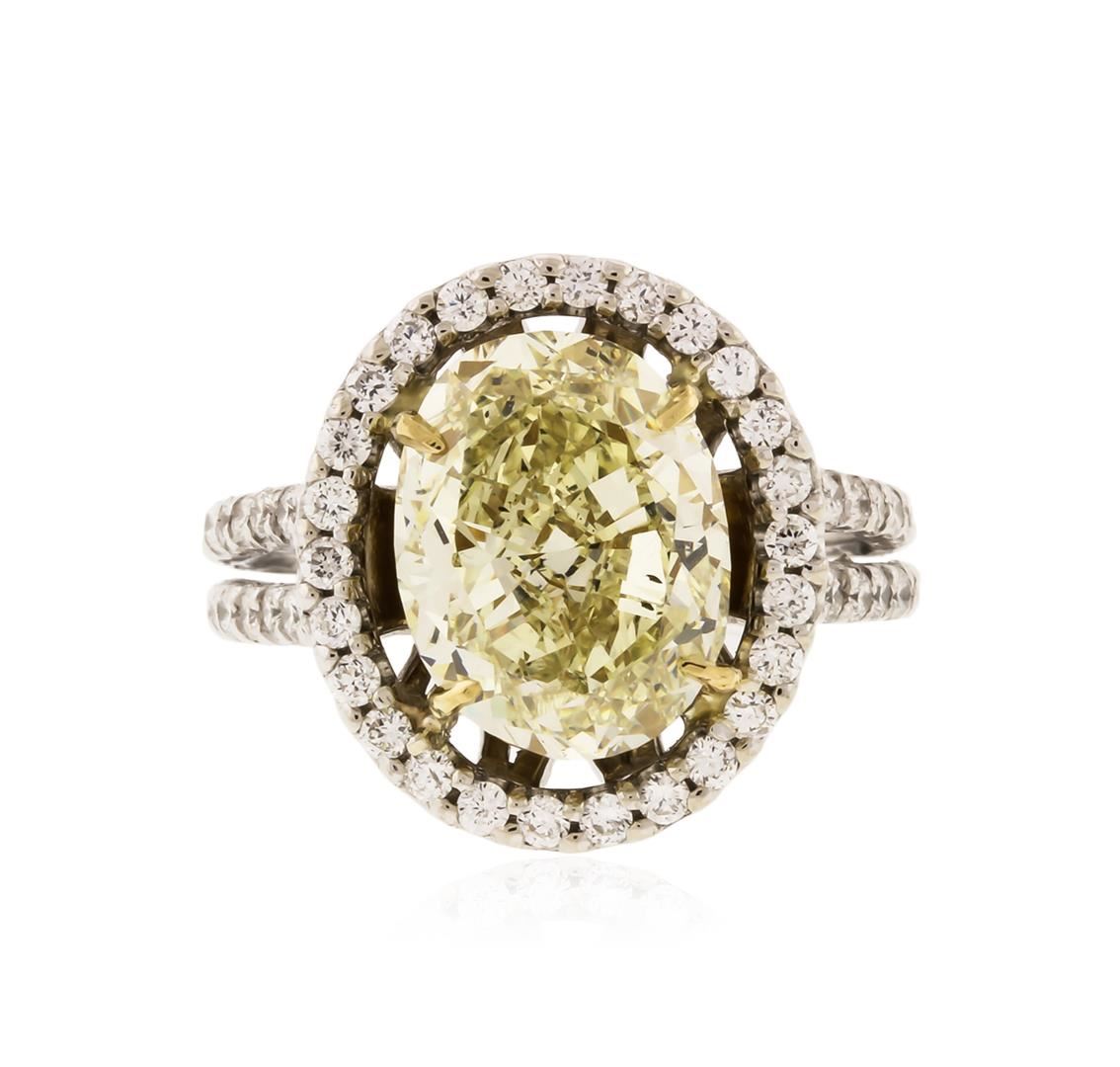 One electronically tested 14KT white gold ladies cast diamond ring with a bright polish finish. The featured diamond is set within an inner yellow gold basket and an outer diamond bezel supported by diamond set split shoulders, completed by a grooved two and one-half millimeter wide band. Identified with markings of "14K". Condition is good. Containing: One prong set oval shaped cut diamond, measuring 11.80 x 9.10 x 5.00mm (depth est.), 10.00.%. GTCF approximate weight of 3.74ct with a medium strong blue fluorescence. Graded in the setting. Clarity: SI-1. Depth: 55.0%. Table 67.0%. Sixty-Six prong set round brilliant cut diamonds, measuring 1.60 - 1.50 x 0.93mm (depth est.) approximate total weight of 66 Stones = 1.00ct. Graded in the setting. Clarity: SI-1 to I-1. Color: G - I. Total Weight of Diamonds 4.74ct. Total Weight of Ring 7.95 grams. AIG Appraised at $60,680.00.