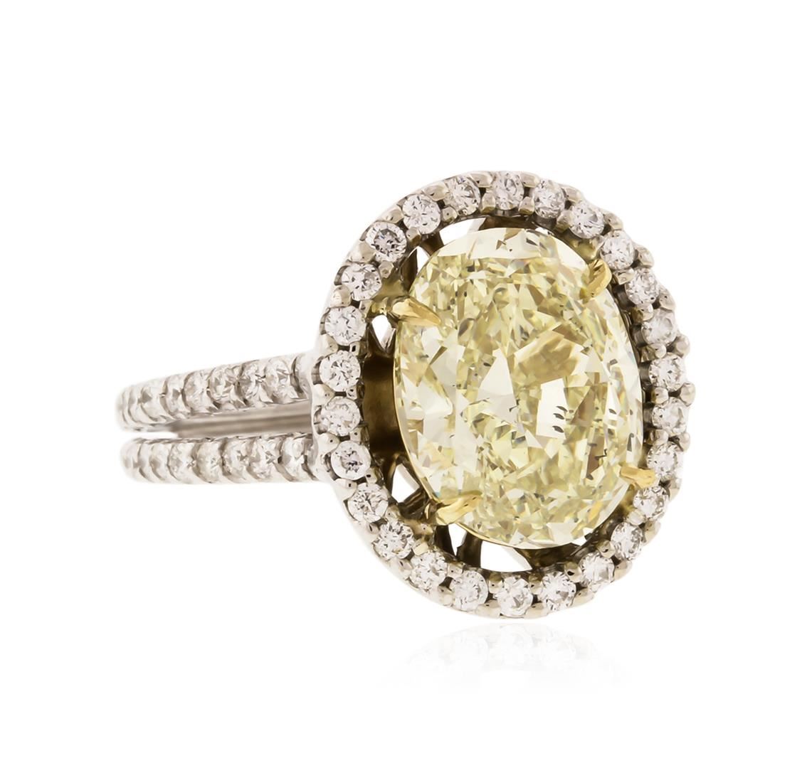 One electronically tested 14KT white gold ladies cast diamond ring with a bright polish finish. The featured diamond is set within an inner yellow gold basket and an outer diamond bezel supported by diamond set split shoulders, completed by a grooved two and one-half millimeter wide band. Identified with markings of "14K". Condition is good. Containing: One prong set oval shaped cut diamond, measuring 11.80 x 9.10 x 5.00mm (depth est.), 10.00.%. GTCF approximate weight of 3.74ct with a medium strong blue fluorescence. Graded in the setting. Clarity: SI-1. Depth: 55.0%. Table 67.0%. Sixty-Six prong set round brilliant cut diamonds, measuring 1.60 - 1.50 x 0.93mm (depth est.) approximate total weight of 66 Stones = 1.00ct. Graded in the setting. Clarity: SI-1 to I-1. Color: G - I. Total Weight of Diamonds 4.74ct. Total Weight of Ring 7.95 grams. AIG Appraised at $60,680.00.