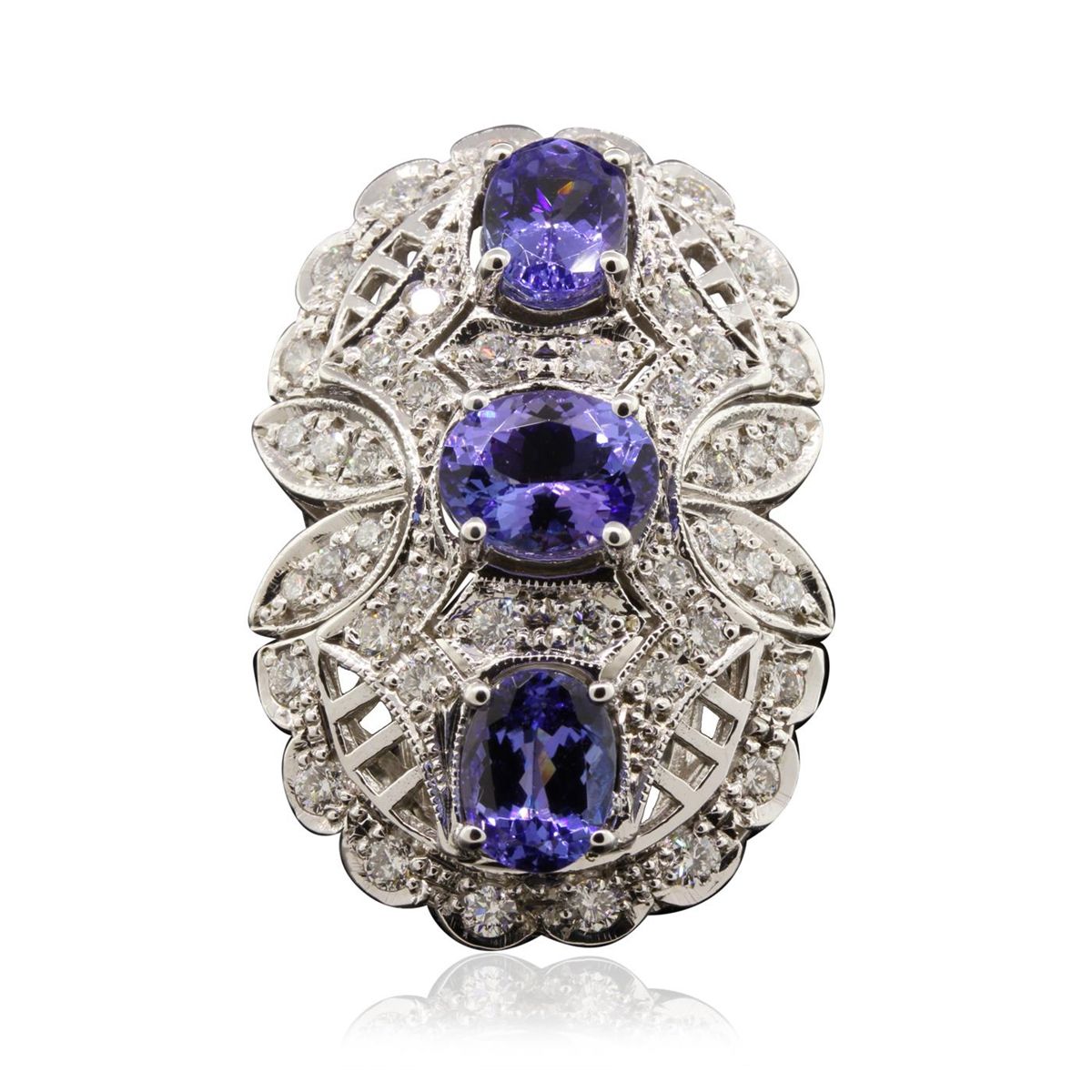 One electronically tested 14KT white gold Ladies combination cast & assembled fancy ring with a bright polish finish. Identified with markings of "14K". Condition is excellent. Containing:  Three prong set oval modified brilliant cut natural tanzanites, measuring 8.50 x 6.80 x 4.00mm, approximate total weight of 4.74ct., clarity is eye clean, type I, medium light, moderately strong, bluish violet color, (GIA bV 4/4), cut is very good. Colored gemstones are presumed to have been subjected to commonly used and possible undetectable color/clarity enhancement processes. Forty-Four bead set round brilliant cut diamonds, measuring 2.20 - 2.20 x 1.32mm (depth est.) approximate total weight of 44 Stones = 1.69ct. Clarity of SI-1 to SI-2, Color of I - J, Cut is Good. Total Weight of Colored Stones 4.74ct. Total Weight of Diamonds 1.69ct. Total Weight of Ring 13.60gm. GGL Appraised at $13,470.00.