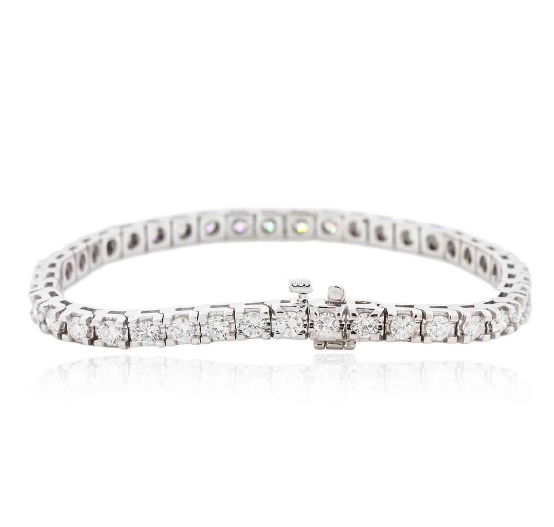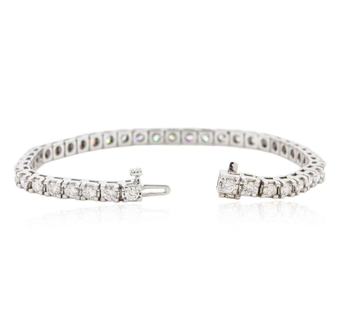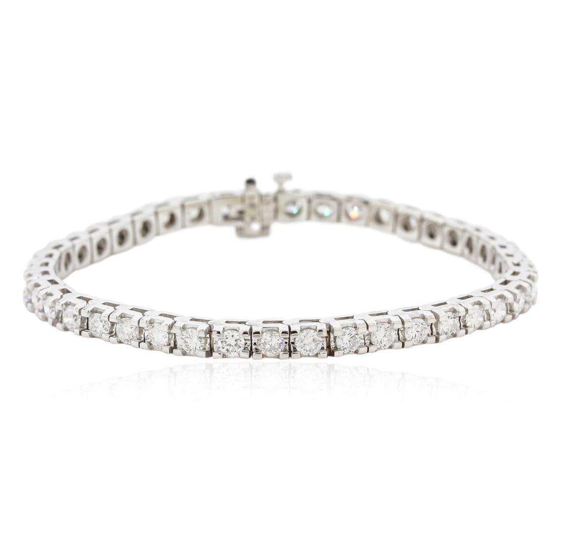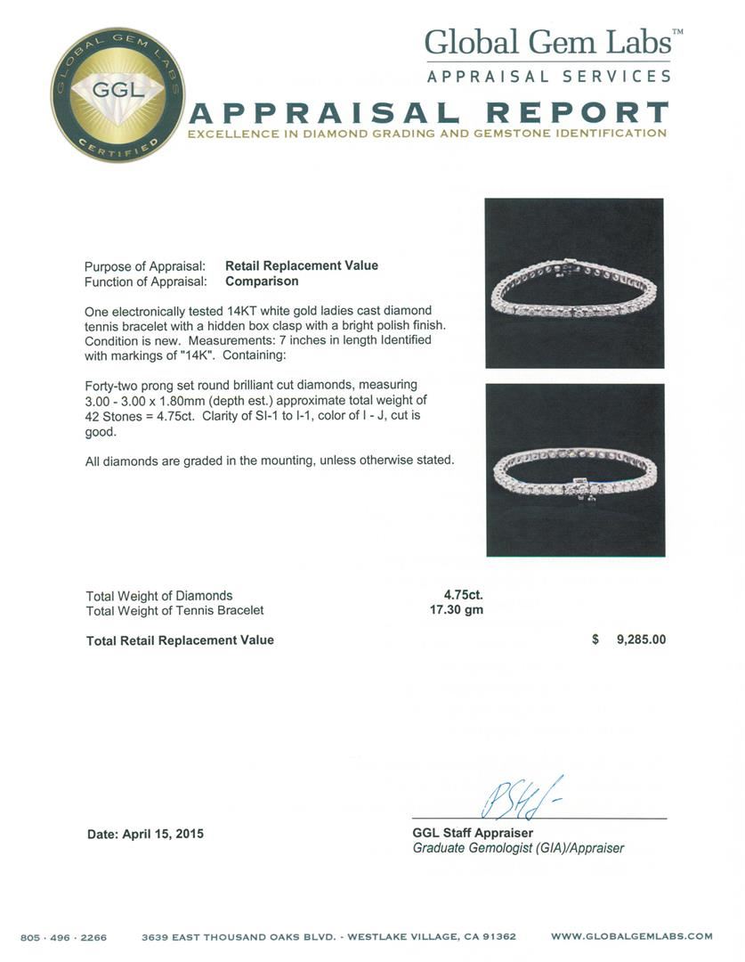 One electronically tested 14KT white gold ladies cast diamond tennis bracelet with a hidden box clasp with a bright polish finish. Measurements: 7 inches in length Identified with markings of "14K". Condition is new. Containing: Forty-Two prong set round brilliant cut diamonds, measuring 3.00. - 3.00. x 1.80mm (depth est.) approximate total weight of 42 Stones = 4.75ct. Clarity: SI-1 to I-1. Color: I - J, Cut is Good. All diamonds are graded in the mounting, unless otherwise stated. Total Weight of Diamonds 4.75ct. Total Weight of Tennis Bracelet 17.30 grams. GGL Appraised at $9,285.00.