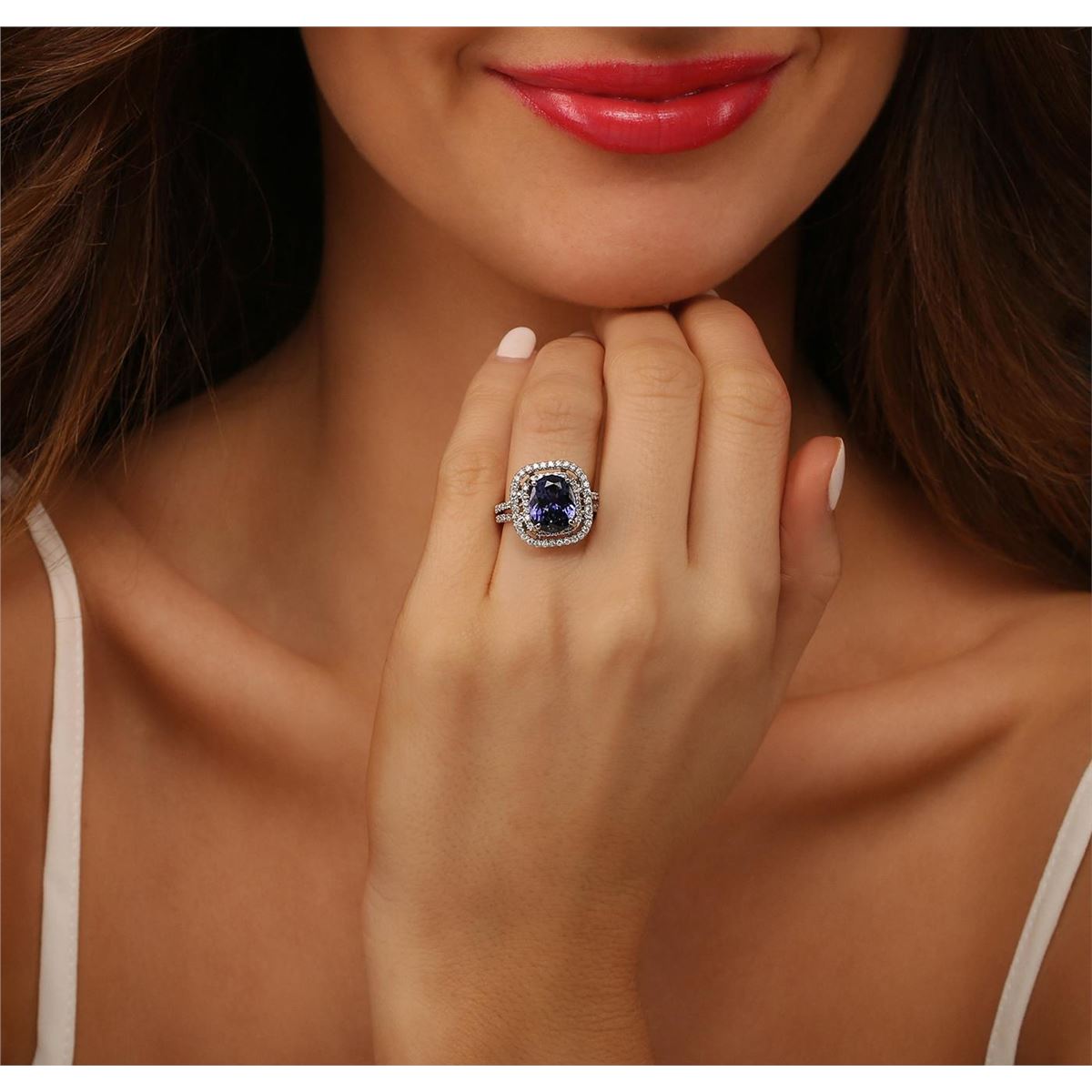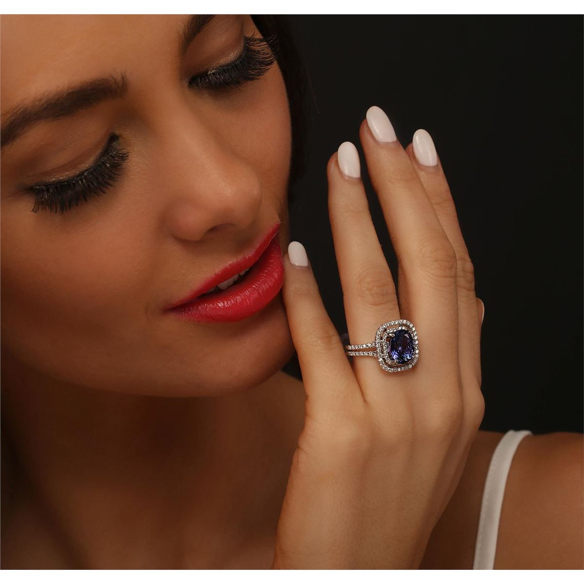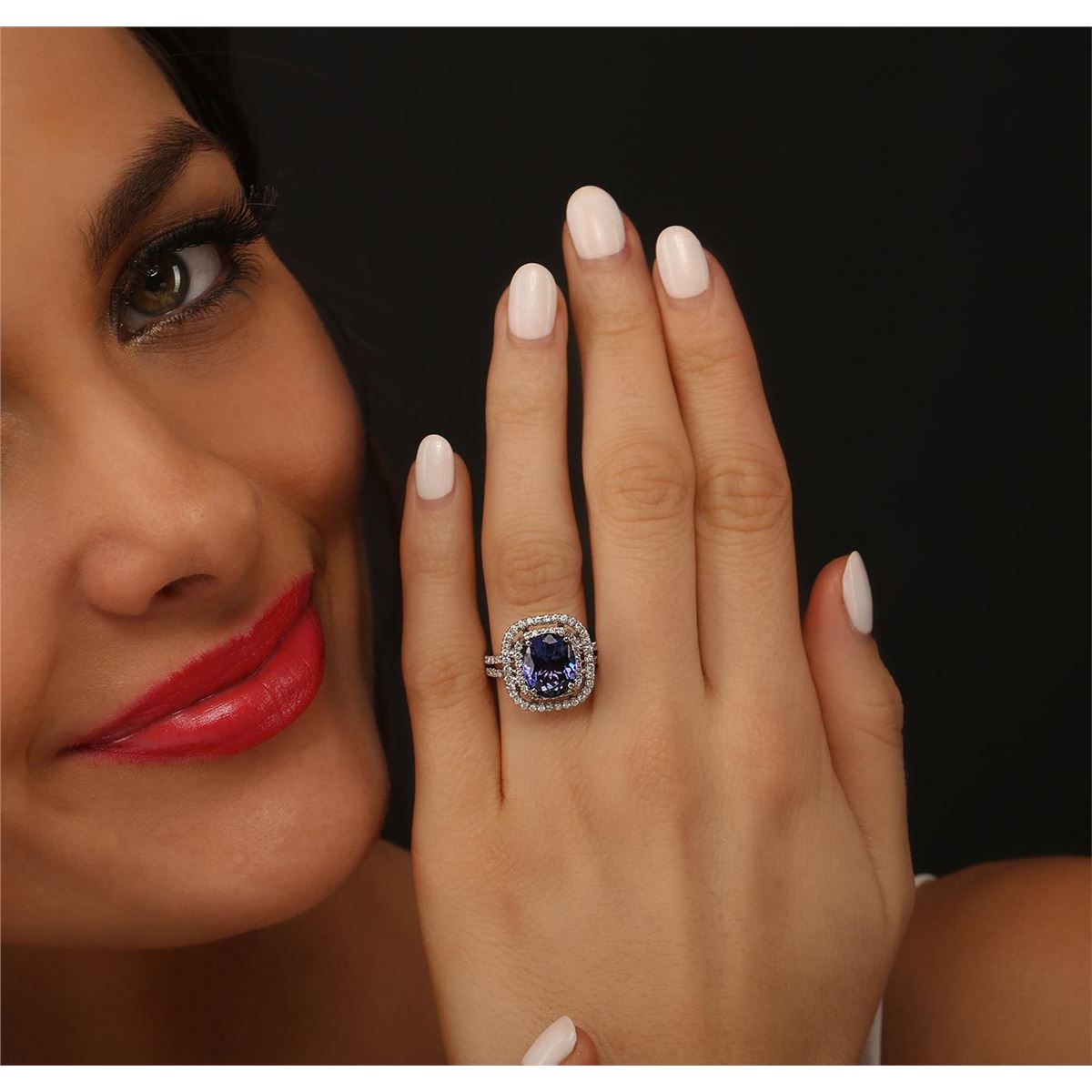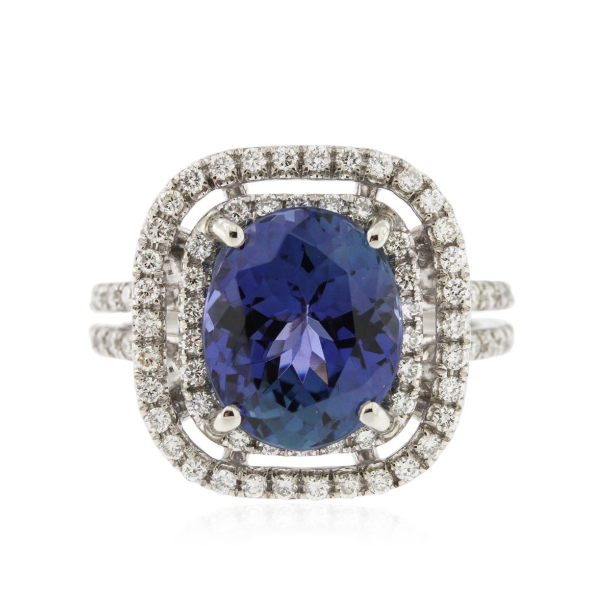One electronically tested 14KT white gold ladies cast tanzanite and diamond ring with a bright polish finish. Condition is new, good workmanship. The featured tanzanite is set within a two tiered diamond lattice gallery, supported by diamond set split shoulders and completed by a two and one-half millimeter wide band. Identified with markings of "14K". Containing: One prong set oval mixed cut natural tanzanite, measuring 10.80 x 8.90 x 6.80mm, 8% bulge factor, approximate weight of 4.77ct, clarity is eye clean, type I, medium dark, strong, bluish violet color, (GIA bV 6/5), cut is good. Transmitting light with no distortion, transparent. Graded in the setting. Tanzanite is a very rare gemstone that is only found in the country of Tanzania. Originally discovered in 1967. Tiffany & Company, named the stone Tanzanite. It is found in the Usumburu Mountains that border the Umba Valley of northern Tanzania. Tanzanite occurs in gray, brown, violet, blue, reddish-purple, & green. The gem is interesting because of its exceptional pleochroism. Rotated in different directions a tanzanite will exhibit multiple changes of color. Tanzanite has a low tolerance to ultrasonic cleaning, and should not be cleaned using this method. Fifty prong set round brilliant cut diamonds, measuring 1.20 - 1.10 x 0.69mm (depth est.) approximate total weight of 50 Stones = 0.37ct. Graded in the setting. Clarity VVS-2 to VS-2. Color G-I. Total Weight of Colored Stones 4.77ct. Total Weight of Diamonds 0.37ct. Total Weight of Ring 6.70 grams. AIG Appraised at $13,465.00.