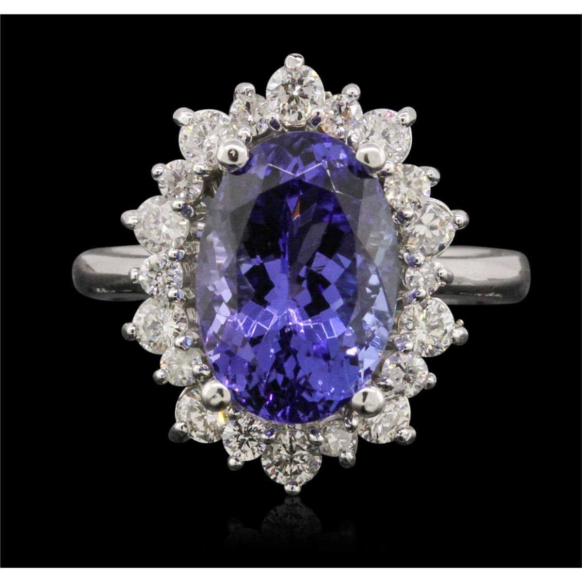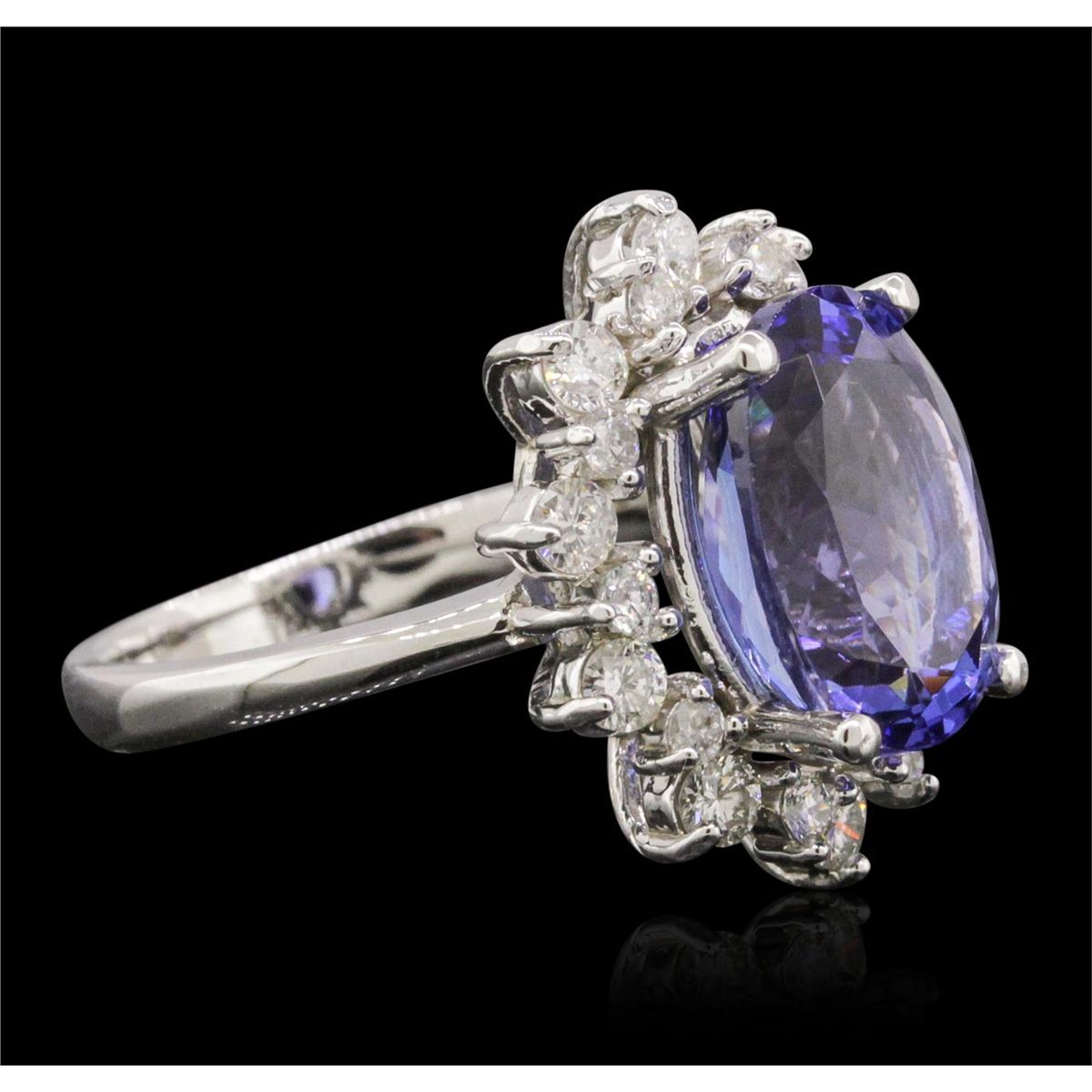 One electronically tested 14KT white gold ladies cast tanzanite and diamond ring with a bright polish finish. Condition is new, good workmanship. The featured tanzanite is set within a diamond bezel, completed by a two and one-half millimeter wide band. Identified with markings of "K14". Containing: One prong set oval brilliant cut natural tanzanite, measuring 11.85 x 8.20 x 6.70mm, 6%. bulge factor, approximate weight of 4.78ct., clarity is eye clean, type I, medium dark, very slightly grayish, bluish violet color, (GIA bV 6/3), cut is good. Transmitting light with no distortion, transparent. Graded in the setting.Tanzanite is a very rare gemstone that is only found in the country of Tanzania. Originally discovered in 1967. Tiffany & Company, named the stone Tanzanite. It is found in the Usumburu Mountains that border the Umba Valley of northern Tanzania. Tanzanite occurs in gray, brown, violet, blue, reddish-purple, & green. The gem is interesting because of its exceptional pleochroism. Rotated in different directions a tanzanite will exhibit multiple changes of color. Tanzanite has a low tolerance to ultrasonic cleaning, and should not be cleaned using this method. Ten prong set round brilliant cut diamonds, measuring 2.40 - 2.30 x 1.41mm (depth est.) approximate. Total Weight of 10 Stones = 0.57ct. Graded in the setting. Clarity: SI-2 to I-1. Color: G - I Ten prong set round brilliant cut diamonds, measuring 1.80 - 1.70 x 1.05mm (depth est.) approximate. Total Weight of 10 Stones = 0.29ct. Graded in the setting. Clarity: SI-2 to I-1. Color: G - I. Total Weight of Colored Stones 4.78ct. Total Weight of Diamonds 0.86ct. Total Weight of Ring 5.63gm. AIG Appraised at $15,410.00.